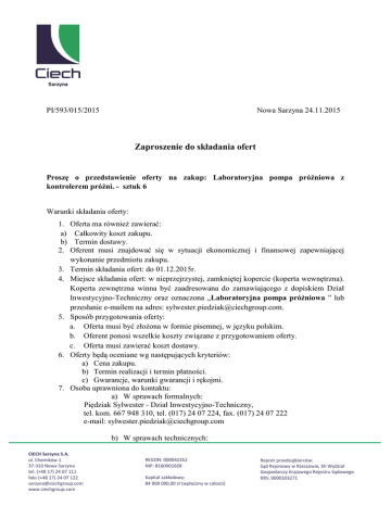 PI/593/015/2015 Nowa Sarzyna 24.11.2015 Zaproszenie do składania ofert Proszę o przedstawienie oferty na zakup: Laboratoryjna pompa próżniowa z kontrolerem próżni. - sztuk 6 Warunki składania oferty: 1. a) b) 2. 3. 4. 5. 6. 7. Oferta ma również zawierać: Całkowity koszt zakupu. Termin dostawy. Oferent musi znajdować się w sytuacji ekonomicznej i finansowej zapewniającej wykonanie przedmiotu zakupu. Termin składania ofert: do 01.12.2015r. Miejsce składania ofert: w nieprzejrzystej, zamkniętej kopercie (koperta wewnętrzna). Koperta zewnętrzna winna być zaadresowana do zamawiającego z dopiskiem Dział Inwestycyjno-Techniczny oraz oznaczona „Laboratoryjna pompa próżniowa ” lub przesłanie e-mailem na adres: [email protected]. Sposób przygotowania oferty: a. Oferta musi być złożona w formie pisemnej, w języku polskim. b. Oferent ponosi wszelkie koszty związane z przygotowaniem oferty. c. Oferta musi zawierać koszt dostawy. Oferty będą oceniane wg następujących kryteriów: a) Cena zakupu. b) Termin realizacji i termin płatności. c) Gwarancje, warunki gwarancji i rękojmi. Osoba uprawniona do kontaktu: a) W sprawach formalnych: Piędziak Sylwester - Dział Inwestycyjno-Techniczny, tel. kom. 667 948 310, tel. (017) 24 07 224, fax. (017) 24 07 222 e-mail: [email protected] b) W sprawach technicznych: CIECH Sarzyna S.A. ul. Chemików 1 37-310 Nowa Sarzyna tel. (+48 17) 24 07 111 faks (+48 17) 24 07 122 [email protected] www.ciechgroup.com REGON: 000042352 NIP: 8160001828 Kapitał zakładowy: 84 900 000,00 zł (wpłacony w całości) Rejestr przedsiębiorców: Sąd Rejonowy w Rzeszowie, XII Wydział Gospodarczy Krajowego Rejestru Sądowego KRS: 0000103271 Jan Koń - Dział Wsparcia Technicznego Tworzyw, Tel. kom. 695 802 144, tel (17) 24 07 520 e-mail: [email protected] 8. Termin związania ofertą: minimum 60 dni. 9. Wszystkie materiały użyte do realizacji zadania powinny posiadać odpowiednie certyfikaty. 10. Zamawiający zastrzega sobie prawo do swobodnego wyboru ofert określenia dalszego trybu postępowania. 11. Zamawiający zastrzega sobie prawo unieważnienia postępowania bez podania przyczyn lub zamknięcia postępowania bez wyboru którejkolwiek z ofert. 12. Z tytułu odrzucenia oferty, unieważnienia lub zakończenia postępowania, bez wyboru jakiejkolwiek oferty i bez podania przyczyny Oferentowi nie przysługują żadne roszczenia przeciwko Zamawiającemu. 13. Zamawiający nie zobowiązuje się do zakupu lub zawarcia Umowy z Oferentem, który zaoferuje najniższą cenę ani też z którymkolwiek innym. 14. Zamawiający zastrzega sobie prawo do dodatkowych negocjacji ofert ze swobodnie wybranymi z Oferentami. Zaproszenie do dodatkowych negocjacji zostanie skierowane do Oferentów pocztą elektroniczną, faxem lub telefonicznie. 15. Zamawiający pisemnie powiadomi Oferentów, którzy złożą oferty, o rozstrzygnięciu konkursu. 16. Powyższe zapytanie ofertowe nie stanowi oferty ani ogłoszenia o przetargu w rozumieniu przepisów Kodeksu Cywilnego. 17. W przypadku braku zainteresowania złożeniem oferty prosimy o potwierdzenie tego faktu drogą pisemną na adres: CIECH Sarzyna Spółka Akcyjna ul. Chemików1, 37310 Nowa Sarzyna, Dział Inwestycyjno-Techniczny, Działu Zakupów lub e-mailem. Proszę o potwierdzenie otrzymania zapytania ofertowego Z poważaniem Sylwester Piędziak Strona 2 z 2 CIECH Sarzyna S.A. ul. Chemików 1 37-310 Nowa Sarzyna tel. (+48 17) 24 07 111 faks (+48 17) 24 07 122 [email protected] www.ciechgroup.com REGON: 000042352 NIP: 8160001828 Kapitał zakładowy: 84 900 000,00 zł (wpłacony w całości) Rejestr przedsiębiorców: Sąd Rejonowy w Rzeszowie, XII Wydział Gospodarczy Krajowego Rejestru Sądowego KRS: 0000103271