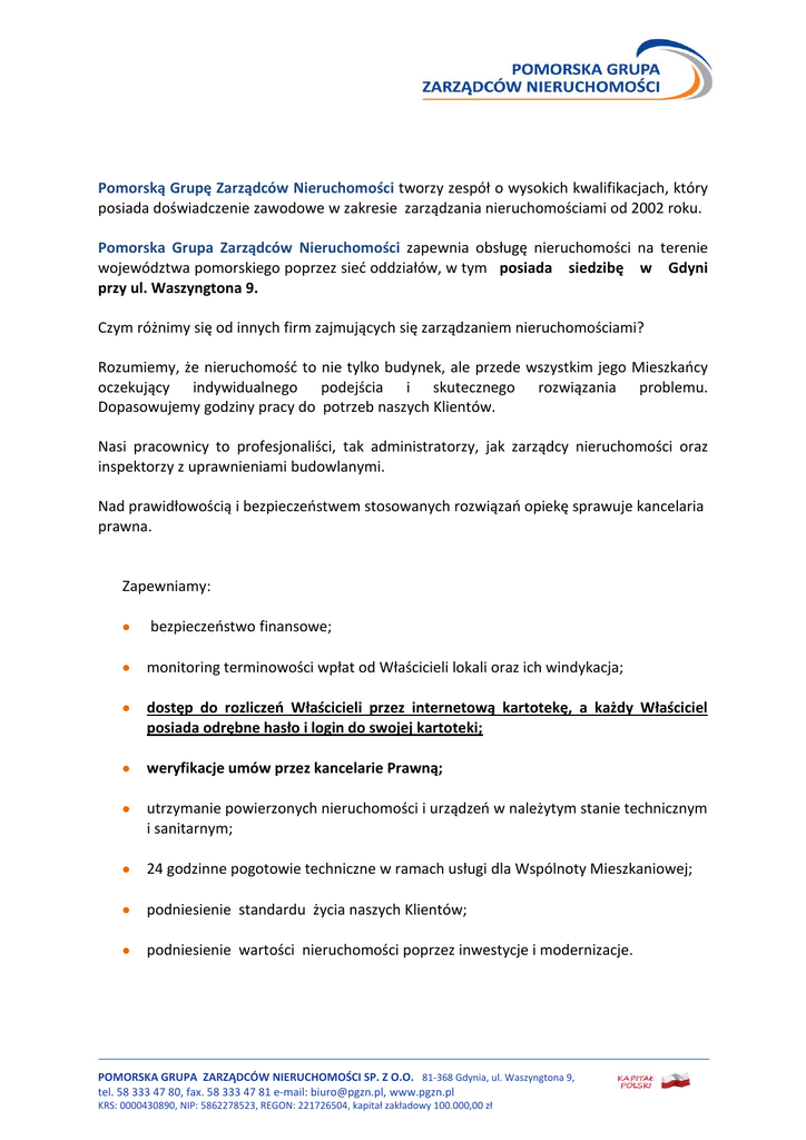 Pomorską Grupę Zarządców Nieruchomości tworzy zespół o wysokich kwalifikacjach, który posiada doświadczenie zawodowe w zakresie zarządzania nieruchomościami od 2002 roku. Pomorska Grupa Zarządców Nieruchomości zapewnia obsługę nieruchomości na terenie województwa pomorskiego poprzez sieć oddziałów, w tym posiada siedzibę w Gdyni przy ul. Waszyngtona 9. Czym różnimy się od innych firm zajmujących się zarządzaniem nieruchomościami? Rozumiemy, że nieruchomość to nie tylko budynek, ale przede wszystkim jego Mieszkańcy oczekujący indywidualnego podejścia i skutecznego rozwiązania problemu. Dopasowujemy godziny pracy do potrzeb naszych Klientów. Nasi pracownicy to profesjonaliści, tak administratorzy, jak zarządcy nieruchomości oraz inspektorzy z uprawnieniami budowlanymi. Nad prawidłowością i bezpieczeństwem stosowanych rozwiązań opiekę sprawuje kancelaria prawna. Zapewniamy: bezpieczeństwo finansowe; monitoring terminowości wpłat od Właścicieli lokali oraz ich windykacja; dostęp do rozliczeń Właścicieli przez internetową kartotekę, a każdy Właściciel posiada odrębne hasło i login do swojej kartoteki; weryfikacje umów przez kancelarie Prawną; utrzymanie powierzonych nieruchomości i urządzeń w należytym stanie technicznym i sanitarnym; 24 godzinne pogotowie techniczne w ramach usługi dla Wspólnoty Mieszkaniowej; podniesienie standardu życia naszych Klientów; podniesienie wartości nieruchomości poprzez inwestycje i modernizacje. POMORSKA GRUPA ZARZĄDCÓW NIERUCHOMOŚCI SP. Z O.O. 81-368 Gdynia, ul. Waszyngtona 9, tel. 58 333 47 80, fax. 58 333 47 81 e-mail: [email protected], www.pgzn.pl KRS: 0000430890, NIP: 5862278523, REGON: 221726504, kapitał zakładowy 100.000,00 zł Oferta świadczenia usługi zarządzania nieruchomością. Szanowni Państwo, Pomorska Grupa Zarządców Nieruchomości Sp. z o.o. poniżej przestawia Państwu szczegółowy zakres świadczenia usługi. Proponowana stawka za kompleksową usługę zawierającą: obsługę administracyjną; obsługę bankowo – księgową; obsługę prawną; obsługę techniczną; nadzór nad eksploatacją nieruchomości; 0,55 zł/m2 Szczegółowy zakres naszej oferty: Sprawnie zarządzamy nieruchomością, utrzymujemy czystość w budynkach i dbamy o ich bieżącą konserwację. W ramach obsługi administracyjnej: Przejmujemy protokolarnie nieruchomości Wspólnot Mieszkaniowych, współwłasności, nieruchomości komercyjne wraz z dokumentacją techniczną i prawną. Przygotowujemy procedury wyodrębnienia Wspólnot z zasobów spółdzielni mieszkaniowych. Obsługujemy zebrania Wspólnot wraz z przygotowaniem pełnej dokumentacji. Negocjujemy i nadzorujemy realizację umów z dostawcami mediów i usług. Ubezpieczamy nieruchomości na zasadzie „minimalna kwota za maksymalne zabezpieczenie”. Pozyskujemy środki finansowe dla Wspólnot np. reklama na budynku, wynajem nieużywanych części wspólnych budynku (np. strych) i inne. Prowadzimy ewidencję i dokonujemy odczytów urządzeń pomiarowych w budynku. Weryfikujemy i obniżamy w racjonalny sposób moc zamówioną energii cieplnej w budynkach. Archiwizujemy dokumenty zarządzanej nieruchomości. Zapewniamy utrzymanie czystość w budynku i w jego otoczeniu wykonując usługę sprzątania, utrzymania terenów zielonych, placów zabaw. Wykonujemy nasadzenia roślin i krzewów oraz rekultywacji trawników. POMORSKA GRUPA ZARZĄDCÓW NIERUCHOMOŚCI SP. Z O.O. 81-368 Gdynia, ul. Waszyngtona 9, tel. 58 333 47 80, fax. 58 333 47 81 e-mail: [email protected], www.pgzn.pl KRS: 0000430890, NIP: 5862278523, REGON: 221726504, kapitał zakładowy 100.000,00 zł Zapewniamy dostęp do rozliczeń indywidualnych Właścicieli poprzez internetową kartotekę. W ramach obsługi finansowo - księgowej: Przygotowujemy rozliczenia eksploatacyjne nieruchomości wspólnej oraz funduszu remontowego. Przygotowujemy rozliczenia współwłasności rzeczy wspólnej; Przygotowujemy plany rzeczowo – finansowe. Zapewniamy dostęp do rozliczeń indywidualnych Właścicieli przez internetową kartotekę w ramach usługi zarządzania. Przygotowujemy roczne sprawozdanie finansowe nieruchomości. Indywidualnie rozliczamy Właścicieli nieruchomości. Dokonujemy na bieżąco analizy przychodów i kosztów utrzymania budynku. Dokonujemy bieżących płatności objętych stałymi umowami. Monitorujemy terminowość wpłat od Właścicieli. Prowadzimy windykację należności dłużników. Prowadzone przez nas remonty podnoszą wartość nieruchomości i wpływają na obniżenie kosztów eksploatacji budynków. W ramach obsługi technicznej: Zapewniamy całodobowe usunięcie awarii i jej skutków w ramach pogotowia technicznego. Na bieżąco usuwamy usterki i wykonujemy prace remontowe w budynkach. Nadzorujemy obsługę serwisową instalacji i urządzeń znajdujących się w budynkach. Sporządzamy plany remontowo – konserwacyjne wynikające z corocznych przeglądów technicznych, w tym kosztorysy inwestorskie na planowane roboty w ramach umowy o zarządzanie. Wykonujemy coroczną kontrolę techniczną ogólnobudowlaną budynku w ramach umowy o zarządzanie. Organizujemy roboty remontowo – modernizacyjne, w tym przeprowadzamy procedury przetargowe, zapewniamy wykonawców i dokonujemy porównania złożonych przez nich ofert. Nadzorujemy roboty remontowo – modernizacyjne poprzez inspektorów z wymaganymi uprawnieniami. Prowadzimy książkę obiektu budowlanego oraz dokumentację techniczną nieruchomości wymaganą przez przepisy prawa budowlanego. Organizujemy wykonawstwo pozostałych okresowych przeglądów nieruchomości i urządzeń stanowiących jej wyposażenie techniczne zgodnie z obowiązującymi przepisami prawa. Przygotowujemy procedury prowadzące do otrzymania kredytów preferencyjnych na planowane remonty w ramach umowy o zarządzanie. POMORSKA GRUPA ZARZĄDCÓW NIERUCHOMOŚCI SP. Z O.O. 81-368 Gdynia, ul. Waszyngtona 9, tel. 58 333