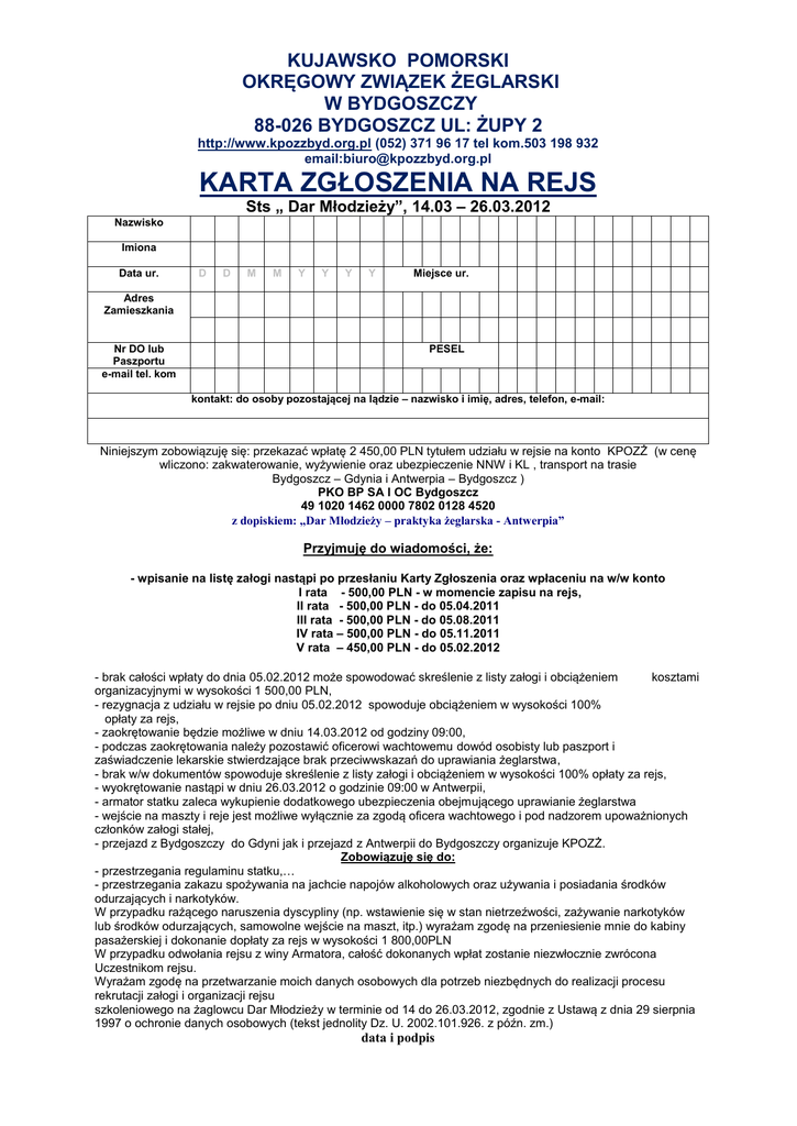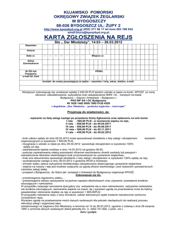 KUJAWSKO POMORSKI OKRĘGOWY ZWIĄZEK ŻEGLARSKI W BYDGOSZCZY 88-026 BYDGOSZCZ UL: ŻUPY 2 http://www.kpozzbyd.org.pl (052) 371 96 17 tel kom.503 198 932 email:[email protected] KARTA ZGŁOSZENIA NA REJS Sts „ Dar Młodzieży”, 14.03 – 26.03.2012 Nazwisko Imiona Data ur. D D M M Y Y Y Y Miejsce ur. Adres Zamieszkania Nr DO lub Paszportu e-mail tel. kom PESEL kontakt: do osoby pozostającej na lądzie – nazwisko i imię, adres, telefon, e-mail: Niniejszym zobowiązuję się: przekazać wpłatę 2 450,00 PLN tytułem udziału w rejsie na konto KPOZŻ (w cenę wliczono: zakwaterowanie, wyżywienie oraz ubezpieczenie NNW i KL , transport na trasie Bydgoszcz – Gdynia i Antwerpia – Bydgoszcz ) PKO BP SA I OC Bydgoszcz 49 1020 1462 0000 7802 0128 4520 z dopiskiem: „Dar Młodzieży – praktyka żeglarska - Antwerpia” Przyjmuję do wiadomości, że: - wpisanie na listę załogi nastąpi po przesłaniu Karty Zgłoszenia oraz wpłaceniu na w/w konto I rata - 500,00 PLN - w momencie zapisu na rejs, II rata - 500,00 PLN - do 05.04.2011 III rata - 500,00 PLN - do 05.08.2011 IV rata – 500,00 PLN - do 05.11.2011 V rata – 450,00 PLN - do 05.02.2012 - brak całości wpłaty do dnia 05.02.2012 może spowodować skreślenie z listy załogi i obciążeniem kosztami organizacyjnymi w wysokości 1 500,00 PLN, - rezygnacja z udziału w rejsie po dniu 05.02.2012 spowoduje obciążeniem w wysokości 100% opłaty za rejs, - zaokrętowanie będzie możliwe w dniu 14.03.2012 od godziny 09:00, - podczas zaokrętowania należy pozostawić oficerowi wachtowemu dowód osobisty lub paszport i zaświadczenie lekarskie stwierdzające brak przeciwwskazań do uprawiania żeglarstwa, - brak w/w dokumentów spowoduje skreślenie z listy załogi i obciążeniem w wysokości 100% opłaty za rejs, - wyokrętowanie nastąpi w dniu 26.03.2012 o godzinie 09:00 w Antwerpii, - armator statku zaleca wykupienie dodatkowego ubezpieczenia obejmującego uprawianie żeglarstwa - wejście na maszty i reje jest możliwe wyłącznie za zgodą oficera wachtowego i pod nadzorem upoważnionych członków załogi stałej, - przejazd z Bydgoszczy do Gdyni jak i przejazd z Antwerpii do Bydgoszczy organizuje KPOZŻ. Zobowiązuję się do: - przestrzegania regulaminu statku,… - przestrzegania zakazu spożywania na jachcie napojów alkoholowych oraz używania i posiadania środków odurzających i narkotyków. W przypadku rażącego naruszenia dyscypliny (np. wstawienie się w stan nietrzeźwości, zażywanie narkotyków lub środków odurzających, samowolne wejście na maszt, itp.) wyrażam zgodę na przeniesienie mnie do kabiny pasażerskiej i dokonanie dopłaty za rejs w wysokości 1 800,00PLN W przypadku odwołania rejsu z winy Armatora, całość dokonanych wpłat zostanie niezwłocznie zwrócona Uczestnikom rejsu. Wyrażam zgodę na przetwarzanie moich danych osobowych dla potrzeb niezbędnych do realizacji procesu rekrutacji załogi i organizacji rejsu szkoleniowego na żaglowcu Dar Młodzieży w terminie od 14 do 26.03.2012, zgodnie z Ustawą z dnia 29 sierpnia 1997 o ochronie danych osobowych (tekst jednolity Dz. U. 2002.101.926. z późn. zm.) data i podpis