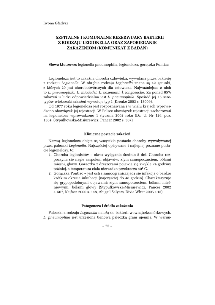 Iwona Gğadysz SZPITALNE I KOMUNALNE REZERWUARY BAKTERII Z RODZAJU LEGIONELLA ORAZ ZAPOBIEGANIE ZAKAłENIOM (KOMUNIKAT Z BADAĠ) Sğowa kluczowe: legionella pneumophila, legioneloza, gorĂczka Pontiac Legioneloza jest to zakaŁna choroba czğowieka, wywoğana przez bakteriĎ z rodzaju Legionella. W obrĎbie rodzaju Legionella znane sĂ 42 gatunki, z których 20 jest chorobotwórczych dla czğowieka. NajwaŃniejsze z nich to L. pneumophila, L. micdadei, L. bozemani, l. longbeache. Za ponad 85% zakaŃeġ u ludzi odpowiedzialna jest L. pneumophila. Spoıród jej 15 serotypów wiĎkszoıĄ zakaŃeġ wywoğuje typ 1 (Krenke 2003 s. 13009). Od 1977 roku legioneloza jest rozpoznawana i w wielu krajach wprowadzono obowiĂzek jej rejestracji. W Polsce obowiĂzek rejestracji zachorowaġ na legionelozĎ wprowadzono 1 stycznia 2002 roku (Dz. U. Nr 126, poz. 1384, Stypuğkowska-Misiurewicz, Pancer 2002 s. 567). Kliniczne postacie zakaŃeġ NazwĂ legioneloza objĎte sĂ wszystkie postacie choroby wywoğywanej przez pağeczki Legionella. NajczĎıciej opisywane i najlepiej poznane postacie legionelozy, to: 1. Choroba legionistów – okres wylĎgania ırednio 5 dni. Choroba rozpoczyna siĎ nagle zespoğem objawów: zğym samopoczuciem, bólami miĎıni, gğowy. GorĂczka z dreszczami pojawia siĎ zwykle 24 godziny póŁniej, a temperatura ciağa nierzadko przekracza 40º C. 2. GorĂczka Pontiac – jest ostrĂ samoograniczajĂcĂ siĎ infekcjĂ o bardzo krótkim okresie inkubacji (najczĎıciej do 48 godzin). Charakteryzuje siĎ grypopodobnymi objawami: zğym samopoczuciem, bólami miĎıniowymi, bólami gğowy (Stypuğkowska-Misiurewicz, Pancer 2002 s. 567, Kajfasz 2000 s. 148, Abigail Salyers, Dixie Whitt 2005 s.15). Patogeneza i Łródğa zakaŃenia Pağeczki z rodzaju Legionella naleŃĂ do bakterii wewnĂtrzkomórkowych. L. pneumophila jest urzĎsionĂ tlenowĂ pağeczkĂ gram ujemnĂ. W warun– 75 – kach naturalnych bytuje w ırodowisku wilgotnym lub wodnym. Rozwojowi drobnoustroju sprzyja wyŃsza temperatura wody (optymalny rozwój w temperaturze 40-45º C) i zawartoıci soli Ńelaza. Naturalnym rezerwuarem sĂ ameby i pierwotniaki, w których drobnoustrój siĎ rozmnaŃa. Gğównym Łródğem zakaŃenia sĂ: gleba, systemy klimatyzacyjne, domowe instalacje wodne, woda pitna, nawilŃacze, nebulizatory, pğuczki (Krenke 2003 s. 13009). Zapobieganie Badania ırodowiskowe prowadzone przez wielu autorów potwierdzajĂ, Ńe od 12% do 70% systemów dystrybucji wody jest skolonizowanych przez bakterie z rodzaju Legionella. Doskonağe warunki dla rozwoju tych bakterii istniejĂ w zbiornikach i instalacjach, szczególnie wody ciepğej, gdzie pağeczki te wchodzĂ w skğad biofilmu powstajĂcego na wewnĎtrznych powierzchniach rur i elementów urzĂdzeġ kontaktujĂcych siĎ z wodĂ, a ich namnaŃaniu sprzyja korozja oraz obecnoıĄ osadów i pierwotniaków, które sĂ bogatym Łródğem zwiĂzków organicznych. Najintensywniej zasiedlane sĂ przewody zasilane wodĂ o temperaturze 35-46º C. L. pneumophila byğa wykrywana w wodzie wodociĂgowej o zakresie temperatur 20-55º C (Matuszewska, Krogulska 2002 s. 138). W wodzie, w tym równieŃ pitnej, szczepy Legionella mogĂ przeŃywaĄ do roku. Stwierdzono, Ńe pağeczki te nie sĂ radykalnie likwidowane przez ogólnie stosowane ırodki dezynfekcyjne w wodociĂgach, a wiĎc chlor, ozon, promienie UV, a takŃe podgrzewanie nawet do 60º C. Cağkowicie niszczy je dopiero ogrzewanie do temperatury okoğo 80º C (Strojek 2000 s. 62). JednĂ z metod zapobiegania jest, wiĎc okresowa kontrola bakteriologiczna wody pitnej, a szczególnie znanych Łródeğ infekcji, jakimi sĂ urzĂdzenia klimatyzacyjne czy urzĂdzenia do terapii balneologicznej. Konieczna jest tam czĎsta zmiana filtrów oraz unikanie recyrkulacji powietrza wentylacyjnego (Strojek 2000 s. 62). Wğaıciwa dystrybucja, dezynfekcja oraz nadzór nad jakoıciĂ wody pozwala na unikniĎcie problemów zwiĂzanych z wtórnym mikrobiologicznym zanieczyszczeniem wody. Bardzo waŃnym elementem profilaktyki jest utrzymywanie we wğaıciwym stanie technicznym i higienicznym wewnĎtrznych instalacji wodociĂgowych w budynkach mieszkalnych i uŃytecznoıci publicznej. Zapobieganie namnaŃaniu pağeczek Legionella w systemach wodociĂgowych jest przede wszystkim problem wğaıciwych rozwiĂzaġ technicznych (Matuszewska, Krogulska 2002 s. 138). Podczas projektowania i eksploatacji systemów dystrybucji wody szczególnĂ uwagĎ naleŃy zwracaĄ na to, aby: – 76 – 1. Instalacje wody zimnej i ciepğej byğy odpowiednio izolowane, w celu zapewnienia wğaıciwej temperatury (wody zimnej poniŃej 20º C, wody ciepğej powyŃej 55º C) 2. Materiağy, z których wykonana jest instalacja wodna nie sprzyjağy wzrostowi mikroorganizmów 3. Instalacja wody ciepğej byğa odporna na temperaturĎ 70-80º C (dezynfekcja termiczna) 4. Konstrukcja podgrzewaczy i zbiorników umoŃliwiağa ğatwy do nich dostĎp 5. Nie powstawağy zastoiny wody (likwidacja tzw. ılepych odcinków instalacji) 6. Konstrukcja perlatorów i gğówek natrysków nie pozwalağa na powstawanie mikroaerozoli o ırednicy kropel 2,0-5,0mm 7. StosowaĄ samoopróŃniajĂce siĎ przewody prysznicowe 8. ZapobiegaĄ procesom korozji i tworzenia zğogów, osadów 9. Okresowa kontrola jakoıci wody pod kĂtem obecnoıci bakterii Legionella NaleŃy zwróciĄ uwagĎ, Ń dopiero wdroŃenie wszystkich elementów systemu dystrybucji wody pozwala na osiĂgniĎcie bardzo wysokiego poziomu zabezpieczenia instalacji (Krogulska, Matuszewska 2006 s. 41, Walczak, Ostrowski 2006 s. 44). Streszczenie Legionella pneumophila jest czynnikiem etiologicznym legionelozy przebiegajĂcej pod dwoma postaciami klinicznymi: gorĂczki Pontiac lub postaciĂ choroby legionistów manifestujĂcej siĎ ciĎŃkim, atypowym zapaleniem pğuc. Gğównym Łródğem zakaŃenia sĂ: gleba, systemy klimatyzacyjne, domowe instalacje wodne, woda pitna, nawilŃacze pğuczki, neulizatory. NajwaŃniejs
