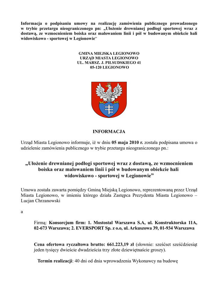 Informacja o podpisaniu umowy na realizację zamówienia publicznego prowadzonego w trybie przetargu nieograniczonego pn: „Ułożenie drewnianej podłogi sportowej wraz z dostawą, ze wzmocnieniem boiska oraz malowaniem linii i pól w budowanym obiekcie hali widowiskowo - sportowej w Legionowie“ GMINA MIEJSKA LEGIONOWO URZĄD MIASTA LEGIONOWO UL. MARSZ. J. PIŁSUDSKIEGO 41 05-120 LEGIONOWO INFORMACJA Urząd Miasta Legionowo informuje, iż w dniu 05 maja 2010 r. została podpisana umowa o udzielenie zamówienia publicznego w trybie przetargu nieograniczonego pn.: „Ułożenie drewnianej podłogi sportowej wraz z dostawą, ze wzmocnieniem boiska oraz malowaniem linii i pól w budowanym obiekcie hali widowiskowo - sportowej w Legionowie” Umowa została zawarta pomiędzy Gminą Miejską Legionowo, reprezentowaną przez Urząd Miasta Legionowo, w imieniu którego działa Zastępca Prezydenta Miasta Legionowo – Lucjan Chrzanowski a Firmą: Konsorcjum firm: 1. Mostostal Warszawa S.A, ul. Konstruktorska 11A, 02-673 Warszawa; 2. EVERSPORT Sp. z o.o, ul. Arkuszowa 39, 01-934 Warszawa Cena ofertowa ryczałtowa brutto: 661.223,19 zł (słownie: sześćset sześćdziesiąt jeden tysięcy dwieście dwadzieścia trzy złote dziewiętnaście groszy). Termin realizacji: 40 dni od dnia wprowadzenia Wykonawcy na budowę