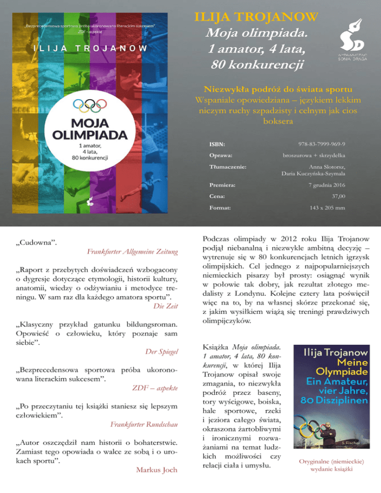 ILIJA TROJANOW Moja olimpiada. 1 amator, 4 lata, 80 konkurencji Niezwykła podróż do świata sportu Wspaniale opowiedziana – językiem lekkim niczym ruchy szpadzisty i celnym jak cios boksera ISBN: Oprawa: broszurowa + skrzydełka Tłumaczenie: Anna Slotorsz, Daria Kuczyńska-Szymala Premiera: Cena: Format: „Cudowna”. Frankfurter Allgemeine Zeitung „Raport z przebytych doświadczeń wzbogacony o dygresje dotyczące etymologii, historii kultury, anatomii, wiedzy o odżywianiu i metodyce treningu. W sam raz dla każdego amatora sportu”. Die Zeit „Klasyczny przykład gatunku bildungsroman. Opowieść o człowieku, który poznaje sam siebie”. Der Spiegel „Bezprecedensowa sportowa próba ukoronowana literackim sukcesem”. ZDF – aspekte „Po przeczytaniu tej książki staniesz się lepszym człowiekiem”. Frankfurter Rundschau „Autor oszczędził nam historii o bohaterstwie. Zamiast tego opowiada o walce ze sobą i o urokach sportu”. Markus Joch 978-83-7999-969-9 7 grudnia 2016 37,00 143 x 205 mm Podczas olimpiady w 2012 roku Ilija Trojanow podjął niebanalną i niezwykle ambitną decyzję – wytrenuje się w 80 konkurencjach letnich igrzysk olimpijskich. Cel jednego z najpopularniejszych niemieckich pisarzy był prosty: osiągnąć wynik w połowie tak dobry, jak rezultat złotego medalisty z Londynu. Kolejne cztery lata poświęcił więc na to, by na własnej skórze przekonać się, z jakim wysiłkiem wiążą się treningi prawdziwych olimpijczyków. Książka Moja olimpiada. 1 amator, 4 lata, 80 konkurencji, w której Ilija Trojanow opisał swoje zmagania, to niezwykła podróż przez baseny, tory wyścigowe, boiska, hale sportowe, rzeki i jeziora całego świata, okraszona żartobliwymi i ironicznymi rozważaniami na temat ludzkich możliwości czy relacji ciała i umysłu. Oryginalne (niemieckie) wydanie książki ILIJA TROJANOW © Hannelore FoersterGetty Images Urodził się w 1965 roku w Sofii, w 1971 jego rodzina uciekła przez Jugosławię i Włochy do Niemiec i tam uzyskała azyl polityczny. W 1972 roku przeprowadzili się ponownie, tym razem do Kenii. Tam narodziła się fascynacja Trojanowa sportem. W latach 1984‒1989 studiował prawo i etnologię na Uniwersytecie Monachijskim. W 1989 roku założył w Monachium wydawnictwo Kyrill & Method, dwa lata później wydawnictwo Merino. W 1998 Trojanow przeprowadził się do Bombaju. W 2003 zamieszkał w Kapsztadzie, a dziś, w czasie kiedy nie podróżuje, mieszka w Wiedniu. Do jego najbardziej rozpoznawalnych, nagrodzonych licznymi nagrodami publikacji należą m.in. powieść Kolekcjoner światów oraz książki podróżnicze. Fragmenty książki O pływaniu: Nauczyłem się pływać, mając prawie pięćdziesiąt lat. Sztukę nietonięcia opanowałem zaś już w siódmym roku życia. Jako dziecko umiałem dopłynąć żabką do rafy, w internacie byłem w stanie przetrwać milowy dystans w basenie, podczas studenckich wakacji zażywałem długich kąpieli w morzu. Jednak to pływanie kraulem było tym, czego zawsze pragnęło moje słabe pływackie serce. Przez całe lata śniłem, że pływam spokojnie kraulem, nie męczę się ani przez chwilę, a moje ruchy są pełne mocy. Na próżno. Aż do pewnego wietrznego wiosennego dnia, kiedy wybrałem się na kurs pływania „Tak jak pływają ryby”. Takim sloganem reklamowano nową technikę o nazwie Total Immersion (TI). O tenisie stołowym: Jest rok 1936. Podczas turnieju w Pradze spotykają się Alojzy Ehrlich, Polak żydowskiego pochodzenia, i Rumun Farkas Paneth. Obydwaj są mistrzami gry defensywnej. Po dwóch godzinach i dwunastu minutach następuje to, na co czekają wszyscy: jeden z zawodników zdobywa pierwszy punkt. Opis dwunastu tysięcy przebić, przerywanych pełnymi napięcia, dramatycznymi momentami, kiedy sędziowie musieli się zmieniać ze względu na zesztywniały kark, wystawiłby cierpliwość niejednego czytelnika na ciężką próbę. A prawdziwa opowieść miałaby się dopiero zacząć. O boksie i szermierce: Boksu i szermierki chciałem nauczyć się jednocześnie, są to bowiem skrajnie odmienne formy walki. Opowiedzenie się za jednym z tych sportów jest jednocześnie opowiedzeniem się przeciwko temu drugiemu. Można to porównać z wyborem, czy je się palcami, czy też za pomocą sztućców. Trudno sobie przecież wyobrazić szermierza, który się boksuje. O zapasach: Niestety w naszych szerokościach geograficznych zapasy wcale nie są popularne. Już samo kupienie trykotu nastręcza trudności. W Wiedniu ma je na składzie jeden jedyny sklep, na dodatek dla dorosłych tylko w jednym rozmiarze. – Dziewięćdziesiąt procent naszej sprzedaży to trykoty dla dzieci – informują mnie przez telefon. Dorosłym rzadko przychodzi do głowy pomysł udziału w zapasach. Na szczęście rozmiar średni na mnie pasuje. Opakowanie zawiera niebieski i czerwony trykot. – Potrzebuję jeszcze czegoś? – pytam w sklepie. Sprzedawczyni uśmiecha się znacząco. – Ochraniacze na uszy! Przychodzą do nas ludzie z poobrywanymi małżowinami. Ochraniacze wyglądają brzydko i nieforemnie. Sprzedawczyni wyczuwa moje wahanie. Sonia Draga Sp. z o.o., Pl. Grunwaldzki 8-10, 40-127 Katowice, Tel.: 32 7826477, 7826037, Fax: 032 2537728 Dział handlowy: Danuta Czarnowska, 693420384, [email protected] Promocja: Agnieszka Jedlińska, 695672067, [email protected] Redakcja: [email protected]