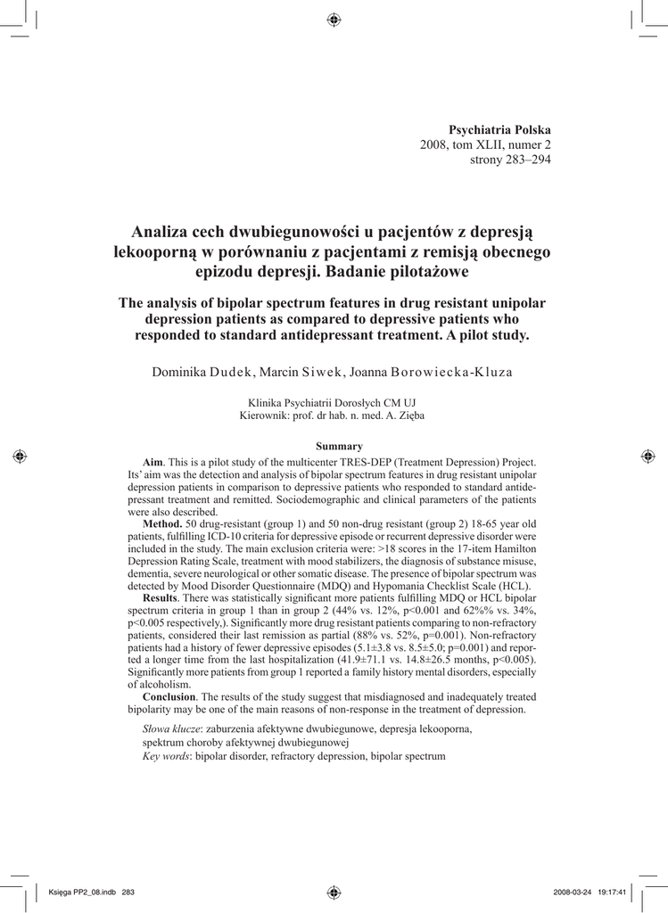 Psychiatria Polska 2008, tom XLII, numer 2 strony 283–294 Analiza cech dwubiegunowości u pacjentów z depresją lekooporną w porównaniu z pacjentami z remisją obecnego epizodu depresji. Badanie pilotażowe The analysis of bipolar spectrum features in drug resistant unipolar depression patients as compared to depressive patients who responded to standard antidepressant treatment. A pilot study. Dominika Dudek, Marcin Siw e k , Joanna B o r o w i e c k a -K l u z a Klinika Psychiatrii Dorosłych CM UJ Kierownik: prof. dr hab. n. med. A. Zięba Summary Aim. This is a pilot study of the multicenter TRES-DEP (Treatment Depression) Project. Its’ aim was the detection and analysis of bipolar spectrum features in drug resistant unipolar depression patients in comparison to depressive patients who responded to standard antidepressant treatment and remitted. Sociodemographic and clinical parameters of the patients were also described. Method. 50 drug-resistant (group 1) and 50 non-drug resistant (group 2) 18-65 year old patients, fulfilling ICD-10 criteria for depressive episode or recurrent depressive disorder were included in the study. The main exclusion criteria were: >18 scores in the 17-item Hamilton Depression Rating Scale, treatment with mood stabilizers, the diagnosis of substance misuse, dementia, severe neurological or other somatic disease. The presence of bipolar spectrum was detected by Mood Disorder Questionnaire (MDQ) and Hypomania Checklist Scale (HCL). Results. There was statistically significant more patients fulfilling MDQ or HCL bipolar spectrum criteria in group 1 than in group 2 (44% vs. 12%, p<0.001 and 62%% vs. 34%, p<0.005 respectively,). Significantly more drug resistant patients comparing to non-refractory patients, considered their last remission as partial (88% vs. 52%, p=0.001). Non-refractory patients had a history of fewer depressive episodes (5.1±3.8 vs. 8.5±5.0; p=0.001) and reported a longer time from the last hospitalization (41.9±71.1 vs. 14.8±26.5 months, p<0.005). Significantly more patients from group 1 reported a family history mental disorders, especially of alcoholism. Conclusion. The results of the study suggest that misdiagnosed and inadequately treated bipolarity may be one of the main reasons of non-response in the treatment of depression. Słowa klucze: zaburzenia afektywne dwubiegunowe, depresja lekooporna, spektrum choroby afektywnej dwubiegunowej Key words: bipolar disorder, refractory depression, bipolar spectrum Księga PP2_08.indb 283 2008-03-24 19:17:41 284 Dominika Dudek i wsp. Wstęp Coraz częściej zwraca się uwagę, że jedną z przyczyn nieskuteczności leczenia depresji może być nierozpoznana, a co za tym idzie nieadekwatnie leczona, choroba afektywna dwubiegunowa (CHAD). W ramach przeprowadzonego w Polsce badania DEP-BI wykazano, że wśród pacjentów leczonych z powodu epizodu depresyjnego lub depresji nawracającej znaczącą większość mogą stanowić osoby z depresją w przebiegu różnych postaci CHAD [1, 2]. U tych pacjentów częściej występowała lekooporność [3]. Potrzeba szerszego zbadania przedstawionego wyżej problemu stała się podstawą opracowania wieloośrodkowego projektu TRES-DEP. Projekt powstał przy współpracy ośrodków: w Poznaniu (prof. dr hab. J. Rybakowski), we Wrocławiu (prof. dr hab. A. Kiejna), w Gdańsku (prof. dr hab. J. Landowski) i w Krakowie (dr hab. D. Dudek). Jego celem podstawowym jest analiza cech dwubiegunowości w grupie pacjentów z depresją lekooporną w porównaniu z grupą pacjentów, u których nastąpiła remisja obecnego epizodu depresji. Za cel dodatkowy przyjęto charakterystykę kliniczną i demograficzną pacjentów z depresją lekooporną. Poniższa praca prezentuje wyniki, przeprowadzonego w Klinice Psychiatrii Dorosłych CM UJ, badania pilotażowego projektu TRES-DEP. Metodyka i procedura przeprowadzonych badań Badaniem objęto osoby leczone w Poradni Leczenia Chorób Afektywnych i na Oddziale Leczenia Depresji Kliniki Psychiatrii CM UJ w Krakowie. Do badania włączano pacjentów, w wieku 18–65 lat, z diagnozą epizodu depresji lub depresji nawracającej (F32, F33) wg ICD-10, otrzymujących leki przeciwdepresyjne (LPD), którzy wyrazili świadomą zgodę na badanie. Przeprowadzono z nimi wywiad za pomocą kwestionariusza socjodemograficznego i klinicznego. Nasilenie objawów depresyjnych oceniano za pomocą 17-punktowej Skali Depresji Hamiltona (HDRS17 – Hamilton Depression Rating Scale) [4–6]. Warunkiem włączenia do badania było uzyskanie przez pacjentów w HDRS17 ≤ 18 punktów, ze względu na ryzyko fałszywie ujemnych wyników w kwestionariuszach badających cechy dwubiegunowości w przypadku znacznego nasilenia depresji. Cechy dwubiegunowości badano za pomocą Kwestionariusza Zaburzeń Nastroju Hirschfelda (KZN) [7, 8] oraz skali do oceny hipomanii Angsta (HCL – Hipomania Check List) [9]. Czułość i specyficzność KZN szacowana jest na poziomie odpowiednio: 73% i 90% [10]. HCL charakteryzuje się natomiast 80% czułością i 51% specyficznością [11]. W obu grupach, jako wynik wskazujący na cechy dwubiegunowości, przyjęto w KZN co najmniej 7 odpowiedzi „tak” w pierwszym punkcie, zawierającym 13 pytań, i przy odpowiedziach „tak” na te pytania występowanie co najmniej dwóch z wymienionych w nich zachowań w tym samym okresie życia pacjenta, oraz umiarkowany lub poważny problem, który te zachowania stwarzają [7, 8]. Natomiast za wynik wskazujący na potencjalne występowanie cech hipomanii u pacjentów ze zdiagnozowaną depresją w HCL przyjęto co najmniej 14 odpowiedzi „tak” w trzecim 32-itemowym Księga PP2_08.indb 284 2008-03-24 19:17:41 Analiza cech dwubiegunowości u pacjentów z depresją lekooporną 285 pytaniu [9]. Do badania nie zostali zakwalifikowani pacjenci: 1) otrzymujący leki normotymiczne, 2) z rozpoznaniem uzależnienia od substancji psychoaktywnych (z wyjątkiem nikotyny), 3) rozpoznaniem ot
