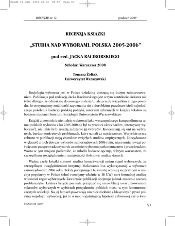 Rozdz 05.qxd 2010-02-03 09:57 Page 97 DECYZJE nr 12 grudzień 2009 RECENZJA KSIĄŻKI „STUDIA NAD WYBORAMI. POLSKA 2005-2006” pod red. JACKA RACIBORSKIEGO Scholar, Warszawa 2008 Tomasz Żółtak Uniwersytet Warszawski Socjologia wyborcza jest w Polsce dziedziną cieszącą się dużym zainteresowaniem. Publikacja pod redakcją Jacka Raciborskiego jest w tym kontekście ciekawa nie tylko dlatego, że odnosi się do nowego materiału, ale przede wszystkim z tego powodu, że otrzymujemy możliwość zapoznania się z dorobkiem przedstawicieli najmłodszego pokolenia badaczy polskiej polityki, autorami zebranych w książce tekstów są bowiem studenci Instytutu Socjologii Uniwersytetu Warszawskiego. Książki z pewnością nie należy traktować jako wyczerpującego kompendium na temat polskich wyborów z lat 2005-2006 (a był to przecież okres bardzo „intensywny wyborczo”), nie takie było zresztą założenie jej twórców. Koncentrują się oni na wybranych, bardzo konkretnych problemach, które uznali za najciekawsze. Wszystkie prace zebrane w publikacji mają charakter zwięzłych studiów empirycznych. Zdecydowana większość z nich dotyczy wyborów samorządowych 2006 roku, nieco mniej uwagi poświęcono przeprowadzonym rok wcześniej wyborom parlamentarnym i prezydenckim. Warto w tym miejscu podkreślić, że młodzi badacze operują dobrym warsztatem, ze szczególnym uwzględnieniem umiejętności ilościowej analizy danych. Ważną część książki stanowi analiza konsekwencji zmian reguł wyborczych, ze szczególnym uwzględnieniem instytucji blokowania list, wykorzystanej w wyborach samorządowych 2006 roku. Teksty podejmujące tę kwestię wpisują się przy tym w niezbyt popularny w Polsce (choć rozwijany właśnie w IS UW) nurt formalnej analizy własności reguł wyborczych. Zawartość publikacji obejmuje jednak znacznie szerszą problematykę. Lektura książki pozwala przyjrzeć się nieco bliżej uwarunkowaniom sukcesów wyborczych w wyborach prezydentów polskich miast, w tym fenomenowi częstych reelekcji. Na jej łamach powracają również niektóre z klasycznych pytań polskiej socjologii wyborczej, jak te o moc wyjaśniającą hipotezy zaborowej czy o kweDECYZJE NR 12/2009 97 Rozdz 05.qxd 2010-02-03 09:57 Page 98 RECENZJA stię zachowań wyborczych mniejszości niemieckiej na Śląsku Opolskim. Wreszcie, zainteresowania autorów objęły problem społeczno-demograficznych determinant preferencji wyborczych i politycznych konsekwencji absencji wyborczej. Przyjrzyjmy się nieco bliżej poszczególnym częściom książki. Publikację otwiera ciekawy tekst Adama Gendźwiłła, w którym bada on wybory prezydentów w największych miastach Polski (w analizie uwzględnione zostały wszystkie miasta na prawach powiatu). Koncentruje się przy tym na dwóch problemach. Pierwszy to rzucająca się w oczy klęska kandydatów partyjnych w konkurencji z kandydatami lokalnymi. Analiza afiliacji partyjnych (również tych z poprzednich wyborów samorządowych) startujących kandydatów, jak również wyników wyborów do rad miast prowadzi tu autora do wniosku, że duża część zwycięskich kandydatów lokalnych to w istocie „zamaskowani” kandydaci partyjni. Druga podjęta przez Adama Gendźwiłła kwestia to weryfikacja hipotezy, że reelekcje prezydentów miast (skądinąd częste w Polsce) są formą nagrody za skuteczne zarządzanie miastem w czasie ubiegającej kadencji. Przypuszczenie to, wysuwane w polskiej literaturze w nieco innym kontekście (badania o wąskim zasięgu przestrzennym, głównie małych miast), okazuje się nie znajdować potwierdzenia w przypadku największych miast w Polsce. W drugim rozdziale Piotr Rutkowski jako wyjaśnienie „fenomenu reelekcji” proponuje hipotezę klientelistyczną. W odróżnieniu od pozostałych badań, które znalazły się w książce, w tym przypadku mamy do czynienia ze studium przypadku – pewnego polskiego miasta ukrytego przez autora pod pseudonimem Apscoditi – przeprowadzonym przede wszystkim z wykorzystaniem technik jakościowych. Z jednej strony należy wyrazić uznanie dla badacza, który dysponując bardzo ograniczonymi możliwościami, zebrał szeroki materiał i opisał go w ciekawy sposób. Z drugiej, jak sam przyznaje, boryka się on z problemem zawieszenia w teoretycznej próżni i braku jednoznacznych kryteriów weryfikacji postawionej hipotezy. Mam przy tym wrażenie, że autor odniósłby duże korzyści z zapoznania się choćby z klasycznymi, choć w Polsce niestety mało znanymi badaniami elit lokalnych przeprowadzonymi w ramach podejścia „sieciowego” przez Edwarda Laumana i Franza Urbana Pappiego (badania Altneustadt). Wbrew temu, co widać patrząc wyłącznie na polską socjologię (czy politologię) badania nad powiązaniami (również tymi noszącymi symptomy patologii) aktorów tworzących lokalne czy krajowe elity są rozwijane nie od dziś i wydaje się, że sporo już na tym polu osiągnięto. Trzy kolejne rozdziały poświęcone zostały formalnej (a właściwie symulacyjnej) analizie konsekwencji manipulowania niektórymi regułami wyborów, na przykładzie wyborów do sejmików województw. Znajdziemy tu opublikowany pierwotnie na łamach „Decyzji” (grudzień 2006) artykuł Jacka Raciborskiego i Jędrzeja Ochremniaka „O blokowaniu list w wyborach samorządowych 2006 roku i o racjonalności partii politycznych”, 98 DECYZJE NR 12/2009 Rozdz 05.qxd 2010-02-03 09:57 Page 99 RECENZJA w którym autorzy analizują wpływ, jaki na wyniki wyborów do sejmików województw miało wprowadzenie możliwości blokowania list oraz czy w tym kontekście zachowania partii politycznych w ramach „gry o ordynację” można uznać za racjonalne. Tekst Tomasza Gołasia również rozważa konsekwencje instytucji blokowania list, ale nie w kontekście liczby zdobytych mandatów, tylko wartości indeksów siły, jakie posiadają/posiadałyby poszczególne ugrupowania w wyłoniony