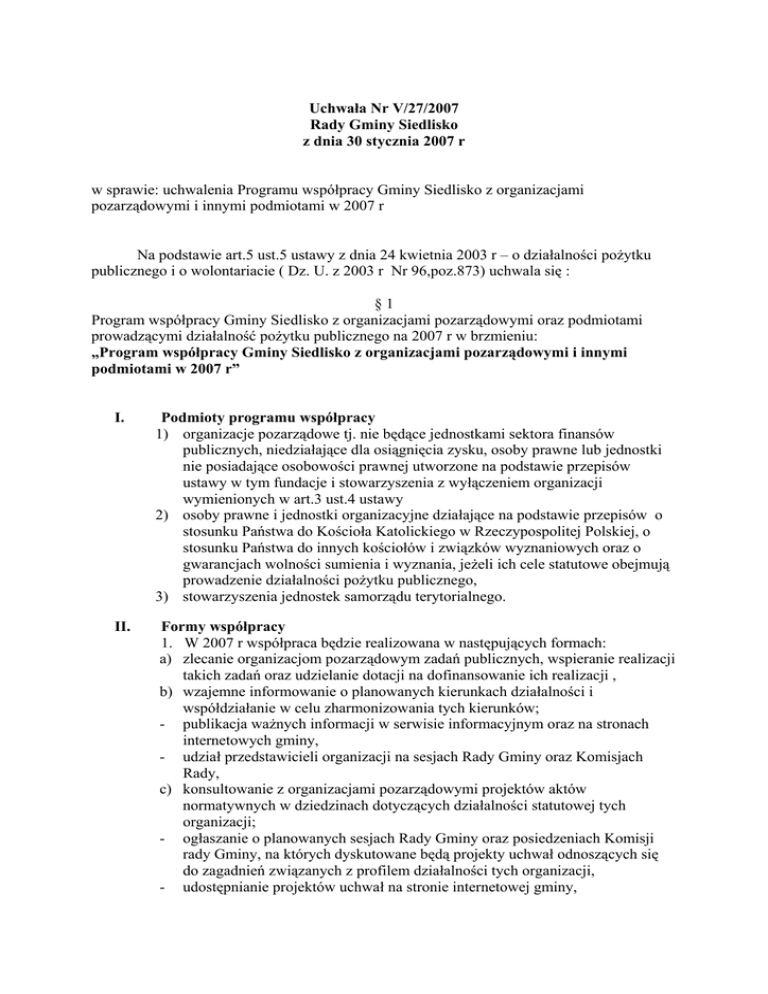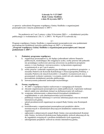 Uchwała Nr V/27/2007 Rady Gminy Siedlisko z dnia 30 stycznia 2007 r w sprawie: uchwalenia Programu współpracy Gminy Siedlisko z organizacjami pozarządowymi i innymi podmiotami w 2007 r Na podstawie art.5 ust.5 ustawy z dnia 24 kwietnia 2003 r – o działalności pożytku publicznego i o wolontariacie ( Dz. U. z 2003 r Nr 96,poz.873) uchwala się : §1 Program współpracy Gminy Siedlisko z organizacjami pozarządowymi oraz podmiotami prowadzącymi działalność pożytku publicznego na 2007 r w brzmieniu: „Program współpracy Gminy Siedlisko z organizacjami pozarządowymi i innymi podmiotami w 2007 r” I. Podmioty programu współpracy 1) organizacje pozarządowe tj. nie będące jednostkami sektora finansów publicznych, niedziałające dla osiągnięcia zysku, osoby prawne lub jednostki nie posiadające osobowości prawnej utworzone na podstawie przepisów ustawy w tym fundacje i stowarzyszenia z wyłączeniem organizacji wymienionych w art.3 ust.4 ustawy 2) osoby prawne i jednostki organizacyjne działające na podstawie przepisów o stosunku Państwa do Kościoła Katolickiego w Rzeczypospolitej Polskiej, o stosunku Państwa do innych kościołów i związków wyznaniowych oraz o gwarancjach wolności sumienia i wyznania, jeżeli ich cele statutowe obejmują prowadzenie działalności pożytku publicznego, 3) stowarzyszenia jednostek samorządu terytorialnego. II. Formy współpracy 1. W 2007 r współpraca będzie realizowana w następujących formach: a) zlecanie organizacjom pozarządowym zadań publicznych, wspieranie realizacji takich zadań oraz udzielanie dotacji na dofinansowanie ich realizacji , b) wzajemne informowanie o planowanych kierunkach działalności i współdziałanie w celu zharmonizowania tych kierunków; - publikacja ważnych informacji w serwisie informacyjnym oraz na stronach internetowych gminy, - udział przedstawicieli organizacji na sesjach Rady Gminy oraz Komisjach Rady, c) konsultowanie z organizacjami pozarządowymi projektów aktów normatywnych w dziedzinach dotyczących działalności statutowej tych organizacji; - ogłaszanie o planowanych sesjach Rady Gminy oraz posiedzeniach Komisji rady Gminy, na których dyskutowane będą projekty uchwał odnoszących się do zagadnień związanych z profilem działalności tych organizacji, - udostępnianie projektów uchwał na stronie internetowej gminy, - promocję działalności organizacji uczestniczących w realizacji programu na stronie internetowej gminy, d) tworzenie wspólnych zespołów o charakterze doradczym i inicjatywnym złożonych z przedstawicieli organizacji pozarządowych oraz właściwych organów administracji publicznej , e) inne formy współpracy: - publikowanie informacji skierowanych do podmiotów Programu oraz informacji przekazywanych przez podmioty o prowadzonych działaniach na stronie internetowej gminy, - pomoc podmiotom Programu w nawiązywaniu kontaktów w skali lokalnej, - pomoc w organizowaniu spotkań, szkoleń poporzez nieodpłatne udostępnianie lokali , środków technicznych itd. , w miarę posiadanych możliwości przez Gminę. 2. Przy podejmowaniu współpracy w sferze działań publicznych z organizacjami pozarządowymi kierować się będzie zasadami: partnerstwa, efektywności, jawności podejmowanych działań, legalności, uczciwej konkurencji III. Zakres zadań planowanych do realizacji w 2007 r w sferze: 1) pomocy społecznej i ochrony zdrowia - wspieranie działań na rzecz osób, rodzin, grup zagrożonych wykluczeniem społecznych, - wspieranie działań prowadzonych w zakresie rozwiązywania problemów uzależnień i patologii społecznych, - wspieranie działań w zakresie pomocy społecznej , szczególnie wspieranie rodziny w wypełnianiu funkcji opiekuńczo – wychowawczej, - działania na rzecz wyrównywania poziomu życia osób i rodzin znajdujących się w trudnej sytuacji życiowej – dożywianie - wspieranie aktywizacji lokalnego rynku pracy i przeciwdziałaniu bezrobociu, - wspieranie działań prowadzonych w zakresie profilaktyki i promocji ochrony zdrowia, - realizacja programów profilaktycznych i terapeutycznych skierowanych do dzieci, młodzieży i osób dorosłych 2) kultura fizyczna i sport - organizacja i uczestnictwo w gminnych imprezach sportowych, aktywizacja środowisk młodzieżowych w zakresie sportu i rekreacji, upowszechnianie kultury fizycznej w zakresie spędzania czasu wolnego ze szczególnym uwzględnieniem okresów ferii zimowych i letnich, - wspieranie masowych imprez turystyki aktywnej i kwalifikowanej o zasięgu powiatowym - szkolenie gminnych zespołów sportowych 3) kultura - organizacja imprez związanych z podtrzymywaniem tradycji narodowych, obywatelskich i patriotycznych, - wsparcie wydawnictwa o charakterze lokalnym - prezentacja i promowanie amatorskiego ruchu artystycznego - organizacja, wspieranie rzeczowe i na zasadzie dotacji realizacji zadań publicznych przedsięwzięć artystyczno-kulturalnych - wspieranie działań na rzecz upowszechniania muzyki wśród dzieci i młodzieży 5) wyrównywanie szans osób niepełnosprawnych, optymalne wykorzystanie środków przeznaczonych dla osób niepełnosprawnych, wspieranie rodzin z osobą niepełnosprawną. IV. Zakres zadań zaplanowanych do realizacji w 2007 r . Rada Gminy Siedlisko może zmienić w ciągu roku . Zmiany zakresu zadań podyktowane muszą być potrzebami lokalnymi lub wynikać z wniosków złożonych przez podmioty prowadzące działalność pożytku publicznego. V. Tryb realizacji zadań publicznych 1. Zlecanie realizacji zadań publicznych odbywa się na zasadach określonych w Rozporządzeniu Ministra Gospodarki, Pracy i Polityki Społecznej z dnia 27 grudnia 2005 r w sprawie wzoru oferty realizacji zadania publicznego, ramowego wzoru umowy o wykonanie zadania publicznego i wzoru sprawozdania z wykonania tego zadania ( Dz.U. z 2005 r Nr 264, poz. 2207). 2. Zlecenie realizacji zadań gminy organizacjom obejmuje w pierwszej kolejności te zad