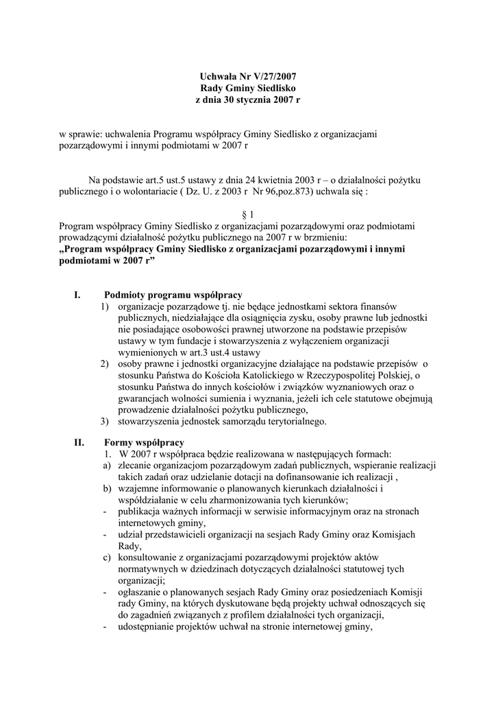 Uchwała Nr V/27/2007 Rady Gminy Siedlisko z dnia 30 stycznia