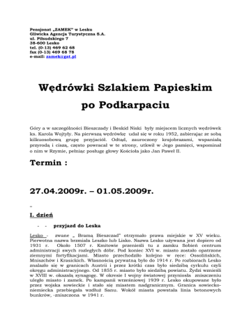 Pensjonat „ZAMEK” w Lesku Gliwicka Agencja Turystyczna S.A. ul. Piłsudskiego 7 38-600 Lesko tel. (0-13) 469 62 68 fax (0-13) 469 68 78 e-mail: [email protected] Wędrówki Szlakiem Papieskim po Podkarpaciu Góry a w szczególności Bieszczady i Beskid Niski były miejscem licznych wędrówek ks. Karola Wojtyły. Na pierwszą wędrówkę udał się w roku 1952, zabierając ze sobą kilkuosobową grupę przyjaciół. Odtąd, zauroczony krajobrazami, wspaniałą przyrodą i ciszą, często powracał w te strony, utkwił w Jego pamięci, wspominał o nim w Rzymie, pełniąc posługę głowy Kościoła jako Jan Paweł II. Termin : 27.04.2009r. – 01.05.2009r. I. dzień - - przyjazd do Leska Lesko - zwane „ Bramą Bieszczad” otrzymało prawa miejskie w XV wieku. Pierwotna nazwa brzmiała Leszko lub Lisko. Nazwa Lesko uŜywana jest dopiero od 1931 r. Około 1507 r. Kmitowie przenieśli tu z zamku Sobień centrum administracji swych rozległych dóbr. Pod koniec XVI w. miasto zostało opatrzone ziemnymi fortyfikacjami. Miasto przechodziło kolejno w ręce: Ossolińskich, Mniszchów i Krasickich. Własnością prywatną było do 1914 r. Po rozbiorach Lesko znalazło się w granicach Austrii i przez krótki czas było siedzibą cyrkułu czyli okręgu administracyjnego. Od 1855 r. miasto było siedzibą powiatu. śydzi wznieśli w XVIII w. okazałą synagogę. W okresie I wojny światowej przyniosła zniszczeniu uległo miasto i zamek. Po kampanii wrześniowej 1939 r. Lesko okupowane było przez wojska sowieckie i stało się miastem nadgranicznym. Granica sowieckoniemiecka przebiegała wzdłuŜ Sanu. Wokół miasta powstała linia betonowych bunkrów, -zniszczona w 1941 r. - - zakwaterowanie w Zamku Zamek w Lesku w jeden z najciekawszych obiektów zabytkowych Bieszczad, wybudowanym 1538 r. przez Kmitów, kilkakrotnie przebudowanym. Obecny wygląd Zamku to efekt klasycznej przebudowy dokonanej w XIX wieku, według projektu Wincentego Pola. - obiadokolacja - zwiedzanie miasta i zamku z przewodnikiem II.dzień - śniadanie Wędrówka szlakiem Ojca Świętego Jana Pawła II po Bieszczadach Lesko- Jezioro Solińskie- Polańczyk- Wetlina ( wyjście na połoninę)Ustrzyki Dolne- Jasień – Lesko Jezioro Solińskie- jezioro zaporowe (zbiornik retencyjny) połoŜone w województwie podkarpackim w pobliŜu miejscowości Solina. Zostało ono utworzone w 1968 roku poprzez spiętrzenie wód Sanu i Solinki przez zaporę, która ma 81,8 m wysokości (najwyŜsza w Polsce) i 664 m długości. Zbiornik ma powierzchnię ok. 22 km² i największą w Polsce pojemność (472 mln m³). Maksymalna głębokość zbiornika to 60 m przy zaporze. PoniŜej zapory znajduje się elektrownia wodna o mocy 200 MW. Polańczyk – uzdrowisko na zachodnim brzegu Jeziora Solińskiego. W miescowości znajduje się zabytkowy kościół Sanktuarium Matki BoŜej Pięknej Miłości dawniej cerkiew - W kościele znajduje się cudowna ikona Matki Boskiej z Dzieciątkiem zw. Matką Boską Łopieńską pochodząca z 1 poł. XVII w. przeniesiona tu z cerkwi w Łopience w 1949 r. W dniu 11.września 1999 roku odbyła się uroczystość Koronacji Obrazu. Korony Poświęcił PapieŜ Jan Paweł II w czasie pielgrzymki do Polski. Wetlina- Wieś połoŜona jest nieopodal źródła Wetlinki, będącej dopływem z prawego brzegu rzeki Solinki. Od zachodu i południa otoczona jest szczytami górskimi Jawornik (1021 m), Paportna (1198 m), od północy ciągnie się Połonina Wetlińska ze szczytem Roh (1255 m). W Wetlinie znajdowała sie największa cerkiew w Karpatach – pięciokopułowa na planie krzyŜa. Dziś na jej miejscu znajduje się kościół katolicki. We wsi znajduje się pomnik Ŝołnierzy WOP, którzy zginęli w walkach z UPA. Jasień- dawna wieś królewska, połoŜona u odnóŜa stoków Równi na Pogórzu Bieszczadów w której od 1968r. znajduje się Sanktuarium Matki BoŜej Bieszczadzkiej powołane przes ks. Kardynała Karola Wojtyłe i ks. Arcybiskupa Ignacego Tokarczuka. W sanktuarium znajduję się słynący z łask cudowny obraz ukazujący Matkę BoŜą z Dzieciątkiem na lewej ręce, przedstawionym wschodnim zwyczajem jako władca udzielający bogosławieństwa. Sam obraz jest ikoną bizantyńską z przełomu XV/XVI wieku nieznanego autora. - - obiadokolacja - ognisko na dziedzińcu zamkowym III. dzień - śniadanie Wędrówka szlakiem Ojca Świętego Jana Pawła II po Beskidzie Niskim Lesko - Komańcza – Chyrowa – Dukla –Miejsce Piastowe - Rymanów ZdrójLesko Komańcza- wieś lokowana na prawie wołoskim w 1512r. dawna osada leśników, potem kolejarzy, leŜąca na pograniczu Bieszczadów i Beskidu Niskiego, w dolinie rzeki Osławicy. Wielką atrakcją turystyczną Komańczy są zachowane cerkwie dawniej grekokatolicka, obecnie prawosławna p.w. Opieki Matki BoŜej (Pokrow) z 1802r. oraz grekokatolicka p.w. Orędownictwa Matki BoŜej, przeniesiona ze wsi Dydyńce pod Sanokiem. Przy cerkwi znajduje się Regionalne Muzeum Łemkowskie. W sąsiedztwie stacji kolejowej wzniesiono w latach 1940-50 kościół parafialny p.w. św. Józefa. W Komańczy znajduję się równieŜ Klasztor sióstr nazaretanek w którym od 29 września 1955r. do 26 września 1956r. internowany był ks. kardynał Stefan Wyszyński, w klasztorze tym zatrzymywał się równieŜ wędrujący po Beskidach i Bieszczadach z młodzieŜą ks. Karol Wojtyła. Chyrowa- We wsi znajduję się kościół dawniej cerkiew grekokatolicka z XVIII w, z cudownym obrazem Matki BoŜej z Dzieciątkiem. W roku 1952 po raz pierwszy grupa „Wujka” nocowała w Chyrowej, a w rok później, 12 sierpnia rozbiła biwak obok cerkwi, w której rankiem dnia następnego ks. Karol Wojtyła odprawił mszę świętą. Wydarzenie to upamiętnia pamiątkowy obelisk wzniesiony w maju 2005 r. przez jasielskich turystów. Chyrowa jest równieŜ znana jako miejsce odosobnienia św. Jana z Dukli. Dukla- to atrakcyjna turystycznie miejscowość słynąca z takich zabytków jak kośció