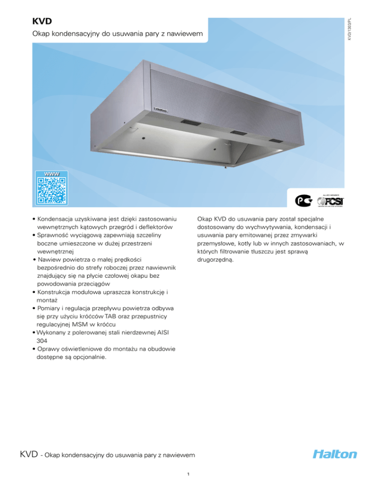 KVD/1303/PL KVD Okap kondensacyjny do usuwania pary z nawiewem WWW ALLIED MEMBER • Kondensacja uzyskiwana jest dzięki zastosowaniu wewnętrznych kątowych przegród i deflektorów • Sprawność wyciągową zapewniają szczeliny boczne umieszczone w dużej przestrzeni wewnętrznej • Nawiew powietrza o małej prędkości bezpośrednio do strefy roboczej przez nawiewnik znajdujący się na płycie czołowej okapu bez powodowania przeciągów • Konstrukcja modułowa upraszcza konstrukcję i montaż • Pomiary i regulacja przepływu powietrza odbywa się przy użyciu króćców TAB oraz przepustnicy regulacyjnej MSM w króćcu • Wykonany z polerowanej stali nierdzewnej AISI 304 • Oprawy oświetleniowe do montażu na obudowie dostępne są opcjonalnie. Okap KVD do usuwania pary został specjalne dostosowany do wychwytywania, kondensacji i usuwania pary emitowanej przez zmywarki przemysłowe, kotły lub w innych zastosowaniach, w których filtrowanie tłuszczu jest sprawą drugorzędną. KVD - Okap kondensacyjny do usuwania pary z nawiewem 1 KVD/1303/PL OPIS OKAPU KVD 8 1 5 9 2 7 6 6 3 KOD 1 2 3 4 5 6 7 8 9 Przeznaczenie Okap KVD został specjalnie zaprojektowany do umieszczania nad urządzeniami wytwarzającymi 3 OPIS Króciec wyciągowy I przepustnica Przegroda górna Szczeliny boczne Tacka ociekowa lub króciec spustowy Przepustnica pomiarowa i równoważąca MSM Przegrody wewnętrzne, ruchome Króciec pomiarowy TABTM Króciec nawiewu z przepustnicą MSM Przedni panel z czarną dyszą. 4 parę wodną, jego wewnętrzna objętość umożliwia wyciąganie dużej ilości powietrza, a następnie wyciąganego odbywa się poprzez ustawienie odprowadzanie go przez specjalną górną przegrodę przepustnicy regulacyjnej umieszczonej w króćcu (2). Dwie szczeliny boczne (3) zapobiegają skapywaniu wyciągowym i króćcu nawiewu przy pomocy MSM kondensatu na znajdujące się poniżej powierzchnie (5). robocze. Uzdatnione powietrze rozprowadzane jest Oprawy oświetleniowe montowane na wierzchu okapu z małą prędkością w pomieszczeniu przy pomocy mogą być dostarczone opcjonalnie. Okap KVD nawiewnika znajdującego się z przodu okapu (9). obejmuje moduł powietrza nawiewanego. Poszczególne dysze nawiewanego powietrza mogą zostać ustawione do wytwarzania wyższej prędkości Wyposażenie dodatkowe w strefie roboczej w pobliżu urządzeń kuchennych, • Panele osłonowe – jeżeli okap jest montowany co pozwala zredukować wypromieniowywanie ciepła poniżej poziomu sufitu przez urządzenia kuchenne. • Panele wypełniające • Oprawy oświetleniowe montowane na powierzchni Budowa okapu – IP 65 (maksymalna temperatura otoczenia: Zewnętrzna obudowa wykonana jest z stali 35°C) nierdzewnej AISI 304, łatwej do utrzymania w • Króćce o niestandardowej wielkości i pozycji czystości. Górna ścianka przestrzeni wyciągowej, • Górny panel wyciągu ze stali nierdzewnej króćce przyłączeniowe oraz przepustnica regulacyjna • Główny nawiew (GS) wykonane są ze stali ocynkowanej lub, opcjonalnie, ze stali nierdzewnej (AISI 304) (oprócz przepustnicy TABELA SZYBKIEGO DOBORU MSM). Zalecana ilość powietrza wyciągowego Wszystkie dolne połączenia okapu są zespawane Wyciąg Nawiew szwem ciągłym i polerowane, co zapewnia ich L l/s m 3/h H=555 mm H= 400 mm szczelność. Okap KVD wyposażony jest w króciec 1000 305 1100 spustowy (4) do odprowadzania zebranego 1500 445 1600 2000 610 2200 100...200 l/s/m lub 360...720 m 3/h/m LpA < 50 dB(A) 80...150 l/s/m lub 288...540 m 3/h/m LpA < 50 dB(A) 2500 805 2900 kondensatu. Wewnętrzne przegrody (6) można wyjmować, co Podana powyżej zalecana ilość powietrza wyciągowego zapewnia optymalną wymaganą prędkość przepływu przez szczeliny. LpA < 45 dB(A) zapewnia dostęp wnętrza przestrzeni wyciągowej i mycie okapu. Regulacja i pomiar ilości powietrza KVD - Okap kondensacyjny do usuwania pary z nawiewem 2 KVD/1303/PL WYMIARY H Wymiary podane poniżej obowiązują dla sekcji modułowych; większe okapy są budowane z kilku różnych modułów dla zoptymalizowania procesu logistycznego i instalacji. UMIEJSCOWIENIE POŁĄCZEŃ (mm) Dla typowych wymiarów B = 1000..1900 180 Wyciąg M P 2 Ø315 3 Ø315 1 Ø250 2 Ø250 3 Ø250 L M N M, N O P O, P 1500 L/2 375 - L/2 375 - 2000 L/2 500 - L/2 500 - 2500 - 500 L/2, 500 - 500 L/2, 500 3000 - 500 L/2, 500 - 500 L/2, 500 - Liczbę przyłączy wyciągowych i nawiewnych należy określić na podstawie długości sekcji oraz obliczeń prędkości powietrza wyciąganego, w zależności od używanych urządzeń kuchennych. - Inne konfiguracje przyłączeniowe powietrza wyciągowego i nawiewnego na zamówienie. N O (B-200)/2 Nawiew 1 Ø315 MASA (kg) L = 1000..3000 400 mm L/B 1000 1100 1300 1500 1000 63 67 70 74 1500 74 77 80 84 2000 89 92 96 101 2500 100 103 107 113 L/B 1000 1100 1300 1500 1000 69 73 76 79 1500 81 83 86 89 2000 95 99 94 108 2500 106 111 117 121 555 mm 250 315 Położenie króćców spustowych, jeżeli są 30 Widok z boku Wspornik montażowy, wysokość 150 mm 170 Widok z przodu KVD - Okap kondensacyjny do usuwania pary z nawiewem 3 KVD/1303/PL WWW www.halton.com/foodservice Halton sp. zo.o. ul. Bysławska 82, 04-993 Warszawa Tel. +48 (0) 22 672 8581 Fax +48 (0) 22 672 8559 www.halton.pl Asia Pacific France Germany Middle-East India USA China Asia Pacific Halton SAS Group Asia Sdn Bhd Halton HaltonFoodservice Middle-EastGmbH FZE Halton HaltonIndia Co. Pvt. Ltd. Halton Halton Ventilation Group Asia Co., Ltd Sdn Bhd PT 26064 Futura Technoparc Tiroler Jebel Ali Str.Free 60 Zone No. 101 3580 Industrial Fremont DriveTerraces 浩盾通风设备(上海)有限公司 PT 26064 Persiaran CS 80102 Teknologi Subang 83242 Office/Warehouse Reit im Winkl S3B3WH08 Lower Scottsville, Ground KYFloor, 42164 SubangBéthune 62402 Hi-Tech Cedex Industrial Park Tel. P.O.+49 Box8640 181168080 4th Tel.Cross, +1 27013th 2375600 G Main, Block Persiaran 10,No 600 Teknologi South Xinyuan SubangRd Lingang Su