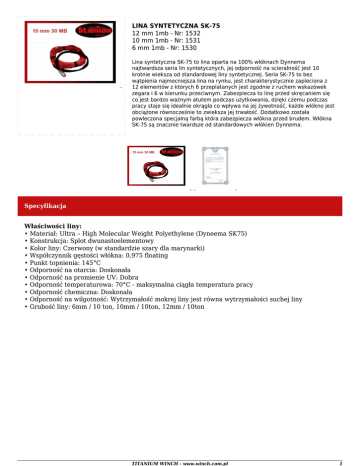 LINA SYNTETYCZNA SK-75 12 mm 1mb - Nr: 1532 10 mm 1mb - Nr: 1531 6 mm 1mb - Nr: 1530 Lina syntetyczna SK-75 to lina oparta na 100% włóknach Dynnema najtwardsza seria lin syntetycznych, jej odporność na scieralność jest 10 krotnie wieksza od standardowej liny syntetycznej. Seria SK-75 to bez wątpienia najmocniejsza lina na rynku, jest charakterystycznie zapleciona z 12 elementów z których 6 przeplatanych jest zgodnie z ruchem wskazówek zegara i 6 w kierunku przeciwnym. Zabezpiecza to linę przed skręcaniem się co jest bardzo ważnym atutem podczas użytkowania, dzięki czemu podczas pracy staje się idealnie okrągła co wpływa na jej żywotność, każde wlókno jest obciążone równocześnie to zwieksza jej trwałość. Dodatkowo została powleczona specjalną farbą która zabezpiecza włókna przed brudem. Włókna SK-75 są znacznie twardsze od standardowych włókien Dynnema. Specyfikacja Właściwości liny: • Materiał: Ultra – High Molecular Weight Polyethylene (Dyneema SK75) • Konstrukcja: Splot dwunastoelementowy • Kolor liny: Czerwony (w standardzie szary dla marynarki) • Współczynnik gęstości włókna: 0,975 floating • Punkt topnienia: 145°C • Odporność na otarcia: Doskonała • Odporność na promienie UV: Dobra • Odporność temperaturowa: 70°C - maksymalna ciągła temperatura pracy • Odporność chemiczna: Doskonała • Odporność na wilgotność: Wytrzymałość mokrej liny jest równa wytrzymałości suchej liny • Grubość liny: 6mm / 10 ton, 10mm / 10ton, 12mm / 10ton TITANIUM WINCH - www.winch.com.pl 1
