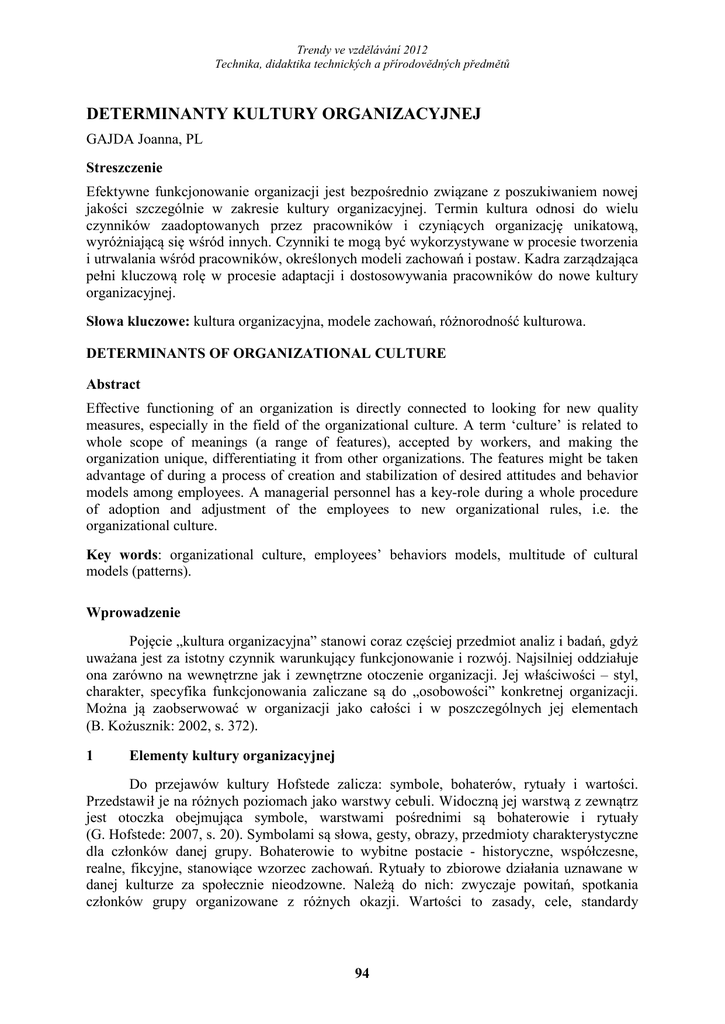 Trendy ve vzdělávání 2012 Technika, didaktika technických a přírodovědných předmětů DETERMINANTY KULTURY ORGANIZACYJNEJ GAJDA Joanna, PL Streszczenie Efektywne funkcjonowanie organizacji jest bezpośrednio związane z poszukiwaniem nowej jakości szczególnie w zakresie kultury organizacyjnej. Termin kultura odnosi do wielu czynników zaadoptowanych przez pracowników i czyniących organizację unikatową, wyróżniającą się wśród innych. Czynniki te mogą być wykorzystywane w procesie tworzenia i utrwalania wśród pracowników, określonych modeli zachowań i postaw. Kadra zarządzająca pełni kluczową rolę w procesie adaptacji i dostosowywania pracowników do nowe kultury organizacyjnej. Słowa kluczowe: kultura organizacyjna, modele zachowań, różnorodność kulturowa. DETERMINANTS OF ORGANIZATIONAL CULTURE Abstract Effective functioning of an organization is directly connected to looking for new quality measures, especially in the field of the organizational culture. A term ‘culture’ is related to whole scope of meanings (a range of features), accepted by workers, and making the organization unique, differentiating it from other organizations. The features might be taken advantage of during a process of creation and stabilization of desired attitudes and behavior models among employees. A managerial personnel has a key-role during a whole procedure of adoption and adjustment of the employees to new organizational rules, i.e. the organizational culture. Key words: organizational culture, employees’ behaviors models, multitude of cultural models (patterns). Wprowadzenie Pojęcie „kultura organizacyjna” stanowi coraz częściej przedmiot analiz i badań, gdyż uważana jest za istotny czynnik warunkujący funkcjonowanie i rozwój. Najsilniej oddziałuje ona zarówno na wewnętrzne jak i zewnętrzne otoczenie organizacji. Jej właściwości – styl, charakter, specyfika funkcjonowania zaliczane są do „osobowości” konkretnej organizacji. Można ją zaobserwować w organizacji jako całości i w poszczególnych jej elementach (B. Kożusznik: 2002, s. 372). 1 Elementy kultury organizacyjnej Do przejawów kultury Hofstede zalicza: symbole, bohaterów, rytuały i wartości. Przedstawił je na różnych poziomach jako warstwy cebuli. Widoczną jej warstwą z zewnątrz jest otoczka obejmująca symbole, warstwami pośrednimi są bohaterowie i rytuały (G. Hofstede: 2007, s. 20). Symbolami są słowa, gesty, obrazy, przedmioty charakterystyczne dla członków danej grupy. Bohaterowie to wybitne postacie - historyczne, współczesne, realne, fikcyjne, stanowiące wzorzec zachowań. Rytuały to zbiorowe działania uznawane w danej kulturze za społecznie nieodzowne. Należą do nich: zwyczaje powitań, spotkania członków grupy organizowane z różnych okazji. Wartości to zasady, cele, standardy 94 Trendy ve vzdělávání 2012 Technika, didaktika technických a přírodovědných předmětů akceptowane przez społeczeństwo i określające hierarchie ważności (A. Czermiński, M. Czerska, B. Nogalski, R. Rutka, J. Apanowicz: 2002, s. 589). Spośród zaprezentowanych przejawów kultury, trzy ujęto w kategorię praktyk. Należą do nich: symbole, bohaterowie i rytuały. Choć dostrzegane są na zewnątrz, nie każdy jest świadom ich znaczenia kulturowego. Czytelne są tylko dla członków danej kultury (G. Hofstede: 2007, s. 21). Rysunek 1. Przejawy kultury na różnych poziomach głębokości Symbole Bohaterowie Rytuały Wartości Praktyka Źródło: G. Hofstede, Kultury i organizacje, PWE, Warszawa 2007, s. 16. Najtrudniejsze do wychwycenia i zrozumienia są założenia kulturowe. Koźmiński dokonał ich podziału w zależności od tego, czego dotyczą. W organizacji funkcjonują założenia, które odwołują się do: natury ludzkiej, stosunków międzyludzkich, samej organizacji, natury otoczenia, relacji organizacji z otoczeniem (A.Koźmiński, W. Piotrowski: 1996, s. 376). Na podstawie dominujących w grupie społecznej założeń kulturowych kształtują się wartości z uwagi na które ludzie dokonują wyboru ról społecznych, oceny sytuacji (Cz. Sikorski: 2002, s. 10) Z zaprezentowanej przez Hofstede koncepcji formułowania się paradygmatów kulturowych wynika, że istotą kultury organizacyjnej są wzory zachowań. Rozwijają się one w wyniku upowszechniania postaw definiowanych w psychologii społecznej jako „trwałe predyspozycje psychiczne człowieka do określonych sposobów reagowania na określone rodzaje bodźców” (Cz. Sikorski: 2002, s. 10). Postawy odzwierciedlają stosunek do ludzi do przedmiotów i sytuacji. Zachowania ludzi w systemie organizacyjnym częściowo zależą od kulturowych wzorów myślenia. Uwarunkowania sytuacyjne z jakimi ludzie mają kontakt uważane są za najważniejsze. Realizowanie zadań w zmieniających się sytuacjach może wywołać zachowania obojętne lub sprzeczne członków organizacji z dominującą w organizacji ideologią (Cz. Sikorski: 2002, s. 10). 2 Czynniki kształtujące kulturę organizacyjną A.Koźmiński dokonał klasyfikacji czynników wpływających na kształtowanie kultury organizacyjnej. Zalicza do nich (A.Koźmiński W. Piotrowski: 1996, s. 379): Otoczenie. Wszelkie działania organizacyjne dokonują się w otoczeniu, które stanowi źródło interakcji. Nie sposób pominąć wzajemnie zachodzących zależności w organizacji z których wynika, że (Cz. Sikorski: 2002, s. 38): - pracownicy organizacji reprezentując różne cechy osobowościowe, aspiracje, oczekiwania oddziałują na siebie wzajemnie; - na pracowników i przełożonych oddziałują występujące rozwiązania organizacyjne i odnoszące się do nich wymagania; 95 Trendy ve vzdělávání 2012 Technika, didaktika technických a přírodovědných předmětů - szczególne znaczenie przypisuje się oddziaływaniu tradycji na ugruntowanie wzorów myślenia i działania. Typ organizacji. Zmiana warunków panujących 