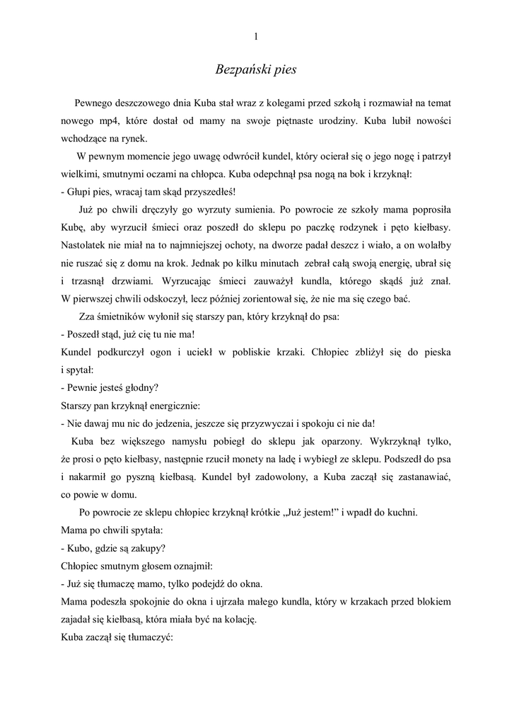 1 Bezpański pies Pewnego deszczowego dnia Kuba stał wraz z kolegami przed szkołą i rozmawiał na temat nowego mp4, które dostał od mamy na swoje piętnaste urodziny. Kuba lubił nowości wchodzące na rynek. W pewnym momencie jego uwagę odwrócił kundel, który ocierał się o jego nogę i patrzył wielkimi, smutnymi oczami na chłopca. Kuba odepchnął psa nogą na bok i krzyknął: - Głupi pies, wracaj tam skąd przyszedłeś! Już po chwili dręczyły go wyrzuty sumienia. Po powrocie ze szkoły mama poprosiła Kubę, aby wyrzucił śmieci oraz poszedł do sklepu po paczkę rodzynek i pęto kiełbasy. Nastolatek nie miał na to najmniejszej ochoty, na dworze padał deszcz i wiało, a on wolałby nie ruszać się z domu na krok. Jednak po kilku minutach zebrał całą swoją energię, ubrał się i trzasnął drzwiami. Wyrzucając śmieci zauważył kundla, którego skądś już znał. W pierwszej chwili odskoczył, lecz później zorientował się, że nie ma się czego bać. Zza śmietników wyłonił się starszy pan, który krzyknął do psa: - Poszedł stąd, już cię tu nie ma! Kundel podkurczył ogon i uciekł w pobliskie krzaki. Chłopiec zbliżył się do pieska i spytał: - Pewnie jesteś głodny? Starszy pan krzyknął energicznie: - Nie dawaj mu nic do jedzenia, jeszcze się przyzwyczai i spokoju ci nie da! Kuba bez większego namysłu pobiegł do sklepu jak oparzony. Wykrzyknął tylko, że prosi o pęto kiełbasy, następnie rzucił monety na ladę i wybiegł ze sklepu. Podszedł do psa i nakarmił go pyszną kiełbasą. Kundel był zadowolony, a Kuba zaczął się zastanawiać, co powie w domu. Po powrocie ze sklepu chłopiec krzyknął krótkie „Już jestem!” i wpadł do kuchni. Mama po chwili spytała: - Kubo, gdzie są zakupy? Chłopiec smutnym głosem oznajmił: - Już się tłumaczę mamo, tylko podejdź do okna. Mama podeszła spokojnie do okna i ujrzała małego kundla, który w krzakach przed blokiem zajadał się kiełbasą, która miała być na kolację. Kuba zaczął się tłumaczyć: 2 - Bo...mamo...ten piesek miał takie duże, smutne oczy. Nie potrafiłem przejść obok niego obojętnie...Kiełbasę odkupię, nawet za swoje kieszonkowe. Mama spojrzała na syna i łagodnym głosem powiedziała: - Przyprowadź go do domu, będzie on twoim nowym podopiecznym. Mam nadzieję, że zaopiekujesz się nim. Kuba wybiegł z domu krzycząc jak szalony do psa: - Hurrra, od dziś mieszkasz ze mną! Nazwę cię Pęto, na cześć zjedzonej kiełbasy! Cały wieczór spędzony z Pętem minął bardzo szybko. Wieczorem Kuba zadowolony leżał z pupilem w łóżku i czekał na kolejny szczęśliwy dzień. Napisała: Aleksandra Uliczek kl. II A