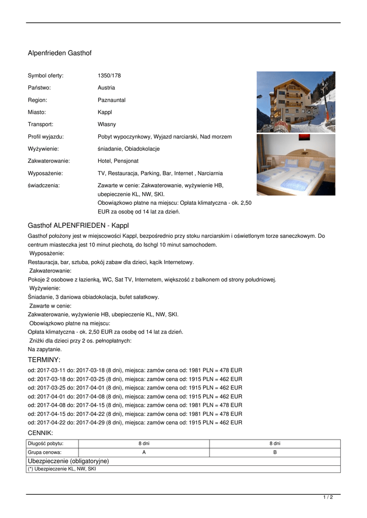 Alpenfrieden Gasthof Symbol oferty: 1350/178 Państwo: Austria Region: Paznauntal Miasto: Kappl Transport: Własny Profil wyjazdu: Pobyt wypoczynkowy, Wyjazd narciarski, Nad morzem Wyżywienie: śniadanie, Obiadokolacje Zakwaterowanie: Hotel, Pensjonat Wyposażenie: TV, Restauracja, Parking, Bar, Internet , Narciarnia świadczenia: Zawarte w cenie: Zakwaterowanie, wyżywienie HB, ubepieczenie KL, NW, SKI. Obowiązkowo płatne na miejscu: Opłata klimatyczna - ok. 2,50 EUR za osobę od 14 lat za dzień. Gasthof ALPENFRIEDEN - Kappl Gasthof położony jest w miejscowości Kappl, bezpośrednio przy stoku narciarskim i oświetlonym torze saneczkowym. Do centrum miasteczka jest 10 minut piechotą, do Ischgl 10 minut samochodem. Wyposażenie: Restauracja, bar, sztuba, pokój zabaw dla dzieci, kącik Internetowy. Zakwaterowanie: Pokoje 2 osobowe z łazienką, WC, Sat TV, Internetem, większość z balkonem od strony południowej. Wyżywienie: Śniadanie, 3 daniowa obiadokolacja, bufet sałatkowy. Zawarte w cenie: Zakwaterowanie, wyżywienie HB, ubepieczenie KL, NW, SKI. Obowiązkowo płatne na miejscu: Opłata klimatyczna - ok. 2,50 EUR za osobę od 14 lat za dzień. Zniżki dla dzieci przy 2 os. pełnopłatnych: Na zapytanie. TERMINY: od: 2017-03-11 do: 2017-03-18 (8 dni), miejsca: zamów cena od: 1981 PLN = 478 EUR od: 2017-03-18 do: 2017-03-25 (8 dni), miejsca: zamów cena od: 1915 PLN = 462 EUR od: 2017-03-25 do: 2017-04-01 (8 dni), miejsca: zamów cena od: 1915 PLN = 462 EUR od: 2017-04-01 do: 2017-04-08 (8 dni), miejsca: zamów cena od: 1915 PLN = 462 EUR od: 2017-04-08 do: 2017-04-15 (8 dni), miejsca: zamów cena od: 1981 PLN = 478 EUR od: 2017-04-15 do: 2017-04-22 (8 dni), miejsca: zamów cena od: 1981 PLN = 478 EUR od: 2017-04-22 do: 2017-04-29 (8 dni), miejsca: zamów cena od: 1915 PLN = 462 EUR CENNIK: Długość pobytu: 8 dni 8 dni Grupa cenowa: A B Ubezpieczenie (obligatoryjne) (*) Ubezpieczenie KL, NW, SKI 1/2 (*) Turystyczny Fundusz Gwarancyjny Pobyt w obiekcie (do wyboru) (*) Pokój 2 osobowy standardowo dla osób: 2 Rodzaj osoby (do wyboru) (*) Osoba dorosła 14 14 2.5 2.5 (-) (-) 448 464 Waluta: EUR Aktualne ceny z systemu S.A.R.T. (-) - cena usługi, podatku kalkulowana przy osobie lub gratis (*) - kwota wliczona w cenę standardową 2/2