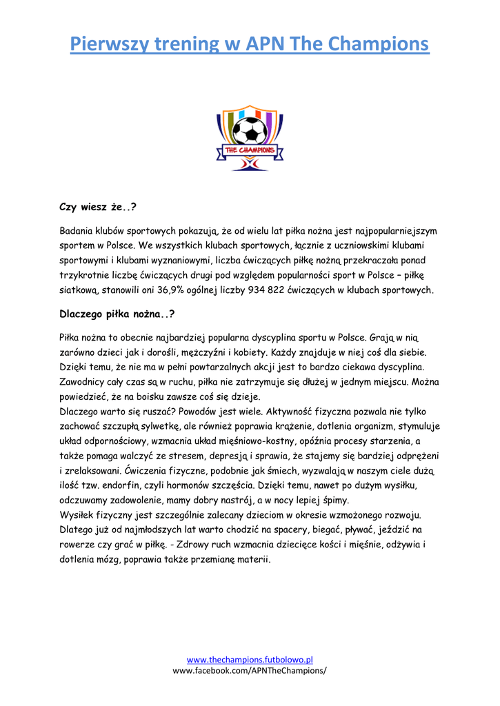 Pierwszy trening w APN The Champions Czy wiesz że..? Badania klubów sportowych pokazują, że od wielu lat piłka nożna jest najpopularniejszym sportem w Polsce. We wszystkich klubach sportowych, łącznie z uczniowskimi klubami sportowymi i klubami wyznaniowymi, liczba ćwiczących piłkę nożną przekraczała ponad trzykrotnie liczbę ćwiczących drugi pod względem popularności sport w Polsce – piłkę siatkową, stanowili oni 36,9% ogólnej liczby 934 822 ćwiczących w klubach sportowych. Dlaczego piłka nożna..? Piłka nożna to obecnie najbardziej popularna dyscyplina sportu w Polsce. Grają w nią zarówno dzieci jak i dorośli, mężczyźni i kobiety. Każdy znajduje w niej coś dla siebie. Dzięki temu, że nie ma w pełni powtarzalnych akcji jest to bardzo ciekawa dyscyplina. Zawodnicy cały czas są w ruchu, piłka nie zatrzymuje się dłużej w jednym miejscu. Można powiedzieć, że na boisku zawsze coś się dzieje. Dlaczego warto się ruszać? Powodów jest wiele. Aktywność fizyczna pozwala nie tylko zachować szczupłą sylwetkę, ale również poprawia krążenie, dotlenia organizm, stymuluje układ odpornościowy, wzmacnia układ mięśniowo-kostny, opóźnia procesy starzenia, a także pomaga walczyć ze stresem, depresją i sprawia, że stajemy się bardziej odprężeni i zrelaksowani. Ćwiczenia fizyczne, podobnie jak śmiech, wyzwalają w naszym ciele dużą ilość tzw. endorfin, czyli hormonów szczęścia. Dzięki temu, nawet po dużym wysiłku, odczuwamy zadowolenie, mamy dobry nastrój, a w nocy lepiej śpimy. Wysiłek fizyczny jest szczególnie zalecany dzieciom w okresie wzmożonego rozwoju. Dlatego już od najmłodszych lat warto chodzić na spacery, biegać, pływać, jeździć na rowerze czy grać w piłkę. - Zdrowy ruch wzmacnia dziecięce kości i mięśnie, odżywia i dotlenia mózg, poprawia także przemianę materii. www.thechampions.futbolowo.pl www.facebook.com/APNTheChampions/ Pierwszy trening w APN The Champions Dlaczego APN The Champions..? Akademia Piłki Nożnej The Champions jest nową szkółką piłkarską dla dzieci w wieku od 5 do 13 lat, działająca na terenie Gminy Świnna. Naszym podopiecznym zapewniamy przede wszystkim treningi przez zabawę oraz edukację przez sport w duchu zasad fair play na boisku i poza nim. Pierwszy trening w APN The Champions.. Pierwszy trening to zawsze duże przeżycie emocjonalne dla dzieci jak i rodziców. Próba znalezienia się w nowym otoczeniu, dostosowanie do panujących zasad czy nawiązanie kontaktu z Trenerem – osobą która będzie miała duży wpływ na rozwój i wychowanie Państwa dzieci. Aby zapewnić dziecku możliwie najlepszy komfort uczestniczenia w treningu, proszę pamiętać o kilku zasadach cechujących wzorowego rodzica: Bądź obecny/obecna na treningu, Wspieraj, chwal, dodawaj otuchy swojemu małemu sportowcowi, Pamiętaj o zabraniu ze sobą butelki wody mineralnej, Zapewnij luźny strój sportowy oraz obuwie zapewniające komfort w poruszaniu się, Nie ingeruj w pracę trenera, Idealnym momentem do rozmowy z trenerem na temat rozwoju swojego dziecka jest czas po zakończonym treningu, Udział w pierwszym miesiącu treningów APN The Champions jest bezpłatny. Nasi doświadczeni trenerzy obejmą dziecko szczególną opieką, zintegrują z grupą, a po zakończonych zajęciach przekażą niezbędne informacje na temat zapisów. Rodzice jak i same dzieci mogą w ten sposób ocenić jak bardzo podobają im się zajęcia w APN The Champions! Trener koordynator: Krzysztof Mrózek www.thechampions.futbolowo.pl www.facebook.com/APNTheChampions/