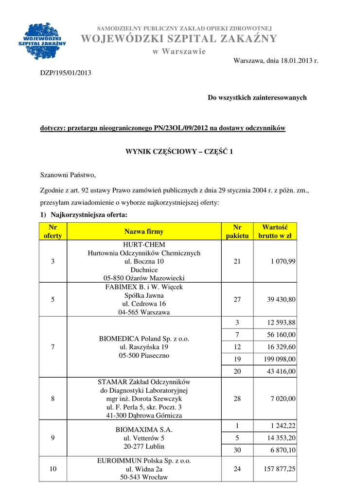 SAMODZIELNY PUBLICZNY ZAKŁAD OPIEKI ZDROWOTNEJ WOJEWÓDZKI SZPITAL ZAKAŹNY w Warszawie Warszawa, dnia 18.01.2013 r. DZP/195/01/2013 Do wszystkich zainteresowanych dotyczy: przetargu nieograniczonego PN/23OL/09/2012 na dostawy odczynników WYNIK CZĘŚCIOWY – CZĘŚĆ 1 Szanowni Państwo, Zgodnie z art. 92 ustawy Prawo zamówień publicznych z dnia 29 stycznia 2004 r. z późn. zm., przesyłam zawiadomienie o wyborze najkorzystniejszej oferty: 1) Najkorzystniejsza oferta: Nr oferty 3 5 7 Nazwa firmy HURT-CHEM Hurtownia Odczynników Chemicznych ul. Boczna 10 Duchnice 05-850 OŜarów Mazowiecki FABIMEX B. i W. Więcek Spółka Jawna ul. Cedrowa 16 04-565 Warszawa BIOMEDICA Poland Sp. z o.o. ul. Raszyńska 19 05-500 Piaseczno 8 STAMAR Zakład Odczynników do Diagnostyki Laboratoryjnej mgr inŜ. Dorota Szewczyk ul. F. Perla 5, skr. Poczt. 3 41-300 Dąbrowa Górnicza 9 BIOMAXIMA S.A. ul. Vetterów 5 20-277 Lublin 10 EUROIMMUN Polska Sp. z o.o. ul. Widna 2a 50-543 Wrocław Nr pakietu Wartość brutto w zł 21 1 070,99 27 39 430,80 3 12 593,88 7 56 160,00 12 16 329,60 19 199 098,00 20 43 416,00 28 7 020,00 1 1 242,22 5 14 353,20 30 6 870,10 24 157 877,25 11 BIOMERIEUX Polska Sp. z o.o. ul. śeromskiego 17 01-882 Warszawa EUROLAB Sp. z o.o. ul. Kleczkowska 50 50-227 Wrocław MEDAN 13 ul. ks. A. Korczoka 32 44-103 Gliwice HORIBA ABX Sp. z o.o. 14 ul. Wał Międzeszyński 598 03-994 Warszawa LINDE GAZ Polska Sp. z o.o. 15 ul. Zgrupowania AK „Kampinos" 30 01-943 Warszawa ROCHE DIAGNOSTICS POLSKA Sp. z o.o. 17 ul. WybrzeŜe Gdyńskie 6B 01-531 Warszawa JOHNSON & JOHNSON POLAND Sp. z o.o. 18 ul. IłŜecka 24 02-135 Warszawa EMAPOL Sp. z o.o. 20 ul. Budowlanych 68 80-298 Gdańsk Uzasadnienie wyboru: najniŜsza cena. 12 11 43 508,45 17 50 185,33 18 16 465,79 12a 3 853,44 25 477,90 4 90 411,12 32 81 001,08 33 7 380,00 2 59 067,77 9 36 946,80 13 38 404,80 29 13 365,00 2) Odrzucenie następujących ofert: a) b) c) d) e) RANDOX LABORATORIES LIMITED Sp. z o.o, Oddział w Polsce, ul. Puławska 405 a, 02-801 Warszawa w zakresie pakietów nr 6 i 14, gdyŜ zawiera błędy w obliczeniu ceny (art. 89 ust 1 pkt 6 ustawy Prawo zamówień publicznych z dnia 29 stycznia 2004 roku z późn. zm.). AQUA-MED. ZPAM – KOLASA Spółka Jawna, ul. Targowa 55, 90-323 Lódź w zakresie pakietu nr 28, gdyŜ jej treść nie odpowiada treści specyfikacji istotnych warunków zamówienia (art. 89 ust 1 pkt 2 ustawy Prawo zamówień publicznych z dnia 29 stycznia 2004 roku z późn. zm.). Wykonawca zaoferował test o czasie odczytu do 15 minut. BIOMAXIMA S.A., ul. Vetterów 5, 20-277 Lublin w zakresie pakietu nr 28, gdyŜ jej treść nie odpowiada treści specyfikacji istotnych warunków zamówienia (art. 89 ust 1 pkt 2 ustawy Prawo zamówień publicznych z dnia 29 stycznia 2004 roku z późn. zm.). Wykonawca zaoferował test o czasie odczytu do 15 minut. POINTE SCIENTIFIC POLSKA Sp. z o.o., ul. Rumiana 76, 02-956 Warszawa w zakresie pakietu nr 26, gdyŜ jej treść nie odpowiada treści specyfikacji istotnych warunków zamówienia (art. 89 ust 1 pkt 2 ustawy Prawo zamówień publicznych z dnia 29 stycznia 2004 roku z późn. zm.). Wykonawca zaoferował test, w którym antygeny nie są rekombinowane. EMAPOL Sp. z o.o., ul. Budowlanych 68, 80-298 Gdańsk w zakresie pakietu nr 14, gdyŜ jej treść nie odpowiada treści specyfikacji istotnych warunków zamówienia (art. 89 ust 1 pkt 2 ustawy Prawo zamówień publicznych z dnia 29 stycznia 2004 roku z późn. zm.). Zamawiający wymagał zaoferowania surowicy kontrolnej umoŜliwiającej kontrolę stęŜenia kwasów Ŝółciowych, natomiast Wykonawca zaoferował surowicę kontrolną, która nie zawiera w swoim składzie kwasów Ŝółciowych. 3) UniewaŜnienie postępowania o udzielenie zamówienia w zakresie: a) pakietów nr: 6, 8, 10, 15, 16, 22, 23, 31, gdyŜ nie złoŜono Ŝadnej oferty nie podlegającej odrzuceniu (art. 93 ust. 1 pkt 1 ustawy Prawo zamówień publicznych z dnia 29 stycznia 2004 roku z późn. zm.). b) pakietu nr: 34, gdyŜ cena najkorzystniejszej oferty przewyŜsza kwotę, którą Zamawiający moŜe przeznaczyć na sfinansowanie zamówienia (art. 93 ust. 1 pkt 4 ustawy Prawo zamówień publicznych z dnia 29 stycznia 2004 roku z późn. zm.). 4) Do upływu terminu składania ofert złoŜono 20 ofert, których zbiorcze zestawienie przedstawia poniŜsza tabela: Nr oferty 1 2 3 4 5 6 7 Nazwa firmy IDALIA Ireneusz Wolak Spółka Jawna ul. Zubrzyckiego 10 26-610 Radom RANDOX LABORATORIES LIMITED Sp. z o.o. Oddział w Polsce ul. Puławska 405a 02-801 Warszawa HURT-CHEM Hurtownia Odczynników Chemicznych ul. Boczna 10 Duchnice 05-850 OŜarów Mazowiecki DIAG-MED ul. RyŜowa 51 02-495 Warszawa FABIMEX B. i W. Więcek Spółka Jawna ul. Cedrowa 16 04-565 Warszawa AQUA-MED ZPAM - KOLASA Spółka Jawna ul. Targowa 55 90-323 Łódź BIOMEDICA Poland Sp. z o.o. ul. Raszyńska 19 05-500 Piaseczno Nr pakietu Wartość brutto w zł 21 1 909,94 6 3 975,00 14 8 064,00 21 1 070,99 34 3 690,00 27 39 430,80 28 5 529,60 3 12 593,88 7 56 160,00 12 16 329,60 19 199 098,00 20 43 416,00 8 9 10 11 STAMAR Zakład Odczynników do Diagnostyki Laboratoryjnej mgr inŜ. Dorota Szewczyk ul. F. Perla 5, skr. Poczt. 3 41-300 Dąbrowa Górnicza BIOMAXIMA S.A. ul. Vetterów 5 20-277 Lublin EUROIMMUN Polska Sp. z o.o. ul. Widna 2a 50-543 Wrocław BIOMERIEUX Polska Sp. z o.o. ul. śeromskiego 17 01-882 Warszawa 12 EUROLAB Sp. z o.o. ul. Kleczkowska 50 50-227 Wrocław 13 MEDAN ul. ks. A. Korczoka 32 44-103 Gliwice 14 15 16 17 18 19 20 HORIBA ABX Sp. z o.o. ul. Wał Międzeszyński 598 03-994 Warszawa LINDE GAZ Polska Sp. z o.o. ul. Zgrupowania AK „Kampinos" 30 01-943 Warszawa TRANSFARM Sp. z o.o. ul. Kanarkowa 20B 02-818 Warszawa ROCHE DIAGNOSTICS POLSKA Sp. z o.o. ul. WybrzeŜe Gdyńskie 6B 01-531 Warszawa JOHNSON & JOHNSON POLAND Sp. z o.o. ul. IłŜecka 24 02-135 Warszawa POINTE SCIENTIFIC POLSKA Sp. z o.o. ul. Rumiana76 02-956 Warszawa EMAPOL Sp. z o.o. ul. Budowlanych 68 80-298 Gdańsk 28 7 02