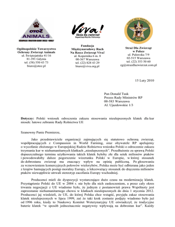 Ogólnopolskie Towarzystwo Ochrony Zwierząt Animals ul. Świętojańska 41/16 81-391 Gdynia tel. (58) 550 43 73 [email protected] Fundacja Międzynarodowy Ruch Na Rzecz Zwierząt Viva! ul. Kopernika 6 m. 8 00-367 Warszawa tel. (22) 828 43 29 [email protected] Straż Dla Zwierząt w Polsce ul. Puławska 7/9 02-515 Warszawa tel. (22) 353 50 60 [email protected] 15 Luty 2010 Pan Donald Tusk Prezes Rady Ministrów RP 00-583 Warszawa Al. Ujazdowskie 1/3 Dotyczy: Polski wniosek odroczenia zakazu stosowania nieulepszonych klatek dla kur niosek: lutowe zebranie Rady Rolnictwa UE Szanowny Panie Premierze, Jako przedstawiciele organizacji zajmujących się statutowo ochroną zwierząt, współpracujących z Compassion in World Farming, oraz obywatele RP apelujemy o wycofanie złożonego w Europejskiej Radzie Rolnictwa wniosku Polski o odroczenie zakazu trzymania kur w niehumanitarnych klatkach „nieulepszonych”. Przedłużenie za sprawą Polski dopuszczalnego terminu użytkowania takich klatek byłoby złe dla setek milionów ptaków i powodowałoby dalsze pogorszenie wizerunku Polski w Europie, w której stosunek do dobrostanu zwierząt ma znaczący wpływ na opinię publiczną. Po głosowaniu za wznowieniem komercyjnych połowów wielorybów, Polska może być odbierana jako jeden z krajów hamujących postęp moralny Europy, a lekceważący stosunek do dręczenia milionów ptaków niewątpliwie utrwali stereotyp zacofania Europy wschodniej. Producenci mieli do dyspozycji wystarczająco dużo czasu na modernizację klatek. Przystąpienie Polski do UE w 2004 r. nie było dla nich zaskoczeniem, a przez cały okres trwania negocjacji z UE wiadomo było, że jednym z postanowień prawa Wspólnoty jest zaprzestanie niehumanitarnego chowu w klatkach nieulepszonych do dnia 1 stycznia 2012. Producenci jaj wiedzieli, że UE, do której Polska chce wstąpić, przyjęła zakaz stosowania klatek nieulepszonych w lipcu 1999, zaś że taki krok zostanie podjęty wiadomo było już od 1996 roku, kiedy to Naukowy Komitet Weterynaryjny UE oświadczył, że tradycyjne baterie klatek “w sposób jednoznacznie negatywny wpływają na dobrostan kur”. Każdy producent, który zainwestował w niehumanitarne klatki w latach 1997-2003 podejmował nieetyczną decyzję na własne ryzyko, i nie powinien oczekiwać zysków z odsunięcia terminu spodziewanego zakazu. Dlatego uzasadnianie wniosku Polski kredytami zaciągniętymi przez producentów jaj na wyposażenie kurników w latach 1997-2003 w naszej ocenie jest nie do przyjęcia. Polska uzasadnia wniosek o odroczenie zakazu trudnościami w zastąpieniu starych klatek do 1 stycznia 2012. Wiadomo jednak, że w Niemczech, gdzie zakaz obowiązuje od końca 2009 r., wielu producentów wprowadziło zmiany dopiero w ciągu 6 miesięcy przed jego wejściem w życie. Zakaz stosowania klatek nieulepszonych jest poparty badaniami naukowymi. Zarówno raport Europejskiego Urzędu ds. Bezpieczeństwa Żywności z 2005 r (The welfare aspects of various systems of keeping laying hens) jak i raport LayWel z 2006 r. (Welfare implications for changes in production systems for laying hens) dowodzą jednoznacznie, że stosowanie klatek nieulepszonych ma zdecydowanie negatywny wpływ na dobrostan niosek. Odroczenie wprowadzenia w życie zakazu byłoby niesprawiedliwe dla tych producentów, którzy już wprowadzili zmiany zgodne z Dyrektywą Rady 1999/74/WE ustanawiająca minimalne normy ochrony kur niosek. Jak wskazała Komisja Europejska w raporcie z 2008, jakiekolwiek odroczenie wprowadzenia zakazu zaburzyłoby konkurencję na niekorzyść tych producentów, którzy kierując się intencją respektowania prawa już zainwestowali w systemy alternatywne lub wzbogacone klatki. Rolnicy, którzy do ostatniej chwili czekają z wprowadzeniem koniecznych zmian, nie powinni być premiowani za opóźnienia. Takie podejście kwestionowałoby wiarygodność prawa Europejskiego i zachęcałoby producentów z innych sektorów do odraczania restrukturyzacji, poprzez niedotrzymywanie wyznaczonych terminów. Podsumowując, apelujemy do Pana Premiera o wycofanie wniosku o odroczenie zakazu stosowania niehumanitarnych klatek jako pozbawionego uzasadnienia, nieetycznego i narażającego Polskę na krytykę. Z wyrazami szacunku Prezes OTOZ Animals Ewa Gebert Prezes Fundacji Międzynarodowy Ruch na Rzecz Zwierząt - VIVA! Polska Cezary Wyszyński Komendant Główny Straży dla Zwierząt Mateusz Jakub Janda Do Wiadomości: Ministerstwo Rolnictwa i Rozwoju Wsi