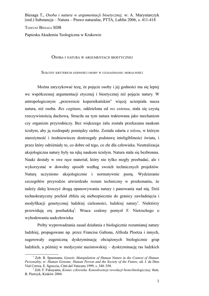 Biesaga T., Osoba i natura w argumentacji bioetycznej, w: A. Maryniarczyk (red.) Substancja – Natura – Prawo naturalne, PTTA, Lublin 2006, s. 411-418 TADEUSZ BIESAGA SDB Papieska Akademia Teologiczna w Krakowie OSOBA I NATURA W ARGUMENTACJI BIOETYCZNEJ SUKCESY KRYTERIUM GODNOŚCI OSOBY W UZASADNIANIU MORALNOŚCI Można zaryzykować tezę, że pojęcie osoby i jej godności ma się lepiej we współczesnej argumentacji etycznej i bioetycznej niż pojęcie natury. W antropologicznym „przewrocie kopernikańskim” więcej ucierpiała nasza natura, niż osoba. Res cogitans, oddzielona od res extensa, stała się czystą rzeczywistością duchową. Straciła na tym natura traktowana jako mechanizm czy organizm przyrodniczy. Bez większego żalu została przekazana naukom ścisłym, aby ją rozdrapały pomiędzy siebie. Została odarta z telosu, w którym starożytność i średniowiecze dostrzegały podstawę inteligibliności świata, i przez który odróżniały to, co dobre od tego, co złe dla człowieka. Neutralizacja aksjologiczna natury były na rękę naukom ścisłym. Natura stała się bezbronna. Nauki dostały w swe ręce materiał, który nie tylko mogły przebadać, ale i wykorzystać w dowolny sposób według swoich technicznych projektów. Naturę uczyniono aksjologicznie i normatywnie pustą. Wydzieranie szczegółów przyrodzie utwierdzało rozum techniczny w przekonaniu, że należy dalej kroczyć drogą opanowywania natury i panowania nad nią. Dziś technokratyczny pochód zbliża się niebezpiecznie do granicy zawładnięcia i modyfikacji genetycznej ludzkiej cielesności, ludzkiej natury1. Niektórzy przewidują erę postludzką2. Wraca szalony pomysł F. Nietzschego o wyhodowaniu nadczłowieka. Próby wyprowadzania zasad działania z biologicznie rozumianej natury ludzkiej, propagowane np. przez Francisa Galtona, Alfreda Ploetza i innych, sugerowały eugeniczną dyskryminację obciążonych biologicznie grup ludzkich, a później w medycynie nazistowskiej – dyskryminację ras ludzkich 1 Zob. R. Spaemann, Genetic Manipulation of Human Nature in the Context of Human Personality, w: Human Genome, Human Person and the Society of the Future, ed. J. de Dios Vial Correa, E. Sgreccia, Città del Vaticano 1999, s. 340–350. 2 Zob. F. Fukuyama, Koniec człowieka. Konsekwencje rewolucji biotechnologicznej, tłum. B. Pietrzyk, Kraków 2004. 1 Biesaga T., Osoba i natura w argumentacji bioetycznej, w: A. Maryniarczyk (red.) Substancja – Natura – Prawo naturalne, PTTA, Lublin 2006, s. 411-418 uznanych za niższe3. Wyzwolona przed II wojną światową eugenika, chcąca zachować biologicznie lepszych, a eliminować biologicznie gorszych, osiągnęła apogeum w zbrodniach nazizmu. Ich rozmiar wstrząsnął ludzkością, a po zakończeniu II wojny światowej stanął u początku zrywu moralnego. Przeciw tym nadużyciom odwołano się na nowo do pojęcia ludzkiej godności. Powszechna Deklaracja Praw Człowieka ONZ z 1948 roku mówiąc o przyrodzonej godności wszystkich członków wspólnoty ludzkiej, łączy jeszcze godność z naturą ludzką, ale inne deklaracje, konwencje i konstytucje państw pomijają naturę i prawo naturalne na rzecz samej godności osoby jako zasadniczego kryterium dobra moralnego. Łatwo zauważyć sukces kryterium godności ludzkiej na terenie etyki indywidualnej, społecznej czy w dziedzinie życia politycznego. Jednym z powodów tego sukcesu są wydarzenia historyczne. To, do czego prowadzi zaprzeczenie jednakowej godności wszystkich ludzi, pokazał nazizm. Rasowa, eugeniczna, dyskryminująca polityka nazistów, w której uczestniczyła również medycyna naukowa tego okresu, pokazały, że zaprzeczenie równej godności wszystkich ludzki prowadzi do ludobójstwa. Aby takim praktykom zapobiec w przyszłości, równą godność osoby ludzkiej wpisano do Deklaracji Praw Człowieka, konstytucji krajów europejskich, do Europejskiej Konwencji Bioetycznej i innych dokumentów stojących u podstaw współczesnej demokracji. Nie wiemy, jak długo ten zryw moralny się utrzyma. Pojęcie godności osoby połączyło i przeniosło w czasy współczesne judeo-grecko-rzymsko-chrześcijańską tradycję moralną. Złagodziło konflikt nowożytności ze średniowieczem. Myśl nowożytna szczyci się do dziś tym pojęciem, wypisując je na swych sztandarach wolności i wyzwolenia spod potęgi struktur ucisku i państwa – Lewiatana. Pojęcie osoby i jej godności połączyło filozofów różnych nurtów filozoficznych. Mimo różnic w założeniach epistemologicznych i metafizycznych wielu filozofów włączało się w ruch personalizmu jako taki. Pojęcie godności połączyło też polityków, którzy do dziś odmieniają to słowo przez wszystkie przypadki. Można się zgodzić z F. Fukuyamą, który twierdzi, że „innym ważnym 3 Zob. S. Sterkowicz, Zbrodnicze eksperymenty medyczne w obozach koncentracyjnych Trzeciej Rzeszy, Warszawa 1981; D. J. Kevles, In the Name of Eugenics, Cambridge (Mass.) 2001; E. Black, Wojna przeciw słabym. Eugenika i amerykańska kampania na rzecz stworzenia rasy panów, tłum. H. Jankowska, Warszawa 2004. 2 Biesaga T., Osoba i natura w argumentacji bioetycznej, w: A. Maryniarczyk (red.) Substancja – Natura – Prawo naturalne, PTTA, Lublin 2006, s. 411-418 powodem trwałości koncepcji powszechnej godności ludzkiej jest coś, co można nazwać naturą samej natury. Wiele powodów, dla których kiedyś odmawiano godności ludzkiej pewnym grupom, zostało zdemaskowanych jako uprzedzenia lub odkryto ich kulturalne czy środowiskowe uwarunkowania, które można było zmienić”4. Uprzedzenia ze względu na kolor skóry czy kulturę wykorzystane dla kolonizacji Indian czy Czarnego Lądu, zdemaskowano jako przemoc militarną i kulturową jednych narodów wobec drugich. Dziś w imię tej samej godności wszystkich ludzi odrzuca się tego typu dyskryminujące działania względem innych ras, narodów i kultur. O tym, że godn