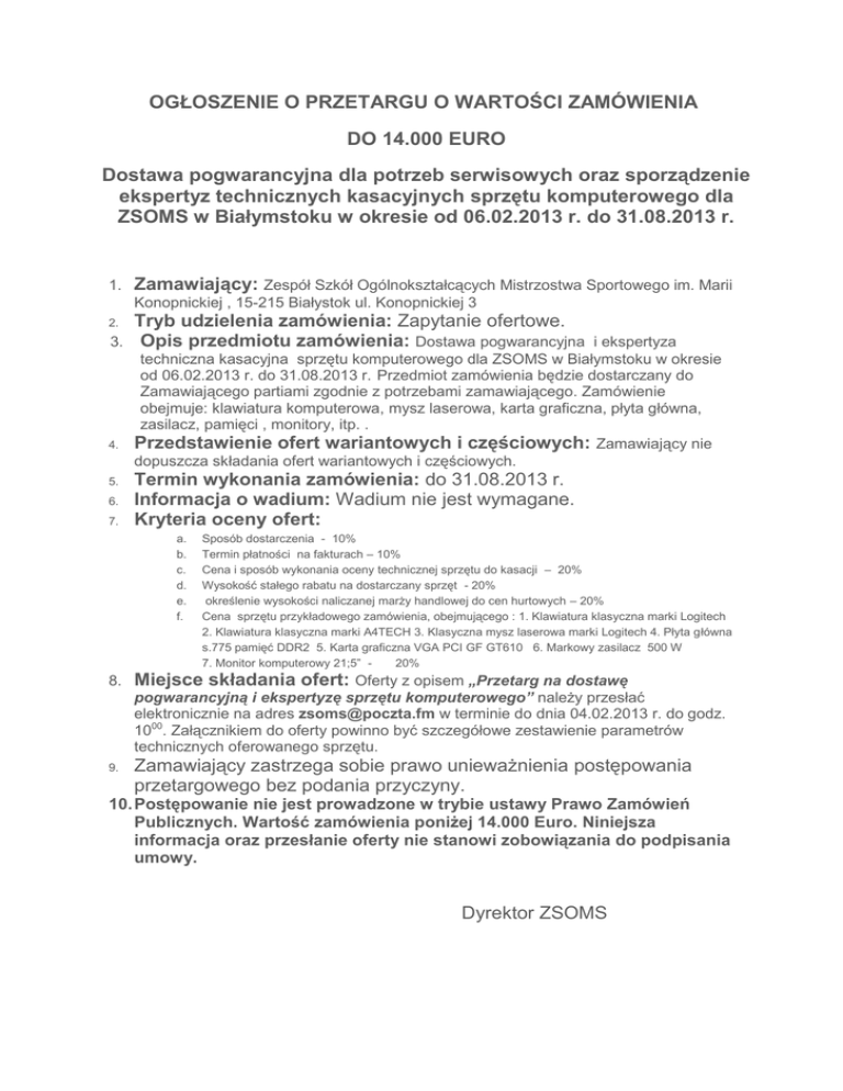 OGŁOSZENIE O PRZETARGU O WARTOŚCI ZAMÓWIENIA DO 14.000 EURO Dostawa pogwarancyjna dla potrzeb serwisowych oraz sporządzenie ekspertyz technicznych kasacyjnych sprzętu komputerowego dla ZSOMS w Białymstoku w okresie od 06.02.2013 r. do 31.08.2013 r. 1. Zamawiający: Zespół Szkół Ogólnokształcących Mistrzostwa Sportowego im. Marii Konopnickiej , 15-215 Białystok ul. Konopnickiej 3 2. 3. 4. 5. 6. 7. Tryb udzielenia zamówienia: Zapytanie ofertowe. Opis przedmiotu zamówienia: Dostawa pogwarancyjna i ekspertyza techniczna kasacyjna sprzętu komputerowego dla ZSOMS w Białymstoku w okresie od 06.02.2013 r. do 31.08.2013 r. Przedmiot zamówienia będzie dostarczany do Zamawiającego partiami zgodnie z potrzebami zamawiającego. Zamówienie obejmuje: klawiatura komputerowa, mysz laserowa, karta graficzna, płyta główna, zasilacz, pamięci , monitory, itp. . Przedstawienie ofert wariantowych i częściowych: Zamawiający nie dopuszcza składania ofert wariantowych i częściowych. Termin wykonania zamówienia: do 31.08.2013 r. Informacja o wadium: Wadium nie jest wymagane. Kryteria oceny ofert: a. b. c. d. e. f. 8. Sposób dostarczenia - 10% Termin płatności na fakturach – 10% Cena i sposób wykonania oceny technicznej sprzętu do kasacji – 20% Wysokość stałego rabatu na dostarczany sprzęt - 20% określenie wysokości naliczanej marży handlowej do cen hurtowych – 20% Cena sprzętu przykładowego zamówienia, obejmującego : 1. Klawiatura klasyczna marki Logitech 2. Klawiatura klasyczna marki A4TECH 3. Klasyczna mysz laserowa marki Logitech 4. Płyta główna s.775 pamięć DDR2 5. Karta graficzna VGA PCI GF GT610 6. Markowy zasilacz 500 W 7. Monitor komputerowy 21;5” 20% Miejsce składania ofert: Oferty z opisem „Przetarg na dostawę pogwarancyjną i ekspertyzę sprzętu komputerowego” należy przesłać elektronicznie na adres [email protected] w terminie do dnia 04.02.2013 r. do godz. 1000. Załącznikiem do oferty powinno być szczegółowe zestawienie parametrów technicznych oferowanego sprzętu. 9. Zamawiający zastrzega sobie prawo unieważnienia postępowania przetargowego bez podania przyczyny. 10. Postępowanie nie jest prowadzone w trybie ustawy Prawo Zamówień Publicznych. Wartość zamówienia poniżej 14.000 Euro. Niniejsza informacja oraz przesłanie oferty nie stanowi zobowiązania do podpisania umowy. Dyrektor ZSOMS