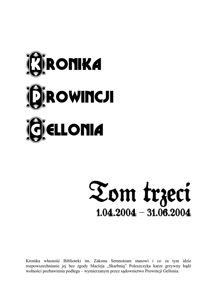 Kronika Prowincji Gellonia Tom trzeci 1.04.2004 31.06.2004 Kronika własność Biblioteki im. Zakonu Semnoteam stanowi i co za tym idzie rozpowszechnianie jej bez zgody Macieja „Skarbniq” Poleszczyka karze grzywny bądź wolności pozbawienia podlega – wymierzanym przez sądownictwo Prowincji Gellonia. Czwartek, 1 kwiecień 2004 r. K ryzysu poważnego w Prowincji ciąg dalszy. Nie jest to niestety Prima Aprilis. Piątek, 2 kwiecień 2004 r. C isza u Nas jak po potopie.... Sobota, 3 kwiecień 2004 r. S alwador do wyborów Gellonię chce poderwać lecz odzew nijaki i komitetu naszego raczej nie będzie. Niedziela, 4 kwiecień 2004 r. L otnisko Nasi oficjele chcą budować w Ferze. Spór mały o podział kompetencji w tej kwestii się wywiązał. Minister chce się tym zająć lecz i Namiestnik pokazać swą aktywność pragnie. S armacki Ruch Monarchistyczny KORONA Diuk Kościński do życia powołał. Zaprasza Gellonów wszystkich do współpracy przy tym projekcie. Sobota, 10 kwiecień 2004 r. P o niemal tygodniowym milczeniu iskra życia zaćmiła się powróciła, a Wojciecha oczekiwana zobaczymy na naszej liście. Sprawa Lotniska dokładniej propozycja spółki Groport Stempniewicza. Kwota przezeń dosyć wygórowana się wydaje.... Poniedziałek, 12 kwiecień 2004 r. R adykalna Organizacja Utopijna RAJ odezwę do ludu Gellońskiego ogłosiła. Do zmian wzywa, błędy wytyka i projekty ustaw zapowiada. Co by nie mówić to wszelka inicjatywa Gellonii teraz jest potrzebna. Wtorek, 13 sierpień 2004 r. P od czujnym okiem rewolucjonistów władze Prowincji obudziły się z letargu. Śmiałe hasła socjalistyczne gwarantujące domy i żywność dla każdego Gellończyka odświeżyły pamięć Namiestnikowi i ten w końcu ogłosił wygaśnięcie kadencji Rady Stanu. Diuk również Sędziego Leo zaczął szukać.... strach władzy w oczy zajrzał. P remier prowincji kategorycznie odrzucił możliwość wydania paru tysięcy na lotnisko... Wszystko przez monopol Groportu i jego cen dyktat. N amiestnik prężąc muskuły rządzącego układu do nowej Rady Stanu powołał Kamila Sidzinę i wybory rozpisał. Czwartek, 15 kwiecień 2004 r. P remier rekomendował do Rady Stanu Abraxasa, oczekując od niego dobrej krytyki. Namiestnik zaś wzywa Gellonów do zgłaszania swych kandydatur. D wie ustawy RAJ zaproponował. Pierwsza to Ciepłe i Puchate, zaś druga ma na celu rozdawnictwo ziemi i domów mieszkańcom Gellonii. N amiestnik siedziby dla WIDu i dla siebie szuka. Działkę w Krezie chce kupić i tam się pobudować. Piątek, 16 kwiecień 2004 r. J ednego tylko kandydata mamy do Rady Stanu, co Namiestnikowi się wcale nie podoba i prosi Gellonów o zgłaszanie się. N amiestnik, na wniosek Premiera, odwołał Ministra Dagoberta, któremu życiowe trudności nie pozwoli.ły na dłu.żej z nami pozostać. Sobota, 17 kwiecień 2004 r. C zy Avi podoła tak wielu obowiązkom ... to pytanie męczy Abraxasa. Premier nasz za to problemu nie widzi i obaw żadnych nie ma.. Poniedziałek, 19 kwiecień 2004 r. N amiestnik wyniki wyborów obwieścił. Avi i Wieniek w radzie zasiedli obok Kamila i Abraxasa wcześniej powołanych. P remier prosi Ministra o powołanie komisji przetargowej gdyż drogi w Gellonii chce budować. Wtorek, 20 kwiecień 2004 r. P remier uchwałę o Ciepłym i Puchatym ponownie przedstawił. Głosowanie chce zarządzić od północy, o ile poważnych poprawek nie będzie. Środa, 21 kwiecień 2004 r. N a podpis Namiestnika czeka skład Komisji Przetargowej, a więc połączenie drogą Feru z Krezem staje się coraz bliższe. Czwartek, 22 kwiecień 2004 r. N amiestnik ustawę o Ciepłym i Puchatym podpisał. Kandydatów do medalu teraz szukamy. K omisja przetargowa swojego przewodniczącego wyłania. Niedziela, 25 kwiecień 2004 r. P rzetarg na budowę drogi między Ferem a Krezem rozpisano. Trzydzieści sześć kilometrów drogi ekspresowej najdłuższym odcinkiem w Księstwie będzie. Poniedziałek, 26 kwiecień 2004 r. P remier wystąpił do Ministra FGiT o hasło do konta prowincji i niewielki ferment z tego wyniknął. U stawa co ziemie ma za darmo Gellonom rozdawać ponownie na listę wypłynęła. Namiestnik sprzeciwem zareagował, gdyż on za swoją działkę zapłacił, więc czemu inni mieliby mieć za darmo. Środa, 29 kwiecień 2004 r. M edal Ciepłego i Puchatego przyznawać mamy. Tymczasem spór o sposób wyboru największą od dawna kłótnię rozpętał. MFGiT dymisją grozi.... Czyżby kryzys rządowy miał się Gellonii przytrafić. Premier na urlop się udał.... Czwartek, 30 kwiecień 2004 r. K amper rezerwat indiański chce założyć. Imię dzikiego dzikiego siedzącego misia przybrał. Niedziela, 2 maj 2004 r. P remier urlop swój przedłużył, gdyż Namiestnika reakcji na kryzys rządowy ciągle doczekać się nie może. Poniedziałek, 3 maj 2004 r. R eferendum o wotum zaufania dla Premiera będziemy mieli. Pomysł to Namiestnika. N amiestnik uprawnienia swe chce powiększyć i stosowny edykt przygotował. Piątek, 7 maj 2004 r. W yniki referendum znamy. Cztery za Premierem, jeden przeciwko i dwa się wstrzymujące. A więc nie czekają nas gwałtowne zmiany. Sobota, 8 maj 2004 r. P remier po otrzymaniu przyzwolenia społecznego do pracy się aktywniej zabrał. Poprawki do CiP oraz Zamówień przedstawił. Te ostatnie, co tradycją się już staje, przez Abraxasa są kontestowane. Niedziela, 9 maj 2004 r. P onownie przetarg na drogę Fer Krez rozpisano. Poprzedni z braku oferentów unieważniony został. Dyskusja o poprawce do Zamówień Publicznych trwa niezmiennie pomiędzy Premierem a MFGiT. Poniedziałek, 10 maj 2004 r. G wardię przyboczną dla Namiestnika Premier chce utworzyć. terrorystycznych.. Może boji się ataków Wtorek, 11 maj 2004 r. G łosowanie nad nową postacią Ciepłego i Puchatego rozpoczęliśmy. Daje ona większą swobodę w sposobie procedowania jak i datę święta przesuwa na pierwszy dzień czerwca. S alwador swoje refleksje