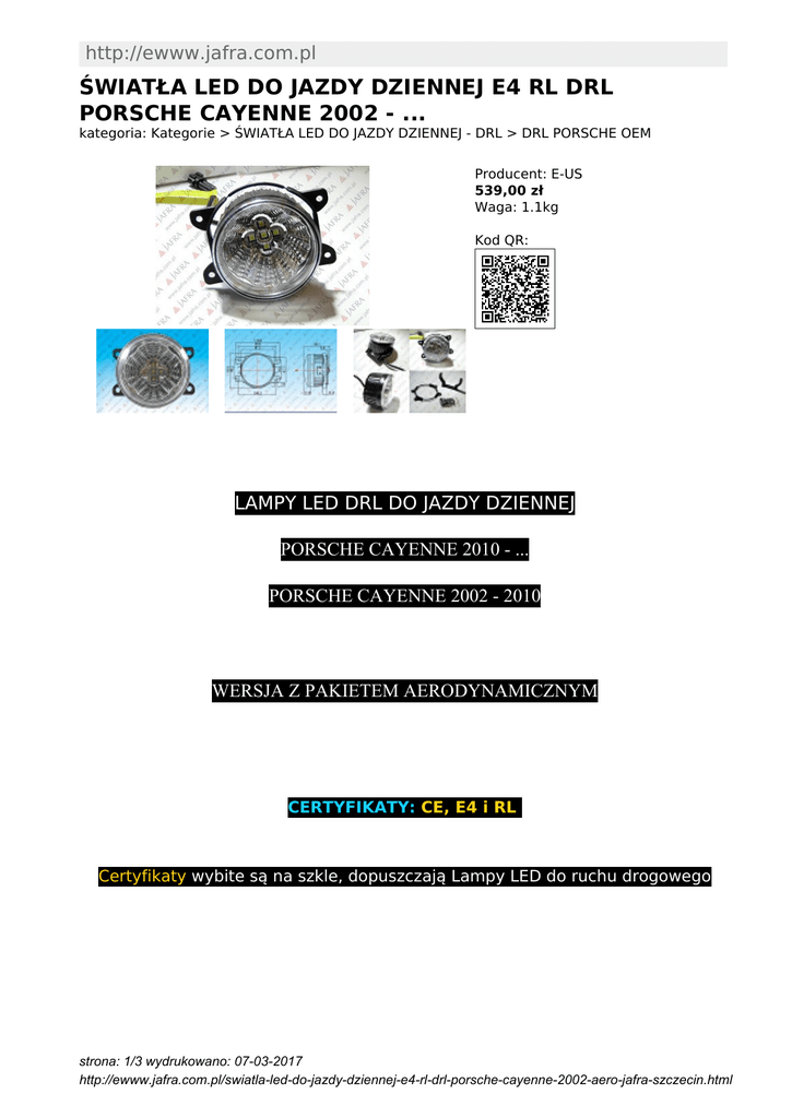 http://ewww.jafra.com.pl ŚWIATŁA LED DO JAZDY DZIENNEJ E4 RL DRL PORSCHE CAYENNE 2002 - ... kategoria: Kategorie > ŚWIATŁA LED DO JAZDY DZIENNEJ - DRL > DRL PORSCHE OEM Producent: E-US 539,00 zł Waga: 1.1kg Kod QR: LAMPY LED DRL DO JAZDY DZIENNEJ PORSCHE CAYENNE 2010 - ... PORSCHE CAYENNE 2002 - 2010 WERSJA Z PAKIETEM AERODYNAMICZNYM CERTYFIKATY: CE, E4 i RL Certyfikaty wybite są na szkle, dopuszczają Lampy LED do ruchu drogowego strona: 1/3 wydrukowano: 07-03-2017 http://ewww.jafra.com.pl/swiatla-led-do-jazdy-dziennej-e4-rl-drl-porsche-cayenne-2002-aero-jafra-szczecin.html Oferowany Towar jest Nowy, Fabrycznie Zapakowany !!! SPECYFIKACJA TECHNICZNA LAMP LED DRL: Marka / Model: PORSCHE CAYENNE - 09.2002 - 03.2010 / Wersja z Pakietem Aerodynamicznym PORSCHE CAYENNE - 2010 - .... Zastosowanie: Zamiennik oryginalnych halogenów VALEO - NUMER OE 955 631 163 00 Przy zastosowaniu rozwi?zania DRL, nale?y zastosowa? zamiast ?arówek halogenowych rezystory dedykowane pod ?a rówki H11, w celu wyeliminowania b??dów na komputerze Funkcja ?wiate? mijania pozostanie nieaktywna Zasilanie: 12V - Modu? Zasilaj?cy Czas pracy / Homologacja: Do 50000h / E4 RL na Szkle Temp. barwy ?wiat?a / Jasno?? ?wiat?a DRL: Bia?y 6000 - 6700K / 750 - 800 Cd. wg. Norm Homologacji RL Wymiary: 87.60mm x 68.1mm Technologia ?arówek: LED SMD EPISTAR - 1W x 5szt Du?a Jasno?? i Efektywno?? ZESTAW LAMP LED DRL DO JAZDY DZIENNEJ ZAWIERA: 1. Dwie Lampy DRL - Led 6000 - 6700K - nie pokazuj? b??dów na komputerze - Wysoka jako?? wykonania 2. Dwa uchwyty uniwersalne, Dwa uchwyty dedykowane - 4 USZY - w tej opcji jest to dok?adny zamiennik oryginalnych halogenów VALEO w sensie formy i kszta?tu 3. Wi?zka pod??czeniowa z modu?em zasilaj?cym z funkcj? ( 2 opcje do wyboru ) - DRL ?wiat?a dzienne z funkcj? ?wiate? postojowych ( przygasaj? do postojówki ) strona: 2/3 wydrukowano: 07-03-2017 http://ewww.jafra.com.pl/swiatla-led-do-jazdy-dziennej-e4-rl-drl-porsche-cayenne-2002-aero-jafra-szczecin.html - DRL ?wiat?a dzienne - tylko 4. Pisemna gwarancja wystawiana przez nasz? firm? - 12 m-cy 5. Oryginalne opakowanie ?wiat?a dzienne DRL ?WIAT?A DRL D0 JAZDY DZIENNEJ , to rozwi?zanie pozwalaj?ce na uwolnienie si? od ci?g?ego pami?tania o w??czaniu ?wiate? mijania, jak równie? pozwala zaoszcz?dzi? pewne elektryczne podzespo?y samochodu, m.in. ?arówki o?wietlenia ( ??cznie przy w??czonych ?wiat?ach mijania o?wietlenie ci?gnie oko?o 200W ), alternator i akumulator ( ci?g?e obci??enie 200W powoduje ich szybsze zu?ycie ), ci?g?a praca alternatora pod obci??eniem 200W wp?ywa na zwi?kszone zu?ycie paliwa. Reasumuj?c - ?wiat?a dzienne DRL po za kosztem zakupu, to same plusy i oszcz?dno??, a najwa?niejszy to komfort i wygoda oraz oszcz?dno?? paliwa, podzespo?ów elektrycznych i elektronicznych oraz pieni?dzy nie wydanych na cz?sto przepalaj?ce si? ?arówki o?wietlenia g?ównego ( halogeny i Xenon ) pomocniczego ( o?wietlenie wn?trza, ?arówki pozycyjne itp ). strona: 3/3 wydrukowano: 07-03-2017 http://ewww.jafra.com.pl/swiatla-led-do-jazdy-dziennej-e4-rl-drl-porsche-cayenne-2002-aero-jafra-szczecin.html