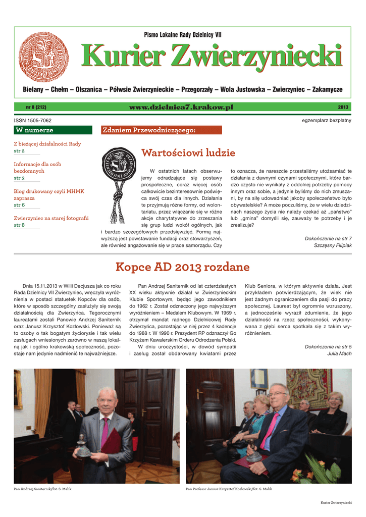 nr 8 (212) W numerze 2013 Zdaniem Przewodniczącego: Z bieżącej działalności Rady str 2 Informacje dla osób bezdomnych str 3 Blog drukowany czyli MHMK zaprasza str 6 Zwierzyniec na starej fotografii str 8 Wartościowi ludzie W ostatnich latach obserwujemy odradzające się postawy prospołeczne, coraz więcej osób całkowicie bezinteresownie poświęca swój czas dla innych. Działania te przyjmują różne formy, od wolontariatu, przez włączanie się w różne akcje charytatywne do zrzeszania się grup ludzi wokół ogólnych, jak i bardzo szczegółowych przedsięwzięć. Formą najwyższą jest powstawanie fundacji oraz stowarzyszeń, ale również angażowanie się w prace samorządu. Czy to oznacza, że nareszcie przestaliśmy utożsamiać te działania z dawnymi czynami społecznymi, które bardzo często nie wynikały z oddolnej potrzeby pomocy innym oraz sobie, a jedynie byliśmy do nich zmuszani, by na siłę udowadniać jakoby społeczeństwo było obywatelskie? A może poczuliśmy, że w wielu dziedzinach naszego życia nie należy czekać aż „państwo” lub „gmina” domyśli się, zauważy te potrzeby i je zrealizuje? Dokończenie na str 7 Szczęsny Filipiak Kopce AD 2013 rozdane Dnia 15.11.2013 w Wilii Decjusza jak co roku Rada Dzielnicy VII Zwierzyniec, wręczyła wyróżnienia w postaci statuetek Kopców dla osób, które w sposób szczególny zasłużyły się swoją działalnością dla Zwierzyńca. Tegorocznymi laureatami zostali Panowie Andrzej Saniternik oraz Janusz Krzysztof Kozłowski. Ponieważ są to osoby o tak bogatym życiorysie i tak wielu zasługach wniesionych zarówno w naszą lokalną jak i ogólno krakowską społeczność, pozostaje nam jedynie nadmienić te najważniejsze. Pan Andrzej Saniternik/fot. S. Malik Pan Andrzej Saniternik od lat czterdziestych XX wieku aktywnie działał w Zwierzynieckim Klubie Sportowym, będąc jego zawodnikiem do 1962 r. Został odznaczony jego najwyższym wyróżnieniem – Medalem Klubowym. W 1969 r. otrzymał mandat radnego Dzielnicowej Rady Zwierzyńca, pozostając w niej przez 4 kadencje do 1988 r. W 1990 r. Prezydent RP odznaczył Go Krzyżem Kawalerskim Orderu Odrodzenia Polski. W dniu uroczystości, w dowód sympatii i zasług został obdarowany kwiatami przez Klub Seniora, w którym aktywnie działa. Jest przykładem potwierdzającym, że wiek nie jest żadnym ograniczeniem dla pasji do pracy społecznej. Laureat był ogromnie wzruszony, a jednocześnie wyraził zdumienie, że jego działalność na rzecz społeczności, wykonywana z głębi serca spotkała się z takim wyróżnieniem. Dokończenie na str 5 Julia Mach Pan Profesor Janusz Krzysztof Kozłowski/fot. S. Malik Kurier Zwierzyniecki 2 Z bieżącej działalności Rady W dniu 22 października 2013 r. odbyła się XLVI sesja Rady Dzielnicy VII Zwierzyniec. Podjęto następujące uchwały: Uchwała nr XLVI/505/2013 w sprawie powołania przewodniczącego Komisji Edukacji Rady Dzielnicy VII Zwierzyniec (przewodniczącym komisji został radny Paweł Kajfasz) Uchwała nr XLVI/506/2013 w sprawie listy rankingowej zadań powierzonych z zakresu „modernizacja ogródków jordanowskich” oraz „tworzenie zieleńców i skwerów wraz z małą architekturą” na 2014 r. (ustalono następującą listę zadań: 1) bieżące utrzymanie ogródków jordanowskich oraz zieleńców i skwerów wraz z małą architekturą: ogródki jordanowskie: ul. Prusa, ul. Prusaprzy Szkole Podstawowej nr 31, os. Przegorzały – ul. Kamedulska, ul. Bielańska / ul. Orla – Na Górkach, os. Bielany-Celiny – ul. Księcia Józefa, ul. Kosmowskiej (wraz ze skarpą), ul. Chełmska – przy Klubie Kultury „Chełm”, al. Focha, ul. Korzeniaka 18 – na terenie szkoły Sióstr Pijarek, zieleńce i skwery: ul. Kamedulska przy przychodni, ul. Królowej Jadwigi przy przychodni, ul. Pajęcza – ul. Księcia Józefa, ul. Księcia Józefa – pas technologiczny oraz teren zielony pomiędzy nowym przebiegiem i dawną (ślepą) trasą ul. Księcia Józefa, przed światłami drogowymi, ul. Jodłowa – Skibowa, al. Focha – teren pomiędzy ogródkiem jordanowskim i wałem rzeki Rudawy, al. Focha – pobocze – strona lewa za mostem na rzece Rudawie, przejście dla pieszych pomiędzy ulicami Królowej Jadwigi i Ciechanowskiego, ul. Senatorska – działka po stronie parzystej na wysokości budynku nr 23, ul. Morawskiego – skwerek przy stacji trafo, ul. Kościuszki u wylotu ul. Syrokomli, 2) uzupełnienie doposażenia istniejących ogródków jordanowskich według wskazań Dzielnicy, 3) pielęgnacja i nasadzenia zieleni niskiej i wysokiej według wskazań Dzielnicy, 4) realizacja kolejnego etapu budowy ogródka jordanowskiego i placu zabaw przy ul. Jodłowej oraz ogródka na terenie Szkoły Podstawowej nr 31, 5) wykonanie ogrodzeń zieleńców w obrębie chodników, według wskazań Dzielnicy, 6) rekultywacja zieleni i zagospodarowanie Skweru Konika Zwierzynieckiego, 7) rewitalizacja terenu miejsca pamięci „Łąka Męczeństwa” przy ul. 28 Lipca 1943 r., 8) zakup i montaż ławek oraz koszy na śmieci według wskazań Dzielnicy, 9) porządkowanie zieleni według wskazań Dzielnicy (w tym na terenach po osiedlowych), 10) Park Decjusza - remont alejek według wskazań przy uwzględnieniu stanu prawnego działek, Kurier Zwierzyniecki 11) utwardzenie i wyrównanie ścieżki na wałach Rudawy na odcinku od ul. Kościuszki do al. Focha.) Uchwała nr XLVI/507/2013 w sprawie odwołania z funkcji zastępcy przewodniczącego Komisji Bezpieczeństwa, Zdrowia, Pomocy Społecznej i Mieszkalnictwa Rady Dzielnicy VII Zwierzyniec (radna Marzena Garzeł została odwołana z funkcji zastępcy przewodniczącego komisji) Uchwała nr XLVI/508/2013 w sprawie opinii do projektu Statutu Dzielnic (Rada pozytywnie zaopiniowała projekt nowego statutu dzielnic, zgłaszając następujące sugestie do jego treści: W par. 2 należy dopisać: a) Uważamy, że zdecydowanie powinno się rozszerzyć zakres mie