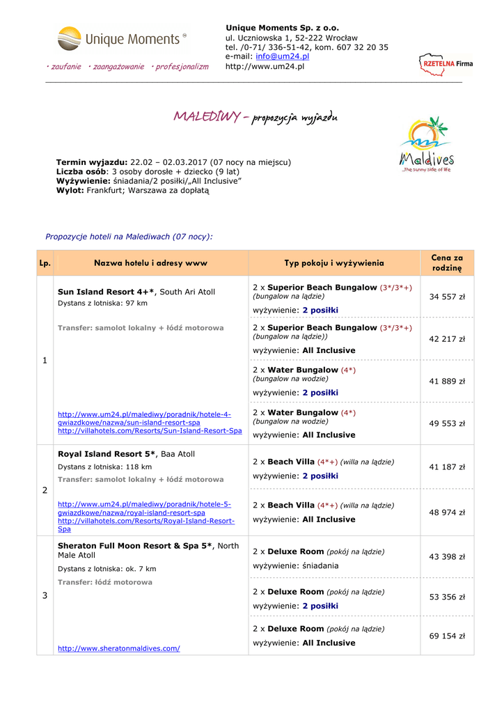 • zaufanie • zaangażowanie • profesjonalizm Unique Moments Sp. z o.o. ul. Uczniowska 1, 52-222 Wrocław tel. /0-71/ 336-51-42, kom. 607 32 20 35 e-mail: [email protected] http://www.um24.pl __________________________________________________________________________________ MALEDIWY - propozycja wyjazdu Termin wyjazdu: 22.02 – 02.03.2017 (07 nocy na miejscu) Liczba osób: 3 osoby dorosłe + dziecko (9 lat) Wyżywienie: śniadania/2 posiłki/„All Inclusive” Wylot: Frankfurt; Warszawa za dopłatą Propozycje hoteli na Malediwach (07 nocy): Lp. Nazwa hotelu i adresy www Sun Island Resort 4+*, South Ari Atoll Dystans z lotniska: 97 km Transfer: samolot lokalny + łódź motorowa Typ pokoju i wyżywienia Cena za rodzinę 2 x Superior Beach Bungalow (3*/3*+) (bungalow na lądzie) 34 557 zł wyżywienie: 2 posiłki 2 x Superior Beach Bungalow (3*/3*+) (bungalow na lądzie)) 42 217 zł wyżywienie: All Inclusive 1 2 x Water Bungalow (4*) (bungalow na wodzie) 41 889 zł wyżywienie: 2 posiłki http://www.um24.pl/malediwy/poradnik/hotele-4gwiazdkowe/nazwa/sun-island-resort-spa http://villahotels.com/Resorts/Sun-Island-Resort-Spa Royal Island Resort 5*, Baa Atoll Dystans z lotniska: 118 km Transfer: samolot lokalny + łódź motorowa 2 x Water Bungalow (4*) (bungalow na wodzie) 49 553 zł wyżywienie: All Inclusive 2 x Beach Villa (4*+) (willa na lądzie) 41 187 zł wyżywienie: 2 posiłki 2 http://www.um24.pl/malediwy/poradnik/hotele-5gwiazdkowe/nazwa/royal-island-resort-spa http://villahotels.com/Resorts/Royal-Island-ResortSpa wyżywienie: All Inclusive Sheraton Full Moon Resort & Spa 5*, North Male Atoll 2 x Deluxe Room (pokój na lądzie) Dystans z lotniska: ok. 7 km wyżywienie: śniadania 2 x Beach Villa (4*+) (willa na lądzie) 48 974 zł 43 398 zł Transfer: łódź motorowa 2 x Deluxe Room (pokój na lądzie) 3 53 356 zł wyżywienie: 2 posiłki 2 x Deluxe Room (pokój na lądzie) http://www.sheratonmaldives.com/ wyżywienie: All Inclusive 69 154 zł Angsana Velavaru 5*, South Nilandhe Atoll 2 x Beachfront Jet Pool Villa Dystans z lotniska: 146 km (willa na lądzie z jacuzzi) Transfer: hydroplan 47 693 zł wyżywienie: śniadania 2 x Beachfront Jet Pool Villa (willa na lądzie z jacuzzi) 4 52 608 zł wyżywienie: 2 posiłki 2 x Beachfront Jet Pool Villa (willa na lądzie z jacuzzi) http://www.um24.pl/malediwy/poradnik/hotele-5gwiazdkowe/nazwa/angsana-velavaru http://www.angsana.com/en/ 63 054 zł wyżywienie: All Inclusive Uwaga! Dostępność w hotelach na proponowany termin wymaga jeszcze potwierdzenia. Powyższe ceny uwzględniają promocje hotelowe ważne w dniu 13 lutego 2017 roku, promocje po tym terminie mogą ulec zmianie. Plan lotu – wylot z Frankfurtu (w cenie): LH 704 22 Luty Frankfurt(FRA) 19:15 Male(MLE) 08:55 LH 705 02 Marzec Male(MLE) 10:40 Frankfurt(FRA) 17:20 Plan lotu – wylot z Warszawy (za dopłatą ok. 650 zł/rodzinę): LH1349 22 Luty Warszawa(WAW) 14:40 Frankfurt(FRA) 16:30 LH 704 22 Luty Frankfurt(FRA) 19:15 Male(MLE) 08:55 -------LH 705 02 Marzec Male(MLE) 10:40 Frankfurt(FRA) 17:20 LH1352 02 Marzec Frankfurt(FRA) 20:55 Warszawa(WAW) 22:30 Cena (za rodzinę) wyjazdu zawiera: - przelot samolotem (bezpośredni lot!) w 2 strony z FRANKFURTU na Malediwy ze wszystkimi opłatami i podatkami liniami Lufthansa - zakwaterowanie w wybranym hotelu na Malediwach na 07 nocy z wybraną opcją wyżywienia - przywitanie na lotnisku i transfery lotnisko-hotel-lotnisko hydroplanem/samolotem lokalnym/ łodzią motorową - 24h/7 pomoc oraz opieka telefoniczna w języku polskim - ubezpieczenie KL (60 000 EUR), NNW (NWI - 30 000 PLN oraz NWS - 15 000 PLN) oraz bagażu (4 000 PLN) TU Signal Iduna - najwyższej jakości obsługę podczas wyjazdu Cena nie zawiera: - dopłaty do wylotu z Warszawy w wysokości ok. 650 zł/rodzinę - ew. dopłaty do ubezpieczenia od kosztów rezygnacji i/lub przerwania wyjazdu - ew. dodatkowych posiłków w czasie wyjazdu - ew. dodatkowych wycieczek - napiwków Warunki płatności: - I rata w wysokości 30 % wartości rezerwacji przy dokonaniu rezerwacji (po wpłacie I raty wystawiamy w 24h ‘elektroniczne bilety lotnicze’ (w 2 strony)). - II rata w wysokości 70 % wartości rezerwacji płatna na około 35 dni przed planowanym wyjazdem. Oferta wymaga potwierdzenia. Istnieje możliwość wystawienia faktury VAT (VAT 0%). Treść usługi do uzgodnienia. Zapraszamy !