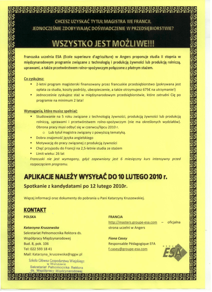 Francuska uczel ia ESA (Ecole superieure d'agriculture) Angers proponu"e studia I stopnia międzynarodowym progr ie związane z technologią i produkcją żywności lub produkcją rolniczą. uprawami. a także przetwórstwem rolno-spożywczym połączone z platn staże" Cozyskuiesz: • 2-letni program magisterski finansowany przez francuskie przedsiębiorstwo (pokrywana jest opłata za studia, koszty podróży, ubezpieczenie, a także otrzymujesz 67S€ na utrzymanie!) • Jednocześnie zyskujesz staż w międzynarodowym przedsiębiorstwie, które zatrudni Cię po programie na minimum 2 lata! Wymagania. które musiszspełniać • Studiowanie rolniczą, na S roku związane z technologią uprawami i przetwórstwem rolno-spożywczym Obrona pracy musi odbyć się w czerwcu/lipcu o • żywności, produkcją żywności lub produkcją (nie ma określonych wydziałów). 2010 r. Lub tytuł magistra związany z powyższą tematyką. Dobra znajomość języka angielskiego • Motywację • Chęć przyjazdu do Francji na 2,S-letnie studia ze stażem • Limit wieku: 26 lat Francuski do pracy związanej z produkcją żywności nie jest wymagany, gdyż zapewniony jest 6 miesięczny kurs intensywny przed rozpoczęciem programu. APLIKACJE NALEŻY WYSYtAĆ DO 10 LUTEGO 2010 r. Spotkanie z kandydatami po 12 lutego 2010r. Więcej informacji oraz dokumenty do pobrania u Pani Katarzyny Kruszewskiej. KONTAKT POLSKA FRANCJA Katarzyna Kruszewska strona uczelni w Angers http://masters.groupe-esa.com Sekretariat Pełnomocnika Rektora ds. Współpracy Międzynarodowej Fiona Casey Bud. 8, pok. 106 Responsable Pedagoglque EFA Tel: 022 S93 1841 [email protected] Mail: [email protected] Szkoła Główna Gospodarstwa Wiejskiego w Warszawie Sekretariat Pełnomocnika Rektora ds. Współpracy Międzynarodowej oficjalna