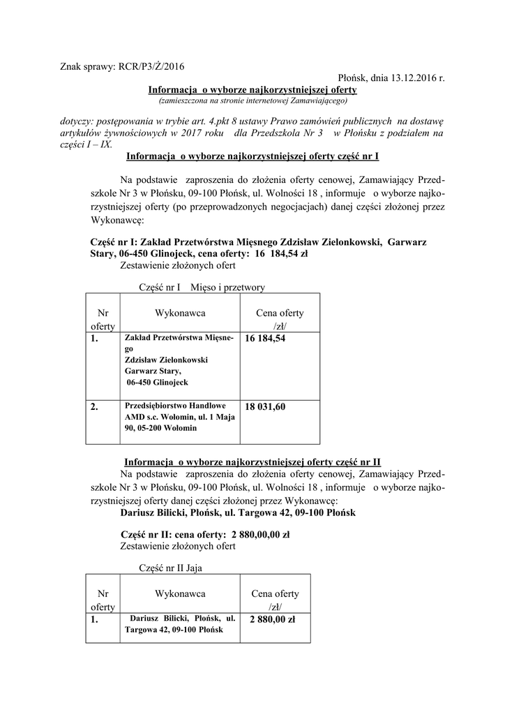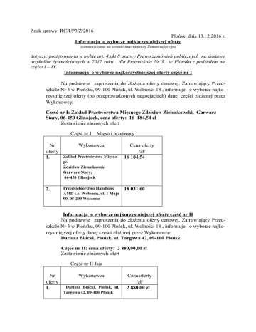 Znak sprawy: RCR/P3/Ż/2016 Płońsk, dnia 13.12.2016 r. Informacja o wyborze najkorzystniejszej oferty (zamieszczona na stronie internetowej Zamawiającego) dotyczy: postępowania w trybie art. 4.pkt 8 ustawy Prawo zamówień publicznych na dostawę artykułów żywnościowych w 2017 roku dla Przedszkola Nr 3 w Płońsku z podziałem na części I – IX. Informacja o wyborze najkorzystniejszej oferty część nr I Na podstawie zaproszenia do złożenia oferty cenowej, Zamawiający Przedszkole Nr 3 w Płońsku, 09-100 Płońsk, ul. Wolności 18 , informuje o wyborze najkorzystniejszej oferty (po przeprowadzonych negocjacjach) danej części złożonej przez Wykonawcę: Część nr I: Zakład Przetwórstwa Mięsnego Zdzisław Zielonkowski, Garwarz Stary, 06-450 Glinojeck, cena oferty: 16 184,54 zł Zestawienie złożonych ofert Część nr I Mięso i przetwory Nr Wykonawca oferty Zakład Przetwórstwa Mięsne1. go Zdzisław Zielonkowski Garwarz Stary, 06-450 Glinojeck 2. Przedsiębiorstwo Handlowe AMD s.c. Wołomin, ul. 1 Maja 90, 05-200 Wołomin Cena oferty /zł/ 16 184,54 18 031,60 Informacja o wyborze najkorzystniejszej oferty część nr II Na podstawie zaproszenia do złożenia oferty cenowej, Zamawiający Przedszkole Nr 3 w Płońsku, 09-100 Płońsk, ul. Wolności 18 , informuje o wyborze najkorzystniejszej oferty danej części złożonej przez Wykonawcę: Dariusz Bilicki, Płońsk, ul. Targowa 42, 09-100 Płońsk Część nr II: cena oferty: 2 880,00,00 zł Zestawienie złożonych ofert Część nr II Jaja Nr oferty 1. Wykonawca Dariusz Bilicki, Płońsk, ul. Targowa 42, 09-100 Płońsk Cena oferty /zł/ 2 880,00 zł Informacja o wyborze najkorzystniejszej oferty część nr III Na podstawie zaproszenia do złożenia oferty cenowej, Zamawiający Przedszkole Nr 1 w Płońsku, 09-100 Płońsk, ul. Kolejowa 5 , informuje o wyborze najkorzystniejszej oferty danej części złożonej przez Wykonawcę: P.P.H.U. „HUBERTUS” Hubert Grala, Baboszewo, ul. Kubińskiego 15, 09-130 Baboszewo Część nr III: cena oferty: 3 945,72 zł Zestawienie złożonych ofert Część nr III Pieczywo Nr Wykonawca oferty P.P.H.U. „HUBERTUS” Hu1. bert Grala, Baboszewo, ul. Kubińskiego 15, 09-130 Baboszewo Cena oferty /zł/ 3 945,72 Informacja o wyborze najkorzystniejszej oferty część nr IV Na podstawie zaproszenia do złożenia oferty cenowej, Zamawiający Przedszkole Nr 1 w Płońsku, 09-100 Płońsk, ul. Kolejowa 5, informuje o wyborze najkorzystniejszej oferty danej części złożonej przez Wykonawcę: P.P.H.U. „HUBERTUS” Hubert Grala, Baboszewo, ul. Kubińskiego 15, 09-130 Baboszewo Część nr IV: cena oferty: 1 247,94 zł Zestawienie złożonych ofert Część nr IV Ciasta Nr Wykonawca oferty P.P.H.U. „HUBERTUS” Hu1. bert Grala, Baboszewo, ul. Kubińskiego 15, 09-130 Baboszewo Cena oferty /zł/ 1 247,94 Informacja o wyborze najkorzystniejszej oferty część nr V Na podstawie zaproszenia do złożenia oferty cenowej, Zamawiający Przedszkole Nr 3 w Płońsku, 09-100 Płońsk, ul. Wolności 18 , informuje o wyborze najkorzystniejszej oferty (po przeprowadzonych negocjacjach) danej części złożonej przez Wykonawcę: Gospodarstwo Sadownicze Marcin Kwiatkowski, Korzybie 12, 09130 Baboszewo Część nr V: cena oferty: 1 050,00 zł Zestawienie złożonych ofert Część nr V Jabłka Nr oferty 1. 2 Wykonawca Gospodarstwo Sadownicze Marcin Kwiatkowski Korzybie 12 09-130 Baboszewo AGRAF H. Eljasińska i A. Bęza S.C. Wąsy Wieś 8, 05083 Zaborów Cena oferty /zł/ 1 050,00 1 600,00 Informacja o wyborze najkorzystniejszej oferty część nr VI Na podstawie zaproszenia do złożenia oferty cenowej, Zamawiający Przedszkole Nr 3 w Płońsku, 09-100 Płońsk, ul. Wolności 18 , informuje o wyborze najkorzystniejszej oferty (po przeprowadzonych negocjacjach) danej części złożonej przez Wykonawcę: HURTOWNIA OWOCÓW I WARZYW Sławomir Kasiak, Płońsk, ul. Prosta 15, 09-100 Płońsk Część nr VI: cena oferty: 18 610,50 zł Zestawienie złożonych ofert Część nr VI Pozostałe owoce i warzywa Nr oferty 1. 2. Wykonawca AGRAF H. Eljasińska i A. Bęza S.C. Wąsy Wieś 8, 05083 Zaborów HURTOWNIA OWOCÓW I WARZYW Sławomir Kasiak, Płońsk, ul. Prosta 15, 09-100 Płońsk Cena oferty /zł/ 18 899,00 18 610,50 Informacja o wyborze najkorzystniejszej oferty część nr VII Na podstawie zaproszenia do złożenia oferty cenowej, Zamawiający Przedszkole Nr 3 w Płońsku, 09-100 Płońsk, ul. Wolności 18 , informuje o wyborze najko- rzystniejszej oferty (po przeprowadzonych negocjacjach) danej części złożonej przez Wykonawcę: Zakład Mleczarski Sp. z o.o. w Płońsku z/s w Skarżynie, Skarżyn, ul. Aleja Lipowa 6 09-100 Płońsk Część nr VII: cena oferty: 20 205,50 zł Zestawienie złożonych ofert Część nr VII Produkty mleczarskie Nr oferty 1. 2. Wykonawca Hurtownia Wielobranżowa „KRÓWKA” Katarzyna Dutkiewicz, Płońsk, ul. Piaskowa 9, 09-100 Płońsk Zakład Mleczarski Sp. z o.o. w Płońsku z/s w Skarżynie, Skarżyn, ul. Aleja Lipowa 6, 09-100 Płońsk Cena oferty /zł/ 32 615,20 20 205,50 Informacja o wyborze najkorzystniejszej oferty część nr VIII Na podstawie zaproszenia do złożenia oferty cenowej, Zamawiający Przedszkole Nr 3 w Płońsku, 09-100 Płońsk, ul. Wolności 18 , informuje o wyborze najkorzystniejszej oferty danej części złożonej przez Wykonawcę: HURTOWNIA LODÓW, MROŻONEK, ART. SPOŻYWCZYCH „LOD-MORS” Sławomir Borucki, Skarżyn, ul. Wyszogrodzka 3, 09-100 Płońsk Część nr VIII: cena oferty: 2 440,20 zł Zestawienie złożonych ofert Część nr VIII Mrożone warzywa, owoce, potrawy Nr oferty 1. Wykonawca HURTOWNIA LODÓW, MROŻONEK, ART. SPOŻYWCZYCH „LOD-MORS” Sławomir Borucki Skarżyn, ul. Wyszogrodzka 3 09-100 Płońsk Cena oferty /zł/ 2 440,20 Informacja o wyborze najkorzystniejszej oferty część nr IX Na podstawie zaproszenia do złożenia oferty cenowej, Zamawiający Przedszkole Nr 3 w Płońsku, 09-100 Płońsk, ul. Wolno