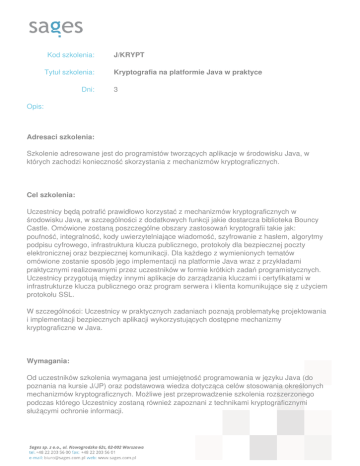 Kod szkolenia: Tytuł szkolenia: Dni: J/KRYPT Kryptografia na platformie Java w praktyce 3 Opis: Adresaci szkolenia: Szkolenie adresowane jest do programistów tworzących aplikacje w środowisku Java, w których zachodzi konieczność skorzystania z mechanizmów kryptograficznych. Cel szkolenia: Uczestnicy będą potrafić prawidłowo korzystać z mechanizmów kryptograficznych w środowisku Java, w szczególności z dodatkowych funkcji jakie dostarcza biblioteka Bouncy Castle. Omówione zostaną poszczególne obszary zastosowań kryptografii takie jak: poufność, integralność, kody uwierzytelniające wiadomość, szyfrowanie z hasłem, algorytmy podpisu cyfrowego, infrastruktura klucza publicznego, protokoły dla bezpiecznej poczty elektronicznej oraz bezpiecznej komunikacji. Dla każdego z wymienionych tematów omówione zostanie sposób jego implementacji na platformie Java wraz z przykładami praktycznymi realizowanymi przez uczestników w formie krótkich zadań programistycznych. Uczestnicy przygotują między innymi aplikacje do zarządzania kluczami i certyfikatami w infrastrukturze klucza publicznego oraz program serwera i klienta komunikujące się z użyciem protokołu SSL. W szczególności: Uczestnicy w praktycznych zadaniach poznają problematykę projektowania i implementacji bezpiecznych aplikacji wykorzystujących dostępne mechanizmy kryptograficzne w Java. Wymagania: Od uczestników szkolenia wymagana jest umiejętność programowania w języku Java (do poznania na kursie J/JP) oraz podstawowa wiedza dotycząca celów stosowania określonych mechanizmów kryptograficznych. Możliwe jest przeprowadzenie szkolenia rozszerzonego podczas którego Uczestnicy zostaną również zapoznani z technikami kryptograficznymi służącymi ochronie informacji. Parametry szkolenia: 3*8 godzin (3*7 godzin netto) wykładów i warsztatów (z wyraźną przewagą warsztatów). 5*8 godzin (5*7 godzin netto) - szkolenie w zakresie rozszerzonym - dodatkowo szczegółowe objaśnienie zasad działania i celu stosowanych technik kryptograficznych Wielkość grupy: maks. 8-10 osób. Program szkolenia: 1. 2. 3. 4. 5. 6. 7. 8. 9. 10. 11. 12. 13. 14. 15. Powered by TCPDF (www.tcpdf.org) JCA i JCE - podstawowa architektura, dostawcy, polityki zabezpieczeń Instalacja i konfiguracja biblioteki Bouncy Castle Algorytmy symetryczne – stosowanie szyfrów blokowych i strumieniowych Funkcje skrótu – wyznaczanie skrótów wiadomości Szyfrowanie z hasłem - stosowanie PBE (Password Based Encryption) Kody MAC (Message Authentication Code), kody HMAC (Keyed-Hash Message Authentication Code) – uwierzytelnianie źródeł danych Notacja ASN.1 - przeznaczenie, tryby kodowania, przechowywanie obiektów kryptograficznych Algorytmy asymetryczne - algorytm RSA, Diffiego-Helmana a. Stosowanie algorytmów do podpisu cyfrowego (RSA, El Gamal, DSA) – generowanie kluczy, operacja podpisu, walidacja b. Stosowanie algorytmów do szyfrowania wiadomości (RSA) – generowanie kluczy, szyfrowanie, deszyfrowanie Algorytmy oparte na krzywych eliptycznych – generowanie kluczy, podpis, walidacja podpisu, szyfrowanie, deszyfrowanie Infrastruktura klucza publicznego - certyfikaty X.509 a. Generowanie i przechowywanie certyfikatów b. Walidacja i unieważnianie certyfikatów c. Stosowanie list CRL i protokołu OCSP Zarządzanie kluczami i certyfikatami – wykorzystanie repozytoriów kluczy Protokoły CMS i S/MIME - przygotowanie aplikacji do zabezpieczania danych, wymiany wiadomości elektronicznych Protokoły SSL i TLS – przygotowanie aplikacji do bezpiecznej komunikacji Dostęp do urządzeń kryptograficznych poprzez interfejs PKCS #11 Aplikacje dla kart kryptograficznych Java Card