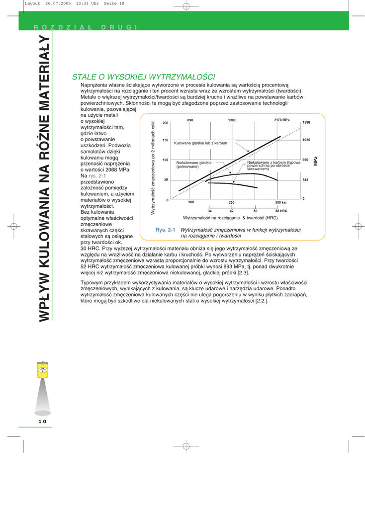 Layout 26.07.2005 13:33 Uhr 10 D R U G I STALE O WYSOKIEJ WYTRZYMA¸OÂCI Napr´˝enia w∏asne Êciskajàce wytworzone w procesie kulowania sà wartoÊcià procentowà wytrzyma∏oÊci na rozciàganie i ten procent wzrasta wraz ze wzrostem wytrzyma∏oÊci (twardoÊci). Metale o wi´kszej wytrzyma∏oÊci/twardoÊci sà bardziej kruche i wra˝liwe na powstawanie karbów powierzchniowych. Sk∏onnoÊci te mogà byç z∏agodzone poprzez zastosowanie technologii kulowania, pozwalajàcej na u˝ycie metali o wysokiej wytrzyma∏oÊci tam, gdzie ∏atwo o powstawanie Kulowane g∏adkie lub z karbem uszkodzeƒ. Podwozia samolotów dzi´ki kulowaniu mogà Niekulowane z karbem (typowa Niekulowane g∏adkie przenosiç napr´˝enia powierzchnia po obróbce (polerowane) skrawaniem) o wartoÊci 2068 MPa. Na rys. 2-1 przedstawiono zale˝noÊç pomi´dzy kulowaniem, a u˝yciem materia∏ów o wysokiej wytrzyma∏oÊci. Bez kulowania Wytrzyma∏oÊç na rozciàganie & twardoÊç (HRC) optymalne w∏aÊciwoÊci zm´czeniowe Rys. 2-1 Wytrzyma∏oÊç zm´czeniowa w funkcji wytrzyma∏oÊci skrawanych cz´Êci na rozciàganie i twardoÊci stalowych sà osiàgane przy twardoÊci ok. 30 HRC. Przy wy˝szej wytrzyma∏oÊci materia∏u obni˝a si´ jego wytrzyma∏oÊç zm´czeniowà ze wzgl´du na wra˝liwoÊç na dzia∏anie karbu i kruchoÊç. Po wytworzeniu napr´˝eƒ Êciskajàcych wytrzyma∏oÊç zm´czeniowa wzrasta proporcjonalnie do wzrostu wytrzyma∏oÊci. Przy twardoÊci 52 HRC wytrzyma∏oÊç zm´czeniowa kulowanej próbki wynosi 993 MPa, tj. ponad dwukrotnie wi´cej ni˝ wytrzyma∏oÊç zm´czeniowa niekulowanej, g∏adkiej próbki [2.3]. Wytrzyma∏oÊç zm´czeniowa po 2 milionach cykli WP¸YW KULOWANIA NA RÓ˚NE MATERIA¸Y R O Z D Z I A ¸ Seite 10 Typowym przyk∏adem wykorzystywania materia∏ów o wysokiej wytrzyma∏oÊci i wzrostu w∏aÊciwoÊci zm´czeniowych, wynikajàcych z kulowania, sà klucze udarowe i narz´dzia udarowe. Ponadto wytrzyma∏oÊç zm´czeniowa kulowanych cz´Êci nie ulega pogorszeniu w wyniku p∏ytkich zadrapaƒ, które mogà byç szkodliwe dla niekulowanych stali o wysokiej wytrzyma∏oÊci [2.2.]. 26.07.2005 13:33 Uhr Seite 11 R O Z D Z I A ¸ Naw´glanie i w´gloazotowanie to procesy obróbki cieplno-chemicznej, w rezultacie których otrzymuje si´ bardzo twarde powierzchnie, zazwyczaj o twardoÊci 55-62 HRC. KorzyÊci z kulowania naw´glanych stali sà nast´pujàce: o o Wysokie wartoÊci napr´˝eƒ Êciskajàcych ~ 1379 MPa lub wy˝sze, Redukcja anomalii naw´glania wynikajàcych z utleniania mi´dzykrystalicznego powierzchni. JeÊli po˝àdane jest osiàgni´cie maksymalnych w∏aÊciwoÊci zm´czeniowych cz´Êci z warstwà naw´glanà lub w´gloazotowanà, zalecane jest u˝ywanie Êrutu o twardoÊci 55-62 HRC. Przyk∏ad zastosowania WA¸Y KORBOWE SILNIKÓW WYSOKOPR¢˚NYCH. Wa∏y korbowe 4-cylindrowych silników wysokopr´˝nych ulega∏y stale uszkodzeniom przy próbach z maksymalnym obcià˝eniem silnika. Badania wykaza∏y, ˝e naw´glanie gazowe i kulowanie czopów korbowych da∏o najlepsze rezultaty zm´czeniowe (rys. 2-2). Azotowanie i kulowanie okaza∏o si´ tak˝e korzystniejsze ni˝ powi´kszenie Êrednicy czopa korbowego [2.3]. Naw´glane i kulowane Tylko azotowane Tylko naw´glane Azotowane i kulowane Liczba cykli do zniszczenia przy ró˝nych obcià˝eniach zewn´trznych Rys. 2-2 Porównanie wytrzyma∏oÊci czopów korbowych azotowanych i kulowanych oraz ODW¢GLENIE Odw´glenie to redukcja zawartoÊci w´gla z powierzchni stopów ˝elaza w wyniku obróbki termicznej. Wykazano, ˝e odw´glenie mo˝e obni˝yç wytrzyma∏oÊç zm´czeniowà stali o wysokiej wytrzyma∏oÊci (1 650 MPa i wy˝ej) o 70% - 80%, a stali o ni˝szej wytrzyma∏oÊci (965 - 1030 MPa) o 45% - 55% [2.4, 2.5 i 2.6]. Odw´glenie jest zjawiskiem wyst´pujàcym w warstwie wierzchniej i jego wp∏yw na w∏aÊciwoÊci wytrzyma∏oÊciowe nie jest ÊciÊle zwiàzany z g∏´bokoÊcià wyst´powania zjawiska. Odw´glanie na g∏´bokoÊç 0,0762 mm (0,003“) mo˝e wp∏ywaç tak samo szkodliwie na wytrzyma∏oÊç zm´czeniowà jak i odw´glanie na g∏´bokoÊç 0,762 mm (0,030“) [2.4, 2.5 i 2.6]. D R U G I WP¸YW KULOWANIA NA RÓ˚NE MATERIA¸Y STALE W¢GLOWE Obcià˝enia dynamiczne Layout 11 Layout 26.07.2005 13:33 Uhr WP¸YW KULOWANIA NA RÓ˚NE MATERIA¸Y R O Z D Z I A ¸ Seite 12 D R U G I Kulowanie okaza∏o si´ byç technologià przydatnà dla przywrócenia w du˝ym stopniu wytrzyma∏oÊci zm´czeniowej utraconej w procesie odw´glania [2.7]. Przy du˝ych partiach wyrobów nie jest ∏atwo wykryç te z warstwà odw´glonà, dlatego te˝ poprzez kulowanie mo˝na zapewniç jednorodnoÊç wszystkich cz´Êci w przypadku, gdy mo˝emy si´ spodziewaç wystàpienia odw´glenia. Je˝eli na cz´Êciach o wysokiej twardoÊci (58 HRC), po kulowaniu ujawniajà si´ nietypowe powierzchnie o zwi´kszonej chropowatoÊci to nale˝y domniemywaç, ˝e na powierzchniach tych nastàpi∏o odw´glenie. Odw´gleniu cz´sto towarzyszy niepo˝àdane wyst´powanie austenitu szczàtkowego. Obróbka powierzchniowa na zimno, jakà jest kulowanie, redukuje procentowà zawartoÊç austenitu szczàtkowego w warstwie wierzchniej. Przyk∏ad zastosowania. REDUKOWANIE AUSTENITU SZCZÑTKOWEGO – STAL NAW¢GLANA 5120, KULOWANA Z INTENSYWNOÂCIÑ 0,36 A G∏´bokoÊç [cal] 0.0000 0.0004 0.0008 0.0012 0.0016 0.0020 0.0024 0.0028 0.0039 0.0055 G∏´bokoÊç [mm] 0.00 0.01 0.02 0.03 0.04 0.05 0.06 0.07 0.10 0.14 Austenit szczàtkowy [%] Niekulowane Kulowane 5 7 14 13 14 14 15 15 15 12 3 4 5 6 7 7 8 9 10 10 [2.8] ˚ELIWO SFEROIDALNE HARTOWANE IZOTERMICZNIE Podwy˝szenie w∏aÊciwoÊci wytrzyma∏oÊciowych ˝eliwa sferoidalnego (ADI) pozwoli∏o na zastàpienie nim w niektórych przypadkach stalowych odkuwek, odlewów i cz´Êci przeznaczonych do spawania. ADI ma wysokà wytrzyma∏oÊç przy niewielkim ci´˝arze w∏aÊciwym oraz doskona∏e parametry odpornoÊci na zu˝ycie. ADI zastàp