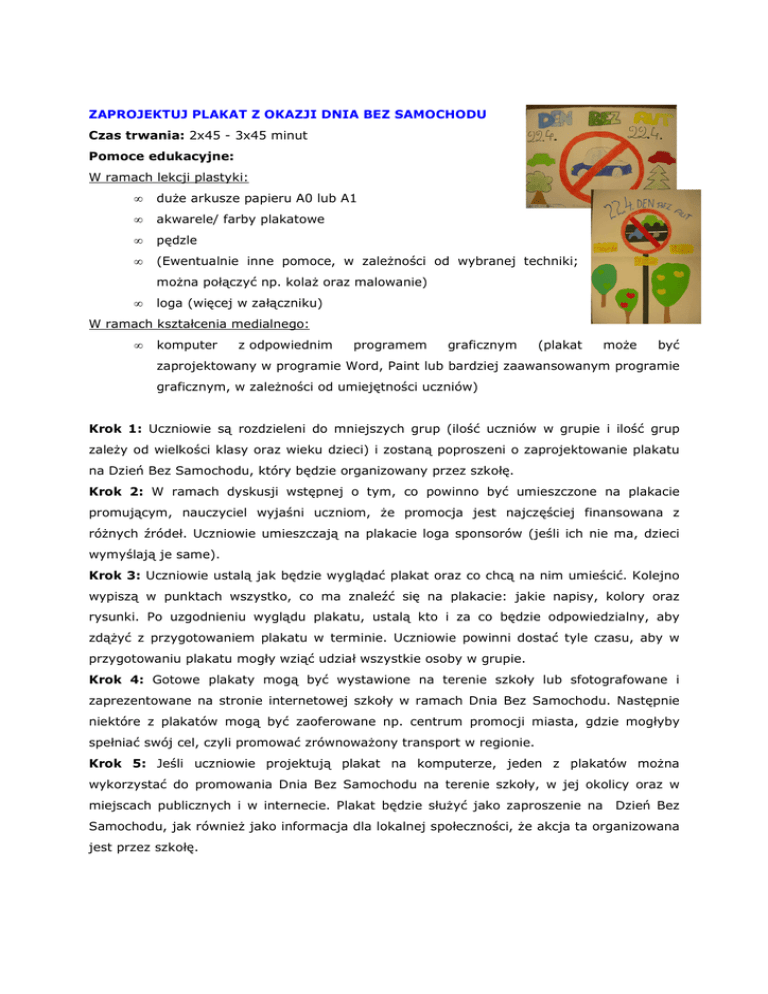 ZAPROJEKTUJ PLAKAT Z OKAZJI DNIA BEZ SAMOCHODU Czas trwania: 2x45 - 3x45 minut Pomoce edukacyjne: W ramach lekcji plastyki: • duże arkusze papieru A0 lub A1 • akwarele/ farby plakatowe • pędzle • (Ewentualnie inne pomoce, w zależności od wybranej techniki; można połączyć np. kolaż oraz malowanie) • loga (więcej w załączniku) W ramach kształcenia medialnego: • komputer z odpowiednim programem graficznym (plakat może być zaprojektowany w programie Word, Paint lub bardziej zaawansowanym programie graficznym, w zależności od umiejętności uczniów) Krok 1: Uczniowie są rozdzieleni do mniejszych grup (ilość uczniów w grupie i ilość grup zależy od wielkości klasy oraz wieku dzieci) i zostaną poproszeni o zaprojektowanie plakatu na Dzień Bez Samochodu, który będzie organizowany przez szkołę. Krok 2: W ramach dyskusji wstępnej o tym, co powinno być umieszczone na plakacie promującym, nauczyciel wyjaśni uczniom, że promocja jest najczęściej finansowana z różnych źródeł. Uczniowie umieszczają na plakacie loga sponsorów (jeśli ich nie ma, dzieci wymyślają je same). Krok 3: Uczniowie ustalą jak będzie wyglądać plakat oraz co chcą na nim umieścić. Kolejno wypiszą w punktach wszystko, co ma znaleźć się na plakacie: jakie napisy, kolory oraz rysunki. Po uzgodnieniu wyglądu plakatu, ustalą kto i za co będzie odpowiedzialny, aby zdążyć z przygotowaniem plakatu w terminie. Uczniowie powinni dostać tyle czasu, aby w przygotowaniu plakatu mogły wziąć udział wszystkie osoby w grupie. Krok 4: Gotowe plakaty mogą być wystawione na terenie szkoły lub sfotografowane i zaprezentowane na stronie internetowej szkoły w ramach Dnia Bez Samochodu. Następnie niektóre z plakatów mogą być zaoferowane np. centrum promocji miasta, gdzie mogłyby spełniać swój cel, czyli promować zrównoważony transport w regionie. Krok 5: Jeśli uczniowie projektują plakat na komputerze, jeden z plakatów można wykorzystać do promowania Dnia Bez Samochodu na terenie szkoły, w jej okolicy oraz w miejscach publicznych i w internecie. Plakat będzie służyć jako zaproszenie na Dzień Bez Samochodu, jak również jako informacja dla lokalnej społeczności, że akcja ta organizowana jest przez szkołę.