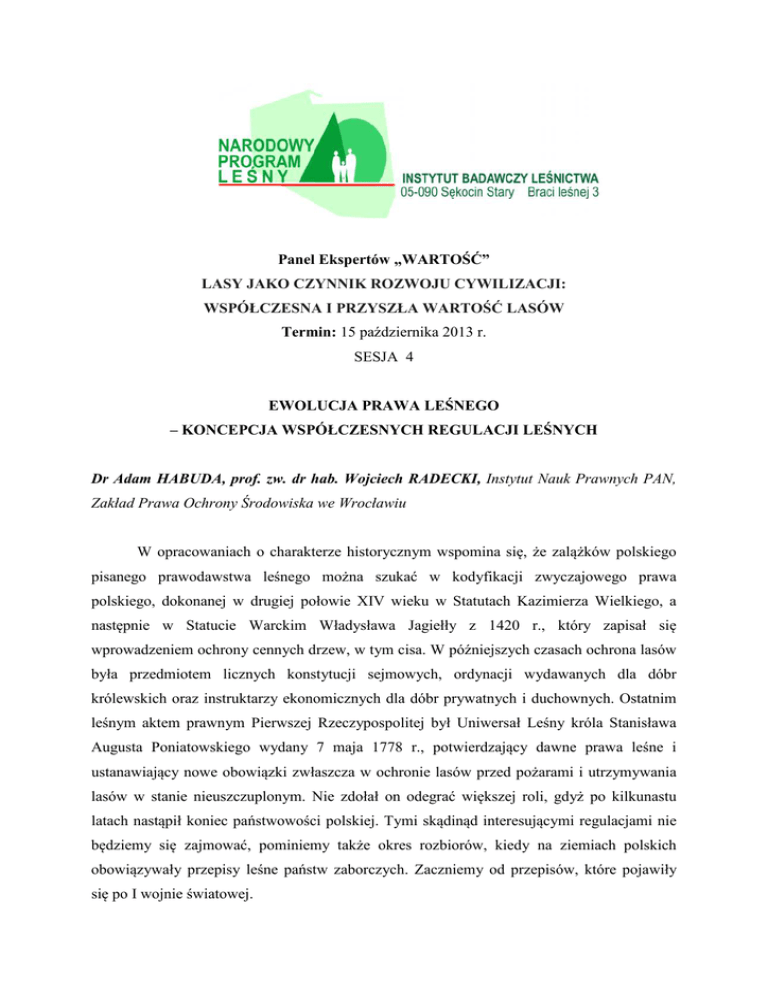 Panel Ekspertów „WARTOŚĆ” LASY JAKO CZYNNIK ROZWOJU CYWILIZACJI: WSPÓŁCZESNA I PRZYSZŁA WARTOŚĆ LASÓW Termin: 15 października 2013 r. SESJA 4 EWOLUCJA PRAWA LEŚNEGO – KONCEPCJA WSPÓŁCZESNYCH REGULACJI LEŚNYCH Dr Adam HABUDA, prof. zw. dr hab. Wojciech RADECKI, Instytut Nauk Prawnych PAN, Zakład Prawa Ochrony Środowiska we Wrocławiu W opracowaniach o charakterze historycznym wspomina się, że zalążków polskiego pisanego prawodawstwa leśnego można szukać w kodyfikacji zwyczajowego prawa polskiego, dokonanej w drugiej połowie XIV wieku w Statutach Kazimierza Wielkiego, a następnie w Statucie Warckim Władysława Jagiełły z 1420 r., który zapisał się wprowadzeniem ochrony cennych drzew, w tym cisa. W późniejszych czasach ochrona lasów była przedmiotem licznych konstytucji sejmowych, ordynacji wydawanych dla dóbr królewskich oraz instruktarzy ekonomicznych dla dóbr prywatnych i duchownych. Ostatnim leśnym aktem prawnym Pierwszej Rzeczypospolitej był Uniwersał Leśny króla Stanisława Augusta Poniatowskiego wydany 7 maja 1778 r., potwierdzający dawne prawa leśne i ustanawiający nowe obowiązki zwłaszcza w ochronie lasów przed pożarami i utrzymywania lasów w stanie nieuszczuplonym. Nie zdołał on odegrać większej roli, gdyż po kilkunastu latach nastąpił koniec państwowości polskiej. Tymi skądinąd interesującymi regulacjami nie będziemy się zajmować, pominiemy także okres rozbiorów, kiedy na ziemiach polskich obowiązywały przepisy leśne państw zaborczych. Zaczniemy od przepisów, które pojawiły się po I wojnie światowej. 1. PRAWO LEŚNE DRUGIEJ RZECZYPOSPOLITEJ Wkrótce po odzyskaniu przez Polskę niepodległości przystąpiono do regulacji także zagadnień leśnych. Na podstawie postanowienia Rady Ministrów z 30 grudnia 1918 r. w przedmiocie ochrony i użytkowania lasów1 wszystkie lasy, nie wyłączając prywatnych, przeszły pod obowiązkowy nadzór i kontrolę wyznaczonych z ramienia Ministerstwa Rolnictwa i Dóbr Państwowych urzędów ochrony lasu. Po kilkunastu dniach ukazał się dekret Naczelnika Państwa z 16 stycznia 1919 r. w przedmiocie organizacji urzędów ochrony lasów2. Nadzór ogólny nad wykonywaniem przepisów o ochronie lasów został powierzony Ministerstwu Rolnictwa i Dóbr Państwowych. Pod jego naczelnym kierownictwem miały zostać powołane: 1) urzędy ochrony lasów składające się z następujących ogniw: a) główny inspektor ochrony lasów, b) okręgowi inspektorzy ochrony lasów, c) komisarze i podkomisarze ochrony lasów, d) urzędnicy pomocniczy i gajowi, 2) komisje ochrony lasów: a) okręgowe – w miastach, w których urzędowały okręgowe komisje ziemskie, b) główna – przy ministerstwie. Dla ustawodawstwa leśnego Polski międzywojennej charakterystyczny był dualizm regulacji polegający na tym, że odrębne akty prawne dotyczyły lasów państwowych i niepaństwowych. Jeśli chodzi o lasy państwowe, kolejne etapy legislacyjne wyznaczają: • rozporządzenie Prezydenta z 28 czerwca 1924 r. o statucie przedsiębiorstwa „Polskie Lasy Państwowe”3, • rozporządzenie Prezydenta z 30 grudnia 1924 r. o organizacji administracji lasów państwowych4, • rozporządzenie Prezydenta z 22 marca 1928 r. o zagospodarowaniu lasów państwowych5, • dekret Prezydenta z 30 września 1936 r. o państwowym gospodarstwie leśnym6. 1 Dziennik Praw Państwa Polskiego (dalej w skrócie DzPPP) z 1919 r. nr 3, poz. 86). DzPPP z 1919 r. nr 8, poz. 117. 3 DzU z 1924 r. nr 56, poz. 570. 4 DzU z 1924 r. nr 119, poz. 1079. 5 DzU z 1928 r. nr 36, poz. 336. 2 2 Wprowadzane w międzywojniu akty dotyczące lasów państwowych były oparte na założeniu wydzielenia gospodarki w tych lasach w odrębną gałąź administracji państwowej. Sprawował ją Minister Rolnictwa i Dóbr Państwowych przez dyrekcje lasów państwowych i nadleśnictwa. W odniesieniu do lasów niepaństwowych podstawowym aktem prawnym było rozporządzenie Prezydenta z 24 czerwca 1927 r. o zagospodarowaniu lasów niestanowiących własności państwa7. 2. PRAWO LEŚNE POLSKIEJ RZECZYPOSPOLITEJ LUDOWEJ 2. 1. Przemiany własnościowe Na kształt prawa leśnego w nowym ustroju społecznym i gospodarczym zasadniczy wpływ wywarły przemiany własnościowe dokonane w latach 1944-1948 aktami o reformie rolnej i nacjonalizacji lasów, najpierw wielkiej własności, następnie samorządowych. Były to: 1) dekret Polskiego Komitetu Wyzwolenia Narodowego z 6 września 1944 r. o przeprowadzeniu reformy rolnej8, na którego podstawie upaństwowiono lasy wchodzące w skład podlegających reformie rolnej nieruchomości ziemskich o powierzchni ponad 50 ha (w województwach wschodnich i centralnych) i ponad 100 ha (w województwach zachodnich i północnych), 2) dekret Polskiego Komitetu Wyzwolenia Narodowego z 12 grudnia 1944 r. o przejęciu niektórych lasów na własność Skarbu Państwa9, na którego podstawie upaństwowiono lasy i grunty leśne o obszarze ponad 25 ha (z wyjątkiem lasów stanowiących własność samorządu terytorialnego), a lasy stanowiące własność osób narodowości niemieckiej – bez względu na zajmowaną powierzchnię, 3) ustawa z 3 stycznia 1946 r. o przyjęciu na własność państwa podstawowych gałęzi gospodarki narodowej10, na której podstawie upaństwowiono zakłady przemysłu leśnego zatrudniające na jedną zmianę ponad 50 pracowników, 4) ustawa z 18 listopada 1948 r. o przejściu na własność państwa niektórych lasów i innych gruntów samorządowych11, mocą której dokonano nacjonalizacji lasów i gruntów leśnych stanowiących własność związków samorządu terytorialnego. 6 DzU z 1936 r. nr 75, poz. 533. DzU z 1927 r. nr 57, poz. 504, kilkakrotnie nowelizowane – tekst jednolity DzU z 1932 r. nr 111, poz. 932. 8 DzU z 1944 r. nr 3, poz. 17. 9 DzU z 1944 r. nr 15, poz. 82. 10 DzU z 1946 r. nr 3, poz. 17. 7 3 Akty te zasadniczo zmieniły strukturę własności. Udział lasów 