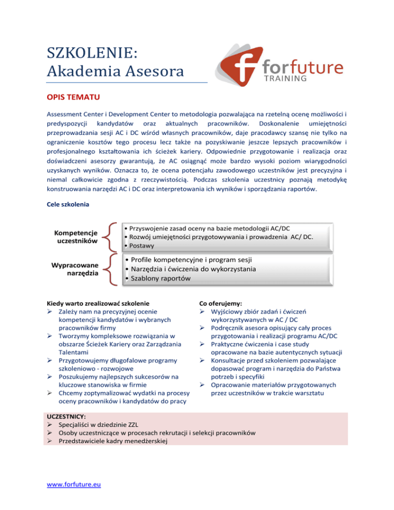 SZKOLENIE: Akademia Asesora OPIS TEMATU Assessment Center i Development Center to metodologia pozwalająca na rzetelną ocenę możliwości i predyspozycji kandydatów oraz aktualnych pracowników. Doskonalenie umiejętności przeprowadzania sesji AC i DC wśród własnych pracowników, daje pracodawcy szansę nie tylko na ograniczenie kosztów tego procesu lecz także na pozyskiwanie jeszcze lepszych pracowników i profesjonalnego kształtowania ich ścieżek kariery. Odpowiednie przygotowanie i realizacja oraz doświadczeni asesorzy gwarantują, że AC osiągnąć może bardzo wysoki poziom wiarygodności uzyskanych wyników. Oznacza to, że ocena potencjału zawodowego uczestników jest precyzyjna i niemal całkowicie zgodna z rzeczywistością. Podczas szkolenia uczestnicy poznają metodykę konstruowania narzędzi AC i DC oraz interpretowania ich wyników i sporządzania raportów. Cele szkolenia Kompetencje uczestników Wypracowane narzędzia • Przyswojenie zasad oceny na bazie metodologii AC/DC • Rozwój umiejętności przygotowywania i prowadzenia AC/ DC. • Postawy • Profile kompetencyjne i program sesji • Narzędzia i ćwiczenia do wykorzystania • Szablony raportów Kiedy warto zrealizować szkolenie Zależy nam na precyzyjnej ocenie kompetencji kandydatów i wybranych pracowników firmy Tworzymy kompleksowe rozwiązania w obszarze Ścieżek Kariery oraz Zarządzania Talentami Przygotowujemy długofalowe programy szkoleniowo - rozwojowe Poszukujemy najlepszych sukcesorów na kluczowe stanowiska w firmie Chcemy zoptymalizować wydatki na procesy oceny pracowników i kandydatów do pracy Co oferujemy: Wyjściowy zbiór zadań i ćwiczeń wykorzystywanych w AC / DC Podręcznik asesora opisujący cały proces przygotowania i realizacji programu AC/DC Praktyczne ćwiczenia i case study opracowane na bazie autentycznych sytuacji Konsultacje przed szkoleniem pozwalające dopasować program i narzędzia do Państwa potrzeb i specyfiki Opracowanie materiałów przygotowanych przez uczestników w trakcie warsztatu UCZESTNICY: Specjaliści w dziedzinie ZZL Osoby uczestniczące w procesach rekrutacji i selekcji pracowników Przedstawiciele kadry menedżerskiej www.forfuture.eu Skrócony program szkolenia (2 dni) ZAKRES Wprowadzenie do Assessment Center/Development Center – podstawowe wiadomości o metodologii Podstawowe zasady oceny metodą Assessment & Development Center Metodologia realizacji audytu kompetencyjnego metodą AC/DC. Przegląd stosowanych metod Narzędzia oceny kompetencji przydatne w trakcie oceny AC/DC Etapy przeprowadzenia oceny Case study Plany rozwoju kompetencji – co dalej po Assessment Center OPIS Blok ten wprowadza uczestników w obszar wiedzy związany z tematyką Centrum Oceny i Rozwoju Pokażemy jak przygotowywać sesje AC/DC , tak, aby trafnie diagnozowały kompetencje i predyspozycje zawodowe pracowników. Zapoznanie uczestników z zasadami, których spełnienie jest niezbędne dla przeprowadzenia sesji AC oraz ocenienia, dokonywania wyboru kandydatów do pracy oraz tworzenia planów rozwojowych. Omówienie metod stosowanych w trakcie oceny AC/DC. Każda z metod zostanie szczegółowo omówiona pod kątem dostosowania do badania konkretnych kompetencji oraz grupy osób. Praca na case study pozwoli na dopasowanie metod diagnozy do wymagań i realiów stanowiskowych. Prezentacja podstawowych typów narzędzi oceny kompetencji z wskazaniem zastosowania w AC/DC. Podczas tego bloku może zostać stworzony przykład narzędzia dostosowanego do potrzeb Państwa Firmy. Procedura przygotowania i przeprowadzenia sesji dostosowana do potrzeb i realiów Firmy. Opracowanie przykładowego programu AC/DC. Przygotowanie raportów, tworzonych po sesji. Podejmowanie decyzji selekcyjnych oraz udzielanie informacji zwrotnych. Sporządzanie ćwiczenia reprezentującego wybraną metodę AC/DC. Wejście w rolę asesora. Ocena kompetencji osób biorących udział w AC/DC. Trudności, zagrożenia oraz błędy oceny towarzyszących pracy asesora. Planowanie działań rozwojowych pracowników – uczestników AC/DC. Szacunkowy koszt Wielkość firmy Realizacja dwudniowego warsztatu w grupie od 6 od 12 uczestników Koszt 8200 zł Obejmuje Przygotowanie i realizację szkolenia Materiały dla uczestników Certyfikaty i raport Podany koszt nie obejmuje kwestii organizacyjnych (sala, pobyt, wyżywienie etc.) Działania opcjonalne Konsultacje i wsparcie we wdrażaniu programów AC/DC OPCJA 1 Superwizja pracy asesorów wewnątrzfirmowych OPCJA 2 Kontakt Kwestie organizacyjno - handlowe Kwestie merytoryczne www.forfuture.eu Grzegorz Filipowicz; [email protected]