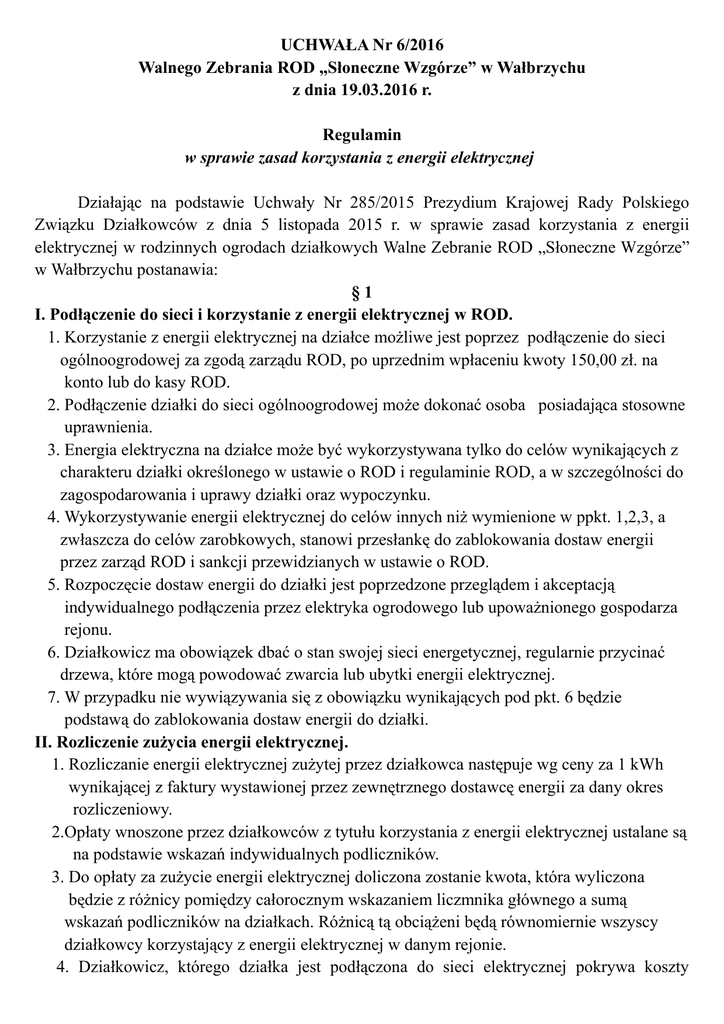 UCHWAŁA Nr 6/2016 Walnego Zebrania ROD „Słoneczne Wzgórze” w Wałbrzychu z dnia 19.03.2016 r. Regulamin w sprawie zasad korzystania z energii elektrycznej Działając na podstawie Uchwały Nr 285/2015 Prezydium Krajowej Rady Polskiego Związku Działkowców z dnia 5 listopada 2015 r. w sprawie zasad korzystania z energii elektrycznej w rodzinnych ogrodach działkowych Walne Zebranie ROD „Słoneczne Wzgórze” w Wałbrzychu postanawia: §1 I. Podłączenie do sieci i korzystanie z energii elektrycznej w ROD. 1. Korzystanie z energii elektrycznej na działce możliwe jest poprzez podłączenie do sieci ogólnoogrodowej za zgodą zarządu ROD, po uprzednim wpłaceniu kwoty 150,00 zł. na konto lub do kasy ROD. 2. Podłączenie działki do sieci ogólnoogrodowej może dokonać osoba posiadająca stosowne uprawnienia. 3. Energia elektryczna na działce może być wykorzystywana tylko do celów wynikających z charakteru działki określonego w ustawie o ROD i regulaminie ROD, a w szczególności do zagospodarowania i uprawy działki oraz wypoczynku. 4. Wykorzystywanie energii elektrycznej do celów innych niż wymienione w ppkt. 1,2,3, a zwłaszcza do celów zarobkowych, stanowi przesłankę do zablokowania dostaw energii przez zarząd ROD i sankcji przewidzianych w ustawie o ROD. 5. Rozpoczęcie dostaw energii do działki jest poprzedzone przeglądem i akceptacją indywidualnego podłączenia przez elektryka ogrodowego lub upoważnionego gospodarza rejonu. 6. Działkowicz ma obowiązek dbać o stan swojej sieci energetycznej, regularnie przycinać drzewa, które mogą powodować zwarcia lub ubytki energii elektrycznej. 7. W przypadku nie wywiązywania się z obowiązku wynikających pod pkt. 6 będzie podstawą do zablokowania dostaw energii do działki. II. Rozliczenie zużycia energii elektrycznej. 1. Rozliczanie energii elektrycznej zużytej przez działkowca następuje wg ceny za 1 kWh wynikającej z faktury wystawionej przez zewnętrznego dostawcę energii za dany okres rozliczeniowy. 2.Opłaty wnoszone przez działkowców z tytułu korzystania z energii elektrycznej ustalane są na podstawie wskazań indywidualnych podliczników. 3. Do opłaty za zużycie energii elektrycznej doliczona zostanie kwota, która wyliczona będzie z różnicy pomiędzy całorocznym wskazaniem liczmnika głównego a sumą wskazań podliczników na działkach. Różnicą tą obciążeni będą równomiernie wszyscy działkowcy korzystający z energii elektrycznej w danym rejonie. 4. Działkowicz, którego działka jest podłączona do sieci elektrycznej pokrywa koszty konserwacji i nadzoru nad siecią ogólnoogrodową oraz koniecznością bieżących napraw sieci w formie opłaty na konserwatora w kwocie uchwalonej na Walnym Zebraniu ROD, która doliczana będzie do kwoty za zużycie energii elektrycznej. 5. Zasady na jakich dokonywany będzie odczyt podliczników oraz osoby, które będą to wykonywać ustala zarząd ROD. 6. Działkowiec obowiązany jest udostępnić osobie upoważnionej przez zarząd ROD odczyt podlicznika jeżeli znajduje się on na terenie działki lub w altanie. 7 . Uniemożliwienie upoważnionej osobie lub nieudostępnienie w określonym przez zarząd ROD terminie, możliwości odczytu podlicznika, oraz opóźnienie z uiszczeniem opłaty z tytułu zużytej energii albo opłaty energetycznej będzie stanowić podstawę do zablokowania dostaw energii przez zarząd ROD. Informacja o terminie odczytu licznika wywieszana będzie na tablicy ogłoszeń z czternastodniowym wyprzedzeniem. III. Nielegalny pobór energii elektrycznej. 1. Stwierdzenie nielegalnego poboru energii elektrycznej stanowi podstawę do odłączenia energii od działki, zastosowanie sankcji ustawowych oraz dochodzenie od działkowca naprawienie szkody wyrządzonej ogrodowi poprzez zapłatę za zużytą poza opomiarowaniem energię elektryczną tj. kwotę stanowiącą wielkość niedoborów jakie wynikać będą z różnicy pomiędzy licznikiem głównym a sumą podliczników. W przypadku stwierdzenia więcej przypadków nielegalnego poboru prądu, ww. niedobory dzielone będą równomiernie pomiędzy tych działkowców. Ponowne podłączenie do sieci wymagać będzie zgody zarządu oraz uiszczenie opłaty jak w § 1 pkt.1 ppkt. 1 2. Za nielegalny pobór energii elektrycznej należy uznać w szczególności: a) podłączenie się do sieci energetycznej z pominięciem podlicznika, b) ingerencję w funkcjonowanie podlicznika, która wpływa na wskazanie ilości zużycia energii. 3. Nadzór i konserwacja sieci ogólno ogrodowej należy do zadań zarządu ROD. 4. Konserwację sieci ogólno ogrodowej i przyłączanie działek do sieci ogrodowej wykonuje, z upoważnienia (na zlecenie) zarządu ROD, gospodarz rejonu lub w razie konieczności osoba (elektryk) posiadająca do tego uprawnienia wymagane przepisami powszechnie obowiązującymi w tym zakresie. W tym celu zarząd ROD może zaangażować osobę spoza członków PZD w ogrodzie. Za zgodą zarządu działkowicz może osobiście zlecić podłączenie do sieci osobie posiadającej odpowiednie kwalifikacje. §2 I. Zarząd ROD w razie potrzeby powołuje komisję energetyczną i upoważnia ją w szczególności do: 1. Sprawdzania prawidłowości podłączeń instalacji elektrycznej na działkach, 2. Współpracy z działkowcami w zakresie związanym z korzystaniem z energii elektrycznej, 3. Rozwiązywania sporów związanych z wykorzystywaniem energii elektrycznej §3 1. W uzasadnionych przypadkach związanych z koniecznością sprawdzenia prawidłowości podłączeń lub w sytuacji wystąpienia przesłanek świadczących o nieprawidłowościach w korzystaniu z energii elektrycznej przez działkowca, komisja energetyczna może przeprowadzić kontrolę sieci na działce. 2. Przedmiotem badania podczas kontroli jest sposób wykorzystania energii, prawidłowość podłączeń, oraz funkcjonowanie i stan podlicznika. 3. Kontroli, w trakcie której wykryto nieprawidłowości