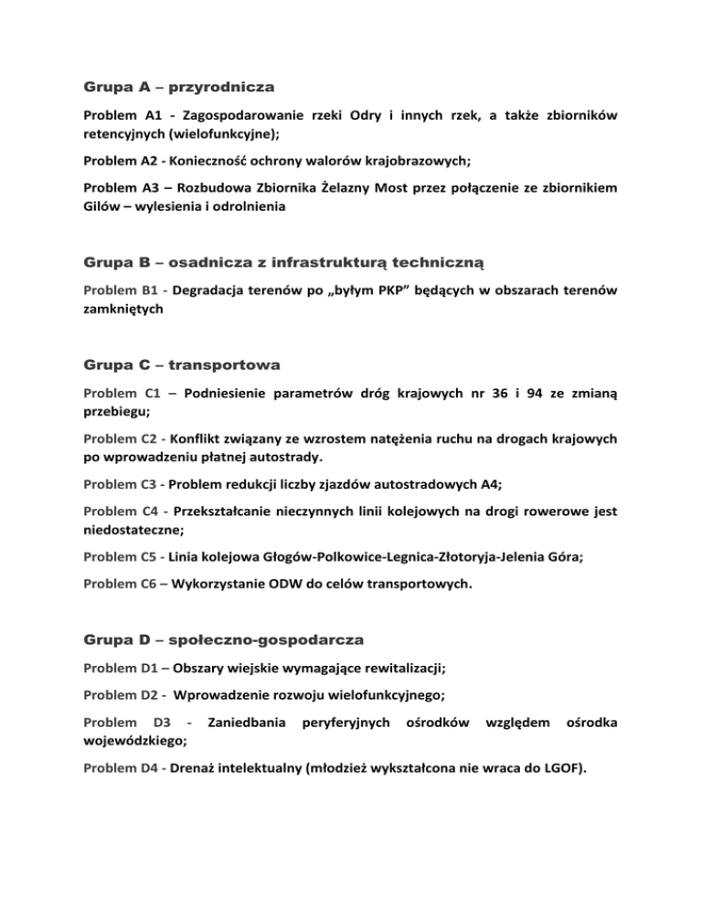 Grupa A – przyrodnicza Problem A1 - Zagospodarowanie rzeki Odry i innych rzek, a także zbiorników retencyjnych (wielofunkcyjne); Problem A2 - Konieczność ochrony walorów krajobrazowych; Problem A3 – Rozbudowa Zbiornika Żelazny Most przez połączenie ze zbiornikiem Gilów – wylesienia i odrolnienia Grupa B – osadnicza z infrastrukturą techniczną Problem B1 - Degradacja terenów po „byłym PKP” będących w obszarach terenów zamkniętych Grupa C – transportowa Problem C1 – Podniesienie parametrów dróg krajowych nr 36 i 94 ze zmianą przebiegu; Problem C2 - Konflikt związany ze wzrostem natężenia ruchu na drogach krajowych po wprowadzeniu płatnej autostrady. Problem C3 - Problem redukcji liczby zjazdów autostradowych A4; Problem C4 - Przekształcanie nieczynnych linii kolejowych na drogi rowerowe jest niedostateczne; Problem C5 - Linia kolejowa Głogów-Polkowice-Legnica-Złotoryja-Jelenia Góra; Problem C6 – Wykorzystanie ODW do celów transportowych. Grupa D – społeczno-gospodarcza Problem D1 – Obszary wiejskie wymagające rewitalizacji; Problem D2 - Wprowadzenie rozwoju wielofunkcyjnego; Problem D3 wojewódzkiego; Zaniedbania peryferyjnych ośrodków względem ośrodka Problem D4 - Drenaż intelektualny (młodzież wykształcona nie wraca do LGOF).