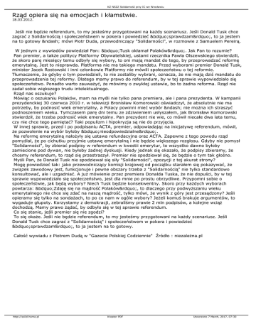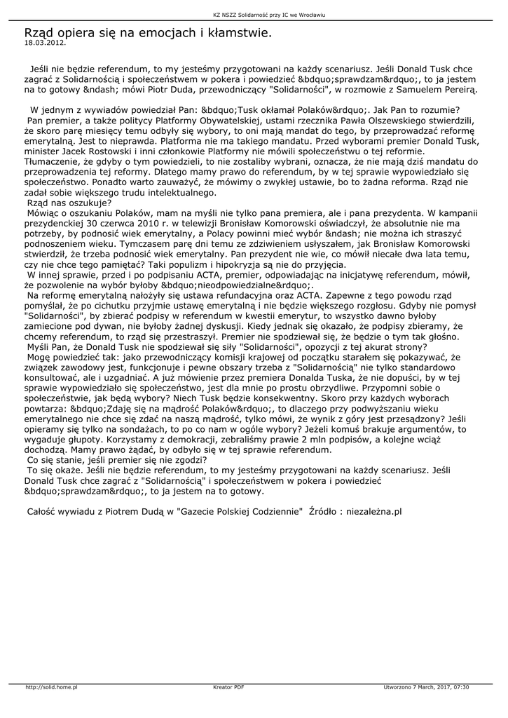KZ NSZZ Solidarność przy IC we Wrocławiu Rząd opiera się na emocjach i kłamstwie. 18.03.2012. Jeśli nie będzie referendum, to my jesteśmy przygotowani na każdy scenariusz. Jeśli Donald Tusk chce zagrać z Solidarnością i społeczeństwem w pokera i powiedzieć „sprawdzam”, to ja jestem na to gotowy – mówi Piotr Duda, przewodniczący "Solidarności", w rozmowie z Samuelem Pereirą. W jednym z wywiadów powiedział Pan: „Tusk okłamał Polaków”. Jak Pan to rozumie? Pan premier, a także politycy Platformy Obywatelskiej, ustami rzecznika Pawła Olszewskiego stwierdzili, że skoro parę miesięcy temu odbyły się wybory, to oni mają mandat do tego, by przeprowadzać reformę emerytalną. Jest to nieprawda. Platforma nie ma takiego mandatu. Przed wyborami premier Donald Tusk, minister Jacek Rostowski i inni członkowie Platformy nie mówili społeczeństwu o tej reformie. Tłumaczenie, że gdyby o tym powiedzieli, to nie zostaliby wybrani, oznacza, że nie mają dziś mandatu do przeprowadzenia tej reformy. Dlatego mamy prawo do referendum, by w tej sprawie wypowiedziało się społeczeństwo. Ponadto warto zauważyć, że mówimy o zwykłej ustawie, bo to żadna reforma. Rząd nie zadał sobie większego trudu intelektualnego. Rząd nas oszukuje? Mówiąc o oszukaniu Polaków, mam na myśli nie tylko pana premiera, ale i pana prezydenta. W kampanii prezydenckiej 30 czerwca 2010 r. w telewizji Bronisław Komorowski oświadczył, że absolutnie nie ma potrzeby, by podnosić wiek emerytalny, a Polacy powinni mieć wybór – nie można ich straszyć podnoszeniem wieku. Tymczasem parę dni temu ze zdziwieniem usłyszałem, jak Bronisław Komorowski stwierdził, że trzeba podnosić wiek emerytalny. Pan prezydent nie wie, co mówił niecałe dwa lata temu, czy nie chce tego pamiętać? Taki populizm i hipokryzja są nie do przyjęcia. W innej sprawie, przed i po podpisaniu ACTA, premier, odpowiadając na inicjatywę referendum, mówił, że pozwolenie na wybór byłoby „nieodpowiedzialne”. Na reformę emerytalną nałożyły się ustawa refundacyjna oraz ACTA. Zapewne z tego powodu rząd pomyślał, że po cichutku przyjmie ustawę emerytalną i nie będzie większego rozgłosu. Gdyby nie pomysł "Solidarności", by zbierać podpisy w referendum w kwestii emerytur, to wszystko dawno byłoby zamiecione pod dywan, nie byłoby żadnej dyskusji. Kiedy jednak się okazało, że podpisy zbieramy, że chcemy referendum, to rząd się przestraszył. Premier nie spodziewał się, że będzie o tym tak głośno. Myśli Pan, że Donald Tusk nie spodziewał się siły "Solidarności", opozycji z tej akurat strony? Mogę powiedzieć tak: jako przewodniczący komisji krajowej od początku starałem się pokazywać, że związek zawodowy jest, funkcjonuje i pewne obszary trzeba z "Solidarnością" nie tylko standardowo konsultować, ale i uzgadniać. A już mówienie przez premiera Donalda Tuska, że nie dopuści, by w tej sprawie wypowiedziało się społeczeństwo, jest dla mnie po prostu obrzydliwe. Przypomni sobie o społeczeństwie, jak będą wybory? Niech Tusk będzie konsekwentny. Skoro przy każdych wyborach powtarza: „Zdaję się na mądrość Polaków”, to dlaczego przy podwyższaniu wieku emerytalnego nie chce się zdać na naszą mądrość, tylko mówi, że wynik z góry jest przesądzony? Jeśli opieramy się tylko na sondażach, to po co nam w ogóle wybory? Jeżeli komuś brakuje argumentów, to wygaduje głupoty. Korzystamy z demokracji, zebraliśmy prawie 2 mln podpisów, a kolejne wciąż dochodzą. Mamy prawo żądać, by odbyło się w tej sprawie referendum. Co się stanie, jeśli premier się nie zgodzi? To się okaże. Jeśli nie będzie referendum, to my jesteśmy przygotowani na każdy scenariusz. Jeśli Donald Tusk chce zagrać z "Solidarnością" i społeczeństwem w pokera i powiedzieć „sprawdzam”, to ja jestem na to gotowy. Całość wywiadu z Piotrem Dudą w "Gazecie Polskiej Codziennie" Źródło : niezależna.pl http://solid.home.pl Kreator PDF Utworzono 7 March, 2017, 07:30