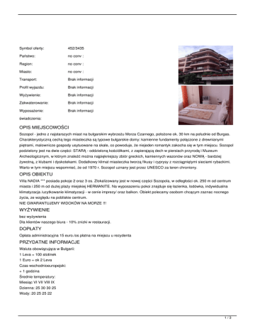 Symbol oferty: 452/3435 Państwo: no conv : Region: no conv : Miasto: no conv : Transport: Brak informacji Profil wyjazdu: Brak informacji Wyżywienie: Brak informacji Zakwaterowanie: Brak informacji Wyposażenie: Brak informacji świadczenia: OPIS MIEJSCOWOŚCI Sozopol - jedno z najstarszych miast na bułgarskim wybrzeżu Morza Czarnego, położone ok. 30 km na południe od Burgas. Charakterystyczną cechą tego miasteczka są typowe bułgarskie domy: kamienne fundamenty połączone z drewnianymi piętrami, malownicze gospody usytuowane na skale, co powoduje, że niejeden romantyk zakocha się w tym miejscu. Sozopol podzielony jest na dwie części: STARĄ - oddzieloną kościółkami, z zapierającą dech w piersiach przyrodą i Muzeum Archeologicznym, w którym znaleźć można najpiękniejszy zbiór greckich, kamiennych wazonów oraz NOWĄ - bardziej żywotną, z klubami i dyskotekami. Dodatkowy klimat miasteczka tworzą fikusy i cyprysy z rozciągniętymi sieciami rybackimi. Warto w tym miejscu wspomnieć, że od 1970 r. Sozopol uznany jest przez UNESCO za teren chroniony. OPIS OBIEKTU Villa NADIA *** posiada pokoje 2 oraz 3 os. Zlokalizowany jest w nowej części Sozopola, w odległości ok. 250 m od centrum miasta i 250 m od dużej plaży miejskiej HERMANITE. Na wyposazeniu pokoi znajduje się łazienka, lodówka, indywidualna klimatyzacja /uzytkowanie klimatyzacji - w cenie imprezy/ oraz balkon. Obiekt polecamy osobom chcącym zaznac nocnego życia, ze względu na pobliskie centrum. NIE GWARANTUJEMY WIDOKÓW NA MORZE !!! WYŻYWIENIE bez wyżywienia Dla klientów naszego biura - 10% znizki w restauracji. DOPŁATY Opłata administracyjna 15 euro./os płatna na miejscu u rezydenta PRZYDATNE INFORMACJE Waluta obowiązująca w Bułgarii: 1 Leva = 100 stotinek 1 Euro = ok 2 Leva Czas wschodnioeuropejski: + 1 godzina Średnie temperatury: Miesiąc VI VII VIII IX Dzienna: 25 30 30 25 Wody: 20 25 25 22 1/3 GODZINY I MIEJSCE WYJAZDU WYJAZD: KATOWICE GODZ: 06.00 UL. KOPERNIKA 16 Atrakcje: WYCIECZKI FAKULTATYWNE- BUŁGARIA Istambuł - 2 dni ( ok. 65 €) Wycieczka autokarowa do dawnej stolicy Turcji, miasta Orientu o wielowiekowej historii. W programie: zwiedzanie miasta: m.in. Błękitny Meczet, Hipodrom, pałac sułtanów Top Kapi. Dodatkowo będzie możliwość skosztowania tradycyjnej tureckiej kuchni, zobaczenia pokazu tańca brzucha oraz występu zespołów folklorystycznych, a także zrobienia zakupów na Wielkim Bazarze, czy rejsu statkiem po Bosforze. W cenie zapewniony jest także nocleg w hotelu ***, klimatyzowanym, w samym historycznym centrum Stambułu, obiad i śniadanie. Istambuł - 1 dzień ( ok. 47 € + wiza turecka 15 € ) Wariant jednodniowy wycieczki do byłej stolicy Cesarstwa Bizantyjskiego - Konstantynopola. Zwiedzanie: Błękitny Meczet, Hipodrom; pierwsze wrota pałacu cesarza Top Kapi. Tam można poczuć orientalnego ducha, europejski luksus oraz historię najbogatszego miasta Cesarstwa. W cenie obiad. Nesseber + bułgarski wieczór ( wino bez końca) ( ok. 25 € )-wino w cenie Wyprawa do miasta zaliczanego do pomników kultury, jednego z dziewięciu obiektów w Bułgarii wpisanych na Listę Swiatowego Dziedzictwa Kultury UNESCO. Zwiedzanie miasta z przewodnikiem, czas wolny na zakupy. Wieczór bułgarski organizowany jest w restauracji urządzonej w stylu ludowym. Od chwili przybycia rozpoczyna się program rozrywkowy - wspaniały roztańczony i rozśpiewany program folklorystyczny w wykonaniu kilkunastoosobowego zespołu artystów ludowych. Występy zespołu kończy wspólny z turystami taniec bałkański "horo", w takt którego wszyscy udają się do ogniska gdzie na rozżarzonych węglach boso tańczy "Nestinar". W czasie całego wieczoru wino leje się strumieniami, bo można je pić w nieograniczonych ilościach. Do jedzenia podawane są potrawy kuchni bułgarskiej - sałata szopska, a do niej obowiązkowo po bułgarsku kieliszek rakiji, zupa grochowa z ziołami, ziemniaki gotowane z kiełbaskami (nadenica) i kotletem schabowym (parżoła). Dotego chleb biały miękki, maczany w przyprawach ziołowych. Piknik na wyspie św. Iwana ( ok. 15 € ) Typowy piknik połączony z plażowaniem, ,morskimi i słonecznymi kąpielami w Morzu Czarnym. Podczas wycieczki można smakować bułgarkich smakołyków, owoców morza i sałatek, które można samodzielnie przyrządzić. Wymagane stroje kąpielowe, kremy do opalania z filtrem UV, dobry humor. Warna- Delfinarium (ok. 55 € ) Zwiedzanie starożytnego miasta z przewodnikiem m.in. łaźnie rzymskie, wizyta w Delfinarium, wizyta w skalnym monastyrze -Aladza”. Czas wolny Podane ceny są cenami orientacyjnymi, mogą ulec zmianie. Wszystkie w/w wycieczki organizowane są przy współpracy z bułgarskimi biurami podróży na miejscu. Szczegóły dotyczące wycieczek fakultatywnych znajdziecie Państwo u rezydenta w Bułgarii. Rezydent i B.P. Małgosia Travel nie ponoszą odpowiedzialności za jakość wykonywanych usług. Istnieje również możliwość zorganizowania innych wycieczek na życzenie Klientów (grupa nie może być mniejsza, niż 30 osób). TERMINY: CENNIK: 2/3 Długość pobytu: dni Grupa cenowa: Waluta: PLN Aktualne ceny z systemu S.A.R.T. (-) - cena usługi, podatku kalkulowana przy osobie lub gratis (*) - kwota wliczona w cenę standardową 3/3