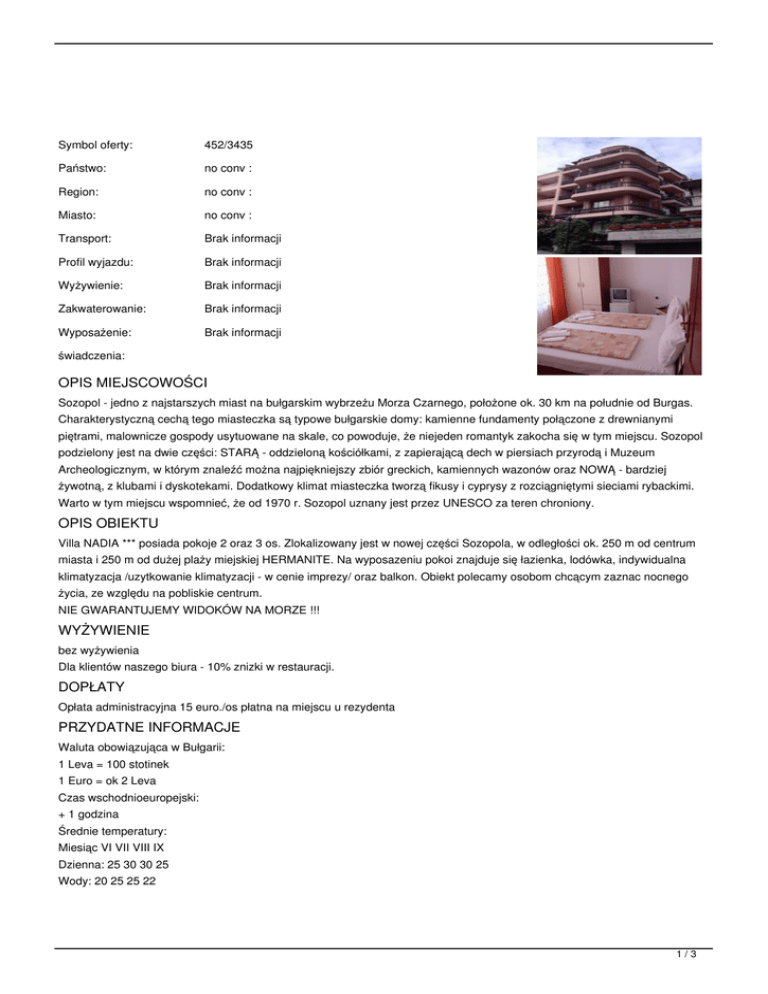 opis miejscowości opis obiektu wyżywienie dopłaty przydatne