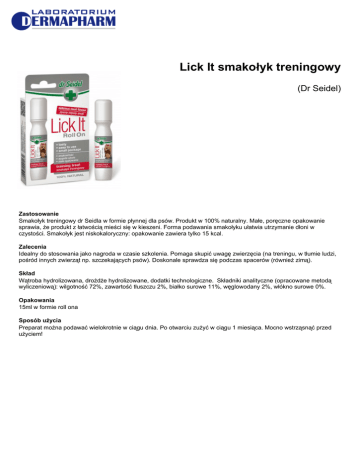 Lick It smakołyk treningowy (Dr Seidel) Zastosowanie Smakołyk treningowy dr Seidla w formie płynnej dla psów. Produkt w 100% naturalny. Małe, poręczne opakowanie sprawia, że produkt z łatwością mieści się w kieszeni. Forma podawania smakołyku ułatwia utrzymanie dłoni w czystości. Smakołyk jest niskokaloryczny: opakowanie zawiera tylko 15 kcal. Zalecenia Idealny do stosowania jako nagroda w czasie szkolenia. Pomaga skupić uwagę zwierzęcia (na treningu, w tłumie ludzi, pośród innych zwierząt np. szczekających psów). Doskonale sprawdza się podczas spacerów (również zimą). Skład Wątroba hydrolizowana, drożdże hydrolizowane, dodatki technologiczne. Składniki analityczne (opracowane metodą wyliczeniową): wilgotność 72%, zawartość tłuszczu 2%, białko surowe 11%, węglowodany 2%, włókno surowe 0%. Opakowania 15ml w formie roll ona Sposób użycia Preparat można podawać wielokrotnie w ciągu dnia. Po otwarciu zużyć w ciągu 1 miesiąca. Mocno wstrząsnąć przed użyciem!