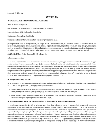 Sygn. akt II K 857/11 WYROK W IMIENIU RZECZYPOSPOLITEJ POLSKIEJ Dnia 18 marca 2015 roku Sąd Rejonowy w Lęborku w II Wydziale Karnym w składzie: Przewodniczący SSR Aleksandra Szumińska Protokolant Magdalena Szablińska w obecności Prokuratora Prokuratury Rejonowej w Lęborku D. Z. po rozpoznaniu dnia 14 lutego 2012r., 16 lutego 2012r., 27 marca 2012r., 24 kwietnia 2012r., 12 czerwca 2012r., 26 lipca 2012r., 21 sierpnia 2012r., 25 września 2012r., 04 grudnia 2012r., 18 grudnia 2012r., 28 maja 2013 r., 06 sierpnia 2013 r., 01 października 2013 r., 19 listopada 2013 r., 09 stycznia 2014 r., 10 kwietnia 2014 r., 14 sierpnia 2014 r., 30 września 2014 r., 04 grudnia 2015r., 08 stycznia 2015r., 29 stycznia 2015r., 12 marca 2015r. sprawy karnej M. B. (1) (B.) ur. (...) w S., syna M. i D. z domu K., oskarżonego o to, że : I. w dniu 5 lipca 2011 r. w Ł. nieumyślnie sprowadził zdarzenie zagrażające mieniu w wielkich rozmiarach mające postać pożaru obiektu wypoczynkowego (...) w ten sposób, że nie zachował należytych środków ostrożności i wbrew ostrzeżeniom podległych mu pracowników o nieszczelności kominka i wydobywającym się dymie, małą odległością od komina palnej konstrukcji dachu polecił im spalenie pozostałych po remoncie podłogi desek w kominku będącym w złym stanie technicznym oraz nakazał pozostawienie nie wygaszonego paleniska kominka, w wyniku czego spaleniu uległ murowany budynek mieszkalno gospodarczy o powierzchni zabudowy 831 m2 powodując straty w kwocie 244746 zł na szkodę Powiatu (...) reprezentowanego przez Starostę (...), tj. o czyn z art. 163 § 2 k.k. II. w 2009 r. w Ł. bez wymaganego pozwolenia na budowę prowadził roboty budowlane zlokalizowane na działkach nr (...) obr. 2 w Ł. przy ul. (...) polegające na wybudowaniu: • 6 sztuk drewnianych parterowych domków letniskowych o wymiarach w rzucie 5 x 5 m, wysokości 2,7 m, krytych dwuspadowymi dachami z pokryciem papą, posadowionych na pustakach betonowych, • wiaty o konstrukcji wspornej drewnianej o wymiarach 7,59 x 8,98 m nietrwale związanej z gruntem, krytej dachem wielospadowym z pokryciem deskami i papą, tj. o przestępstwo z art. 90 ustawy z dnia 7 lipca 1994 r. Prawo budowlane 1. uznaje oskarżonego M. B. (1) za winnego tego, że w dniu 5 lipca 2011 r. w Ł. nieumyślnie sprowadził zdarzenie, zagrażające mieniu w wielkich rozmiarach w postaci pożaru obiektu wypoczynkowego (...) w ten sposób, że nie zachował ostrożności wymaganej w danych okolicznościach i naruszając reguły ostrożności, jako pracodawca, odpowiedzialny w myśl przepisu Kodeksu pracy do zapewnienia bezpiecznych i higienicznych warunków pracy, nie zapewniając szkolenia wstępnego w zakresie bezpieczeństwa i higieny pracy oraz instruktażu w zakresie bezpiecznego spalania drewna, jak i dopuszczając do palenia desek osoby, nie posiadające potrzebnych umiejętności, wydał osobom zatrudnionym na podstawie umowy zlecenia A. P. (1) i Ł. L. (1) polecenie spalenia w otwartym kominku, z nieszczelnościami, wybudowanym niezgodnie z przepisami ustawy z dnia 7 lipca 1994 r. Prawo budowlane i § 132 ust. 3 i § 209 ust. 2 pkt 3 i 5 rozporządzenia Ministra Infrastruktury z dnia 12 kwietnia 2002 r. w sprawie warunków technicznych, jakim powinny odpowiadać budynki i ich usytuowanie (Dz. U z 2002 r. poz. 690), bez odbioru kominiarskiego i przeciwpożarowego, stanowiącego „samowolę budowlaną” dużej ilości „odpadów” – drewna (klepek pochodzących z parkiet), ułożonych na stosie, nie instruując A. P. (1) i Ł. L. (1) w zakresie rodzaju paliwa , które może być dostarczone do kominka oraz przewidywanej mocy komina, czyli ilości paliwa( drewna) którą można było włożyć do kominka, aby zapewnić właściwe odprowadzanie spalin, przy czym osoby wykonujące zlecenie nie były w stanie zdawać sobie sprawy z ograniczeń w dokładaniu drewna, aby nie przekroczyć „ mocy dopuszczalnej”, wskutek czego włożyli do paleniska nadmierną ilość „ odpadów”- drewna, tak że spaliny nie były w całości odprowadzane przez komin, a iskry wydostawały się na zewnątrz, wskutek czego doszło do nadmiernego rozgrzania komina i wysoka temperatura oraz gorący dym doprowadziły do zapalenia się strzechy nad kominem po zakończeniu spalania, z uwagi na przekroczenie przez temperaturę zewnętrzną komina temperatury zapalenia strzechy i w wyniku pożaru spaleniu uległ murowany budynek hotelowo – gastronomiczny o powierzchni zabudowy 831 m2 i wartości 427.000 zł, na szkodę Powiatu (...), reprezentowanego przez Starostę (...), to jest przestępstwa z art. 163 § 1 pkt. 1 i § 2 k.k. i za to z mocy art. 163 § 2 k.k. skazuje go na karę roku i 4 ( czterech) miesięcy pozbawienia wolności; 2. uznaje oskarżonego M. B. (1) za winnego popełnienia zarzucanego mu czynu, opisanego w pkt. II oskarżenia, wyczerpującego znamiona przestępstwa z art. 90 ustawy z dnia 7 lipca 1994 r. Prawo budowlane i za to z mocy art. 90 cytowanej ustawy skazuje go na karę 8 ( ośmiu) miesięcy pozbawienia wolności; 3. na zasadzie art. 85 k.k. i art. 86 § 1k.k. łączy orzeczone wobec oskarżonego M. B. (1) jednostkowe kary pozbawienia wolności i wymierza wobec niego karę łączną roku i 6 ( sześciu) miesięcy pozbawienia wolności, której wykonanie z mocy art. 69 § 1 i § 2 k.k. i art. 70 § 1 pkt 1 k.k. warunkowo zawiesza na okres próby 3 ( trzech) lat; 4. na mocy art. 46 § 1 k.k. orzeka od oskarżonego M. B. (1) na rzecz Powiatu (...) reprezentowanego przez Starostę (...) 427.000 zł ( czterysta dwadzieścia siedem tysięcy złotych) tytułem obowiązku naprawienia wyrządzonej przestępstwem szkody w całości; 5. zasądza od oskarżonego na rzecz Skarbu Państwa 9.793,33 zł tytułem zwrotu kosztów procesu. Sygn. akt II K 857/11 UZASADNIENIE Sąd ustalił następujący stan faktyczny: W dniu 13 kwietnia 2004 roku Zarząd Powiatu (...) zawarł z M. B. (1) prowadzącym przedsięb