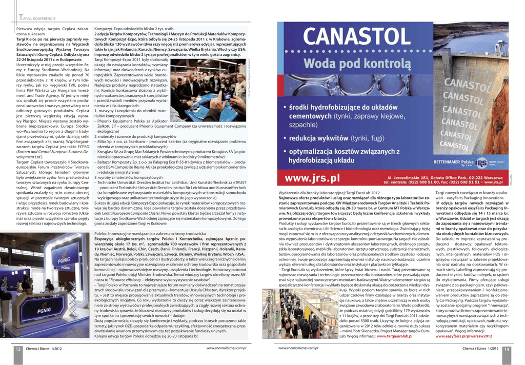 Fot. redakcja Poleko: Innowacyjne rozwiązania z zakresu ochrony środowiska Ekspozycja ubiegłorocznych targów Poleko i Komtechnika, zajmująca łącznie powierzchnię około 17 tys. m2, zgromadziła 700 wystawców i firm reprezentowanych z 19 krajów: Austrii, Belgii, Chin, Czech, Danii, Finlandii, Francji, Hiszpanii, Holandii, Kanady, Niemiec, Norwegii, Polski, Szwajcarii, Szwecji, Ukrainy, Wielkiej Brytanii, Włoch i USA. Na targach najlepsi polscy producenci i dystrybutorzy, a także wielu zagranicznych liderów zaprezentowało innowacyjne rozwiązania w zakresie ochrony środowiska oraz gospodarki komunalnej – najnowocześniejsze maszyny, urządzenia i technologie. Honorowy patronat nad targami Poleko objął Minister Środowiska. Temat wiodący targów określony przez Ministra to "Resource efficiency – efektywne wykorzystywanie zasobów". – Targi Poleko w Poznaniu to najważniejsze forum wymiany doświadczeń na temat przyjaznych środowisku rozwiązań dla przemysłu – komentuje Urszula Chłystun, dyrektor projektu. – Jest to miejsce propagowania aktualnych trendów, innowacyjnych technologii i proekologicznych inicjatyw. Co roku wydarzenie to cieszy się coraz większym zainteresowaniem ze strony wystawców i profesjonalnych zwiedzających, a ciągły rozwój sektora ochrony środowiska sprawia, że kluczowi dostawcy produktów i usług decydują się na udział w tym spotkaniu i prezentację swoich nowości – dodaje. Dużą popularnością cieszyły się konferencje i wykłady, podczas których poruszono takie tematy, jak: rynek OZE, gospodarka odpadami, recykling, efektywność energetyczna, przeciwdziałanie awariom przemysłowym czy też pozyskiwanie funduszy unijnych. Kolejna edycja targów Poleko odbędzie się 20-23 listopada br. 12 Chemia i Biznes 1/2012 www.chemiaibiznes.com.pl REKLAMA Kompozyt-Expo odwiedziło blisko 2 tys. osób 2 edycja Targów Kompozytów, Technologii i Maszyn do Produkcji Materiałów Kompozytowych Kompozyt-Expo, która odbyła się 24-25 listopada 2011 r. w Krakowie, zgromadziła blisko 130 wystawców (dwa razy więcej niż premierowa edycja), reprezentujących takie kraje, jak Finlandia, Kanada, Niemcy, Szwajcaria, Wielka Brytania, Włochy czy USA. Imprezę odwiedziło blisko 2 tysiące profesjonalistów, w tym wielu gości z zagranicy. Targi Kompozyt-Expo 2011 były doskonałą okazją do nawiązania kontaktów, wymiany informacji oraz doświadczeń z rynków europejskich. Zaprezentowano wiele branżowych nowości i innowacyjnych rozwiązań. Najlepsze produkty nagrodzono statuetkami. Komisja konkursowa złożona z wybitnych naukowców, branżowych specjalistów i przedstawicieli mediów przyznała wyróżnienia w kilku kategoriach: 1. maszyny i urządzenia do obróbki materiałów kompozytowych • Phoenix Equipment Polska za Aplikator Żelkotu Elf – producent Phoenix Equipment Company (za uniwersalność i rozwiązanie ekologiczne) 2. materiały i surowce do produkcji kompozytów • Milar Sp. z o.o. za Saerfoam – producent Saertex (za oryginalne rozwiązanie problemu rdzenia w kompozytach przekładkowych) • Krosglass SA za Grupę Mat Szklanych Powierzchniowych, producent Krosglass SA (za pionierskie opracowanie mat szklanych z włóknami o średnicy 9 mikrometrów) • Baltazar Kompozyty Sp. z o.o. za Palapreg Eco P-55-01-żywica z biomateriałów – producent DSM Composite Resins AG (za proekologiczną żywicę z udziałem biokomponentów i redukcję emisji styrenu) 3. wyroby z materiałów kompozytowych • Technische Universitat Dresden Institut Fur Leichtbau Und Kunststofftechnik za eTRUST – producent Technische Universität Dresden Institut für Leichtbau und Kunststofftechnik (za kompleksowe wykorzystanie materiałów kompozytowych w konstrukcji samochodu wyścigowego oraz unikatowe technologie użyte do jego wytworzenia). Sukces drugiej edycji Kompozyt-Expo pokazuje, że rynek materiałów kompozytowych rozwija się bardzo dynamicznie. Idea powołania targów została doceniona przez przedstawicieli Central European Composite Cluster. Nowo powstały klaster będzie zrzeszał firmy i instytucje z Europy Środkowo-Wschodniej zajmujące się materiałami kompozytowymi. Do tego grona zostały zaproszone Targi w Krakowie. fot. MT Targi Sp. z o.o. Pierwsza edycja targów Ceplast zakończona sukcesem Targi Kielce po raz pierwszy zaprosiły wystawców na organizowaną na Węgrzech Środkowoeuropejską Wystawę Tworzyw Sztucznych i Gumy Ceplast. Odbyła się ona 22-24 listopada 2011 r. w Budapeszcie. Uczestniczyły w niej przede wszystkim firmy z Europy Środkowo–Wschodniej. Na liście wystawców znalazło się ponad 70 przedsiębiorstw z 10 krajów, w tym liderzy rynku, jak np. węgierski TVK, polska firma P&F Wartacz czy Hungarian Investment and Trade Agency. W jednym miejscu spotkali się przede wszystkim producenci surowców i maszyn, przetwórcy oraz odbiorcy gotowych produktów. Ceplast jest pierwszą węgierską edycją wystawy Plastpol. Miejsce wystawy zostało wybrane nieprzypadkowo. Europa Środkowo–Wschodnia to region z długimi tradycjami przetwórczymi, gdzie działają setki firm związanych z tą branżą. Współorganizatorem targów Ceplast jest także ECEBD (Eastern and Central European Business Development Ltd.). Targom Ceplast towarzyszyło II Środkowoeuropejskie Forum Przetwórców Tworzyw Sztucznych, którego tematem głównym było zwiększenie zysku firm przetwórstwa tworzyw sztucznych na rynku Europy Centralnej. Wśród zagadnień dwudniowego spotkania znalazły się m.in. ocena obecnej sytuacji w przemyśle tworzyw sztucznych i wizje przyszłości, rynek budowlany i konstrukcji, moda na tworzywa sztuczne, tworzywa sztuczne w rozwoju rolnictwa (Ukraina) oraz przede wszystkim szeroko pojęty rozwój sektora i najnowszych technologii. Fot. Archiwum Targów w Krakowie Targi, konferencje Wydarzenie dla branży laboratoryjnej: Targi EuroLab 2012 Najnowsza oferta produktów i usług oraz rozwiąza