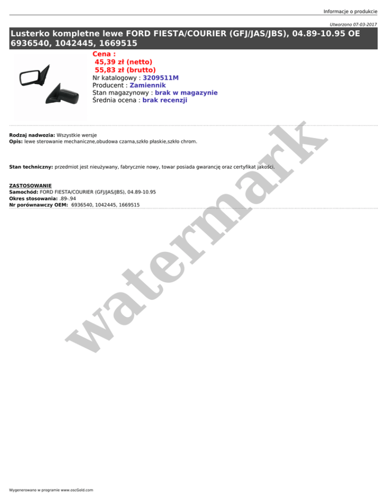 Informacje o produkcie Utworzono 07-03-2017 Lusterko kompletne lewe FORD FIESTA/COURIER (GFJ/JAS/JBS), 04.89-10.95 OE 6936540, 1042445, 1669515 Cena : 45,39 zł (netto) 55,83 zł (brutto) Nr katalogowy : 3209511M Producent : Zamiennik Stan magazynowy : brak w magazynie Średnia ocena : brak recenzji er m ar k Rodzaj nadwozia: Wszystkie wersje Opis: lewe sterowanie mechaniczne,obudowa czarna,szkło płaskie,szkło chrom. Stan techniczny: przedmiot jest nieużywany, fabrycznie nowy, towar posiada gwarancję oraz certyfikat jakości. w at ZASTOSOWANIE Samochód: FORD FIESTA/COURIER (GFJ/JAS/JBS), 04.89-10.95 Okres stosowania: .89-.94 Nr porównawczy OEM: 6936540, 1042445, 1669515 Wygenerowano w programie www.oscGold.com