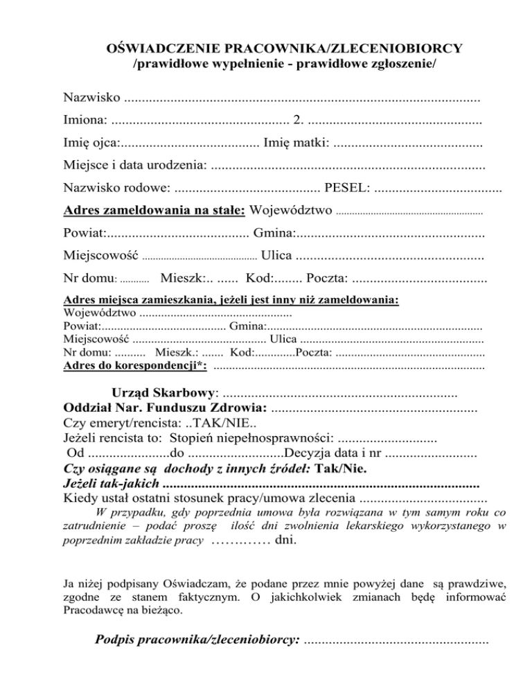 OŚWIADCZENIE PRACOWNIKA/ZLECENIOBIORCY /prawidłowe wypełnienie - prawidłowe zgłoszenie/ Nazwisko .................................................................................................... Imiona: .................................................. 2. ................................................. Imię ojca:....................................... Imię matki: .......................................... Miejsce i data urodzenia: ............................................................................. Nazwisko rodowe: ......................................... PESEL: .................................... Adres zameldowania na stałe: Województwo ....................................................... Powiat:........................................ Gmina:..................................................... Miejscowość ........................................... Ulica ..................................................... Nr domu: ........... Mieszk:.. ...... Kod:........ Poczta: ...................................... Adres miejsca zamieszkania, jeżeli jest inny niż zameldowania: Województwo ................................................. Powiat:........................................ Gmina:..................................................................... Miejscowość ........................................... Ulica ........................................................... Nr domu: .......... Mieszk.: ....... Kod:.............Poczta: ................................................ Adres do korespondencji*: ....................................................................................... Urząd Skarbowy: .................................................................. Oddział Nar. Funduszu Zdrowia: .......................................................... Czy emeryt/rencista: ..TAK/NIE.. Jeżeli rencista to: Stopień niepełnosprawności: ............................ Od .......................do ...........................Decyzja data i nr .......................... Czy osiągane są dochody z innych źródeł: Tak/Nie. Jeżeli tak-jakich ......................................................................................... Kiedy ustał ostatni stosunek pracy/umowa zlecenia .................................... W przypadku, gdy poprzednia umowa była rozwiązana w tym samym roku co zatrudnienie – podać proszę ilość dni zwolnienia lekarskiego wykorzystanego w poprzednim zakładzie pracy …….…… dni. Ja niżej podpisany Oświadczam, że podane przez mnie powyżej dane są prawdziwe, zgodne ze stanem faktycznym. O jakichkolwiek zmianach będę informować Pracodawcę na bieżąco. Podpis pracownika/zleceniobiorcy: ....................................................