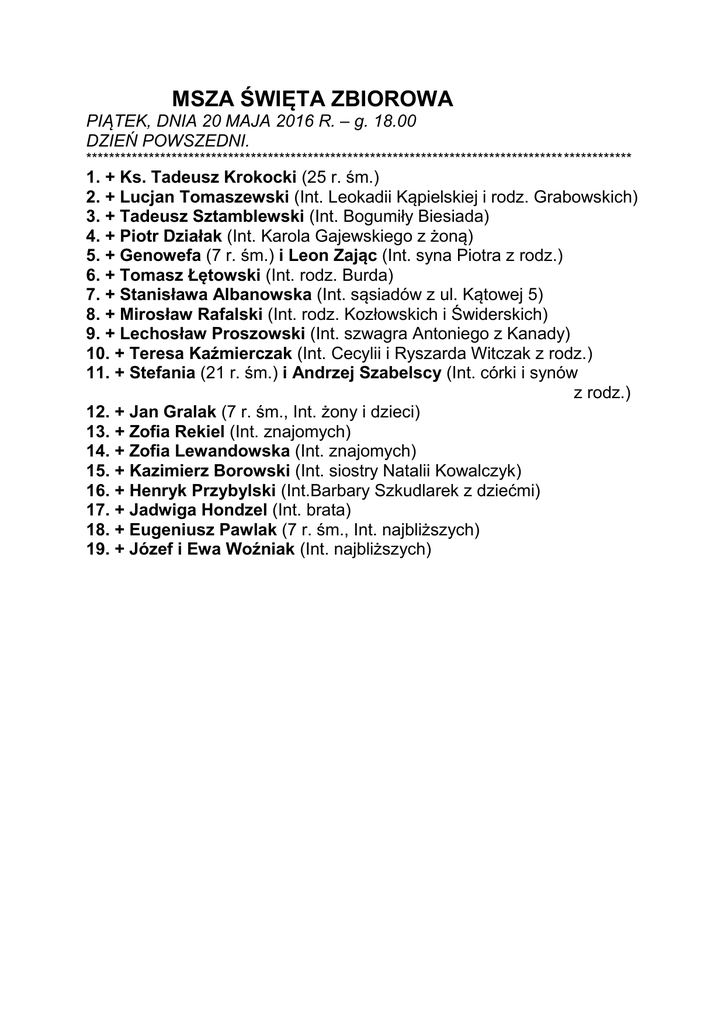 MSZA ŚWIĘTA ZBIOROWA PIĄTEK, DNIA 20 MAJA 2016 R. – g. 18.00 DZIEŃ POWSZEDNI. ************************************************************************************************ 1. + Ks. Tadeusz Krokocki (25 r. śm.) 2. + Lucjan Tomaszewski (Int. Leokadii Kąpielskiej i rodz. Grabowskich) 3. + Tadeusz Sztamblewski (Int. Bogumiły Biesiada) 4. + Piotr Działak (Int. Karola Gajewskiego z żoną) 5. + Genowefa (7 r. śm.) i Leon Zając (Int. syna Piotra z rodz.) 6. + Tomasz Łętowski (Int. rodz. Burda) 7. + Stanisława Albanowska (Int. sąsiadów z ul. Kątowej 5) 8. + Mirosław Rafalski (Int. rodz. Kozłowskich i Świderskich) 9. + Lechosław Proszowski (Int. szwagra Antoniego z Kanady) 10. + Teresa Kaźmierczak (Int. Cecylii i Ryszarda Witczak z rodz.) 11. + Stefania (21 r. śm.) i Andrzej Szabelscy (Int. córki i synów z rodz.) 12. + Jan Gralak (7 r. śm., Int. żony i dzieci) 13. + Zofia Rekiel (Int. znajomych) 14. + Zofia Lewandowska (Int. znajomych) 15. + Kazimierz Borowski (Int. siostry Natalii Kowalczyk) 16. + Henryk Przybylski (Int.Barbary Szkudlarek z dziećmi) 17. + Jadwiga Hondzel (Int. brata) 18. + Eugeniusz Pawlak (7 r. śm., Int. najbliższych) 19. + Józef i Ewa Woźniak (Int. najbliższych)