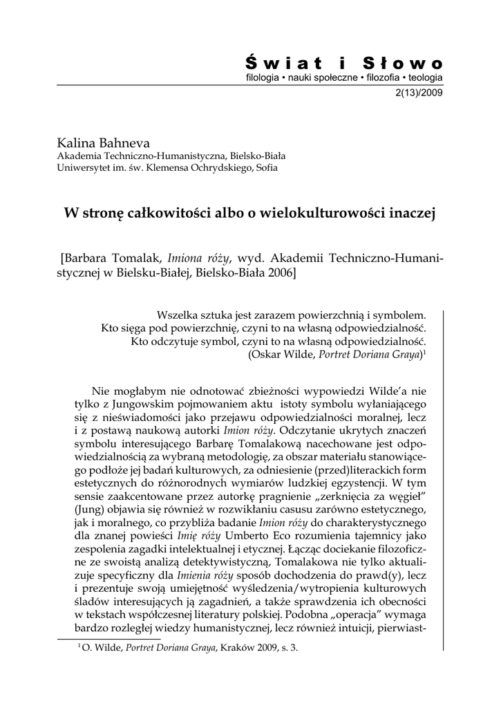 Świat i Słowo filologia • nauki społeczne • filozofia • teologia 2(13)/2009 Kalina Bahneva Akademia Techniczno-Humanistyczna, Bielsko-Biała Uniwersytet im. św. Klemensa Ochrydskiego, Sofia W stronę całkowitości albo o wielokulturowości inaczej [Barbara Tomalak, Imiona róży, wyd. Akademii Techniczno-Humanistycznej w Bielsku-Białej, Bielsko-Biała 2006] Wszelka sztuka jest zarazem powierzchnią i symbolem. Kto sięga pod powierzchnię, czyni to na własną odpowiedzialność. Kto odczytuje symbol, czyni to na własną odpowiedzialność. (Oskar Wilde, Portret Doriana Graya)1 Nie mogłabym nie odnotować zbieżności wypowiedzi Wilde’a nie tylko z Jungowskim pojmowaniem aktu istoty symbolu wyłaniającego się z nieświadomości jako przejawu odpowiedzialności moralnej, lecz i z postawą naukową autorki Imion róży. Odczytanie ukrytych znaczeń symbolu interesującego Barbarę Tomalakową nacechowane jest odpowiedzialnością za wybraną metodologię, za obszar materiału stanowiącego podłoże jej badań kulturowych, za odniesienie (przed)literackich form estetycznych do różnorodnych wymiarów ludzkiej egzystencji. W tym sensie zaakcentowane przez autorkę pragnienie „zerknięcia za węgieł” (Jung) objawia się również w rozwikłaniu casusu zarówno estetycznego, jak i moralnego, co przybliża badanie Imion róży do charakterystycznego dla znanej powieści Imię róży Umberto Eco rozumienia tajemnicy jako zespolenia zagadki intelektualnej i etycznej. Łącząc dociekanie filozoficzne ze swoistą analizą detektywistyczną, Tomalakowa nie tylko aktualizuje specyficzny dla Imienia róży sposób dochodzenia do prawd(y), lecz i prezentuje swoją umiejętność wyśledzenia/wytropienia kulturowych śladów interesujących ją zagadnień, a także sprawdzenia ich obecności w tekstach współczesnej literatury polskiej. Podobna „operacja” wymaga bardzo rozległej wiedzy humanistycznej, lecz również intuicji, pierwiast1 O. Wilde, Portret Doriana Graya, Kraków 2009, s. 3. Materiały, komentarze, recenzje 242 ka irracjonalnego, bez zastosowania którego poznanie (w tym i poznanie potrzebne do rozwikłania casusu kryminalnego), oparte wyłącznie na logice, nie byłoby całościowe i pełne. W książce Eco całość jest jednym z kluczowych wyznaczników prawdy. Dla Wilhelma dostąpienie tajemnicy manuskryptu nieodzownie przychodzi przez wiedzę „czy są jakoweś strony i czy jest całość”2. Co więcej, całość („przede wszystkim niepodzielność lub doskonałość”) na równi z „należytą proporcją albo też harmonią” oraz w połączeniu z jasnością i światłem przeistacza istotę piękna „(…) i dlatego za brzydkie mamy rzeczy nie będące całością”3. Wybranie przez Barbarę Tomalakową jak najbardziej całościowego ujęcia problematyzowanych zjawisk to swoiste wskrzeszenie śladów obecnej w powieści Eco myśli estetycznej starożytności (pitagorejczycy, Plotyn) oraz średniowiecza (Augustyn Aureliusz, Pseudo-Dionizy Areopagita, Tomasz z Akwinu), rozważającej istotę doskonałości. Ale nie tylko te „klasyczne” koncepcje całkowitości interesują autorkę Imion róży, która doszukuje się jeszcze innego wymiaru tego pojęcia. Sens całkowitości nurtujący badaczkę, to ten, który związany jest z niepodzielną jednością treści świadomych i nieświadomych, to Jaźń Junga, zwracająca naszą uwagę na często tłumioną przez nas lub ujmowaną w wymiarach „tabu” irracjonalność ludzkiej psychiki. W dzisiejszym świecie, boleśnie nastawionym na prosperity profesjonalne oraz społeczne, a także na wskroś przenikniętym chorobliwym (bo doprowadzającym do depresji) praktycyzmem, nakazującym redukowanie głosu nieświadomości, przypomnienie także etycznego wymiaru Jungowskiej koncepcji Jaźni okazuje się poczynaniem niezwykle istotnym. Tak opiewany przez oświecenie (i nie tylko) rozum ludzki zawodzi. Udowadnia to nie tylko Maria Janion (Powstrzymać Prometeusza), lecz także esej Józefa Tischnera Rozum poszukuje siebie, który aktualizuje tragiczne dla człowieczeństwa „stwory” ludzkiej rozumności. W tym sensie aktualizacja pojęcia Jaźni jako „wartości nadrzędnej w stosunku do świadomości” – to możliwość powrotu do idei Całkowitości, której nierozłączną częścią jest właśnie nieświadomość. „Jaźń jest nie tylko centrum, lecz także obwodem okalającym świadomość i nieświadomość”4. Jeśli dla specjalisty w dziedzinie nauk humanistycznych wiedza ta jest dość oczywista i tym samym przypomnienie w niniejszej recenzji kluczowych pojęć psychologii analitycznej wydaje się zbędnym, to dla innych odbiorców (dla których również jest przeznaczona książka B. Tomalakowej) wyodrębnione przez autorkę Imion róży terminy Junga mogą być niezmiernie pożyteczne. Wykształcenie humanistyczne oraz obyczajowe wciąż dystansuje się od poznania nieświadomości, postrzegając ją jako fikcję (Frye, Wheelwright), zakazaną lub U. Eco, Imię róży, tłum. A. Szymanowski, Warszawa 2002, s. 78. Tamże, s. 86. 4 C. G. Jung, Wspomnienia, sny, myśli, Warszawa 1993, s. 230. Cyt. za: B. Tomalak, Imiona róży, Bielsko-Biała 2006, s. 111. 2 3 Kalina Bahneva, W stronę całkowitości albo o wielokulturowości inaczej niepożądaną w kształtowaniu światopoglądu. Konsekwencje podobnego uformowania indywidualności ludzkiej, skoncentrowanej wyłącznie na racjonalności, są znane. Wyłączenie nieświadomości, które niejedno ma imię (i które przejawia się także w błędnym określeniu nieświadomości jako podświadomości – kurs. K.B.) z całkowitości człowieka prowadzi do zaburzeń psychicznych, deformacji moralnych, dewiacji społecznych. Oto dlaczego co najmniej uwrażliwienie młodych czytelników (i nie tylko) na odczytanie wpisanych w symbole (także i archetypiczne) treści psychicznych, w tym i tych odnoszących się do sfery naszej nieświado