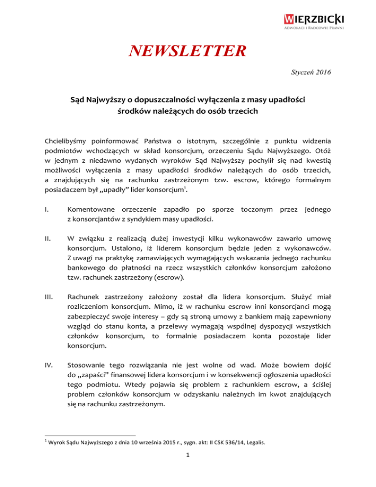 NEWSLETTER Styczeń 2016 Sąd Najwyższy o dopuszczalności wyłączenia z masy upadłości środków należących do osób trzecich Chcielibyśmy poinformować Państwa o istotnym, szczególnie z punktu widzenia podmiotów wchodzących w skład konsorcjum, orzeczeniu Sądu Najwyższego. Otóż w jednym z niedawno wydanych wyroków Sąd Najwyższy pochylił się nad kwestią możliwości wyłączenia z masy upadłości środków należących do osób trzecich, a znajdujących się na rachunku zastrzeżonym tzw. escrow, którego formalnym posiadaczem był „upadły” lider konsorcjum1. I. Komentowane orzeczenie zapadło po sporze toczonym przez jednego z konsorcjantów z syndykiem masy upadłości. II. W związku z realizacją dużej inwestycji kilku wykonawców zawarło umowę konsorcjum. Ustalono, iż liderem konsorcjum będzie jeden z wykonawców. Z uwagi na praktykę zamawiających wymagających wskazania jednego rachunku bankowego do płatności na rzecz wszystkich członków konsorcjum założono tzw. rachunek zastrzeżony (escrow). III. Rachunek zastrzeżony założony został dla lidera konsorcjum. Służyć miał rozliczeniom konsorcjum. Mimo, iż w rachunku escrow inni konsorcjanci mogą zabezpieczyć swoje interesy – gdy są stroną umowy z bankiem mają zapewniony wzgląd do stanu konta, a przelewy wymagają wspólnej dyspozycji wszystkich członków konsorcjum, to formalnie posiadaczem konta pozostaje lider konsorcjum. IV. Stosowanie tego rozwiązania nie jest wolne od wad. Może bowiem dojść do „zapaści” finansowej lidera konsorcjum i w konsekwencji ogłoszenia upadłości tego podmiotu. Wtedy pojawia się problem z rachunkiem escrow, a ściślej problem członków konsorcjum w odzyskaniu należnych im kwot znajdujących się na rachunku zastrzeżonym. 1 Wyrok Sądu Najwyższego z dnia 10 września 2015 r., sygn. akt: II CSK 536/14, Legalis. 1 V. Często przyjmuje się bowiem, iż skoro formalnie konto bankowe należy do upadłego lidera konsorcjum to do niego należą też środki zgromadzone na tym rachunku, a obowiązek rozliczenia się z tych kwot stanowi jeden z długów upadłego podlegających zaspokojeniu w prowadzonym postępowaniu upadłościowym. VI. Z powyższym związane są negatywne konsekwencje dla pozostałych członków konsorcjum. Będą oni traktowani bowiem jako zwykli wierzyciele upadłego, a w konsekwencji zazwyczaj otrzymają jedynie część należnego im wynagrodzenia (albo nawet w ogóle). Środki zgromadzone na rachunku zastrzeżonym posłużą do spłat wszystkich wierzycieli upadłego. VII. Na gruncie zaistniałej sprawy członek konsorcjum złożył do sędziego komisarza prowadzącego postępowanie upadłościowe wniosek o wyłączenie z masy upadłości środków znajdujących się na rachunku escrow, a przynależnych konsorcjantowi. Z uwagi na oddalenie wniosku konsorcjant wniósł pozew. VIII. Zgodnie bowiem z art. 70 Prawa upadłościowego istnieje możliwość wyłączenia z masy upadłości składników mienia, jeżeli nie należą one do majątku upadłego. IX. W wydanym orzeczeniu Sad Najwyższy wskazał, iż istnieje możliwość wyłączenia z masy upadłości środków należących do członków konsorcjum, a znajdujących się na rachunku zastrzeżonym należącym do upadłego. X. Sąd zaznaczył, że ocena prawna żądania do wyłączenia z masy upadłości środków pieniężnych i wydania ich innej osobie, powinna się opierać na tytułach prawnych przewidzianych w kodeksie cywilnym, na treści zawartej umowy i uzupełniających ją przepisach kodeksu cywilnego. Także gotówka należna innej osobie, która wpłynęła na rachunek bankowy może być wydana tej osobie, jeżeli pozostaje w masie upadłości i możliwe jest wydzielenie jej z tej masy. XI. A zatem, możliwość wyłączenia któregokolwiek ze składników masy upadłości zachodzi, w razie wykazania, że: a) składnik ten nie należał do upadłego oraz b) osoba, na rzecz której ma nastąpić wyłączenie, miała do tego składnika prawo, które może wynikać z prawa rzeczowego albo ze stosunków zobowiązaniowych. XII. Członek konsorcjum będzie musiał wykazać więc, iż dana kwota znajdująca się na rachunku zastrzeżonym przynależy jemu, a nie upadłemu liderowi konsorcjum. Ponadto istotne będzie wykazanie możliwości wydzielenia tej kwoty z masy upadłości (konieczne ustalenie, które wpłaty na konto przypadały konsorcjantowi i które wypływy go obciążały). 2 XIII. Komentowany wyrok będzie miał ogromne znaczenie praktyczne. Wpłynie na „komfort” członków konsorcjów, którzy nie będą już musieli się obawiać, iż w przypadku upadłości lidera konsorcjum kwoty zgromadzony na rachunku escrow wejdą w skład masy upadłości bez możliwości ich wydzielenia. ***** 3