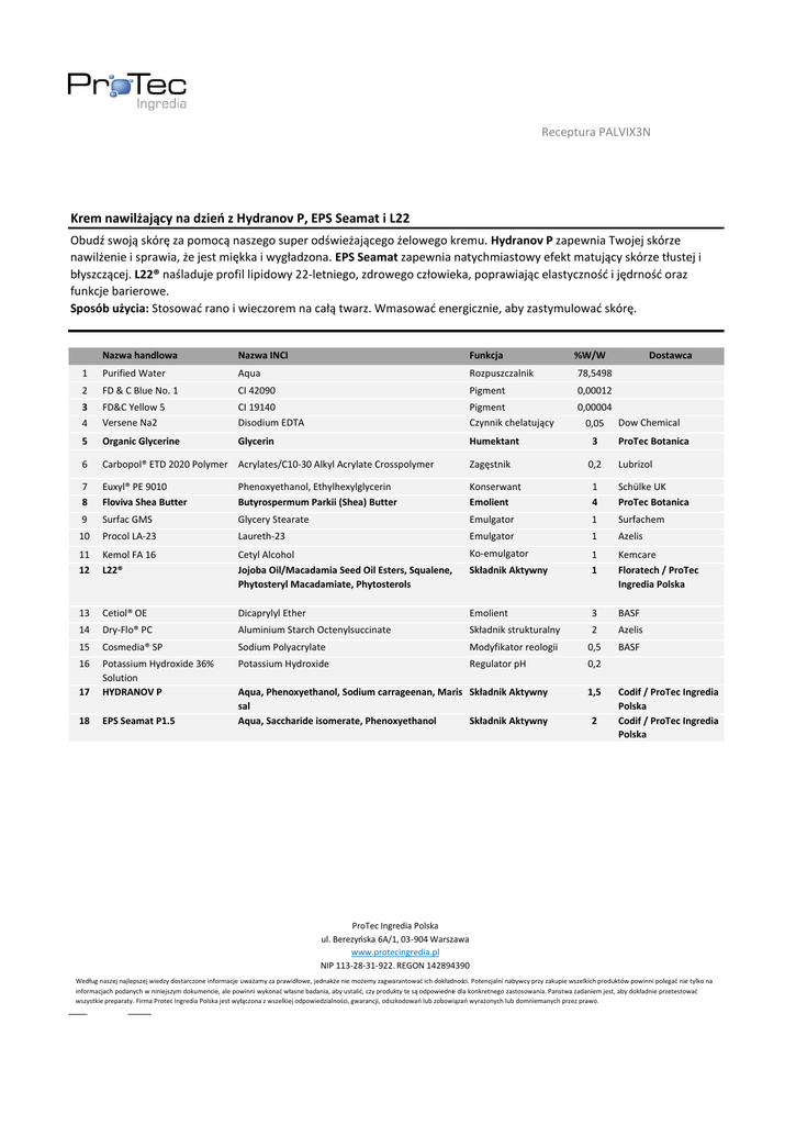 Receptura PALVIX3N Krem nawilżający na dzień z Hydranov P, EPS Seamat i L22 Obudź swoją skórę za pomocą naszego super odświeżającego żelowego kremu. Hydranov P zapewnia Twojej skórze nawilżenie i sprawia, że jest miękka i wygładzona. EPS Seamat zapewnia natychmiastowy efekt matujący skórze tłustej i błyszczącej. L22® naśladuje profil lipidowy 22-letniego, zdrowego człowieka, poprawiając elastyczność i jędrność oraz funkcje barierowe. Sposób użycia: Stosować rano i wieczorem na całą twarz. Wmasować energicznie, aby zastymulować skórę. Nazwa handlowa Nazwa INCI Funkcja 1 Purified Water Aqua Rozpuszczalnik %W/W 78,5498 2 FD & C Blue No. 1 CI 42090 Pigment 0,00012 3 4 FD&C Yellow 5 Versene Na2 CI 19140 Disodium EDTA Pigment Czynnik chelatujący 0,00004 0,05 Dow Chemical 5 Organic Glycerine Glycerin Humektant 6 Carbopol® ETD 2020 Polymer Acrylates/C10-30 Alkyl Acrylate Crosspolymer Zagęstnik 7 8 Euxyl® PE 9010 Floviva Shea Butter Phenoxyethanol, Ethylhexylglycerin Butyrospermum Parkii (Shea) Butter Konserwant Emolient 1 4 Schülke UK ProTec Botanica 9 3 0,2 Dostawca ProTec Botanica Lubrizol Surfac GMS Glycery Stearate Emulgator 1 Surfachem 10 Procol LA-23 Laureth-23 Emulgator 1 Azelis 11 12 Kemol FA 16 L22® Cetyl Alcohol Jojoba Oil/Macadamia Seed Oil Esters, Squalene, Phytosteryl Macadamiate, Phytosterols Ko-emulgator Składnik Aktywny 1 1 Kemcare Floratech / ProTec Ingredia Polska 13 Cetiol® OE Dicaprylyl Ether Emolient 3 BASF 14 Dry-Flo® PC Aluminium Starch Octenylsuccinate Składnik strukturalny 2 Azelis 15 Cosmedia® SP Sodium Polyacrylate Modyfikator reologii 0,5 BASF 16 Potassium Hydroxide Regulator pH 0,2 17 Potassium Hydroxide 36% Solution HYDRANOV P 18 EPS Seamat P1.5 Aqua, Phenoxyethanol, Sodium carrageenan, Maris Składnik Aktywny sal Aqua, Saccharide isomerate, Phenoxyethanol Składnik Aktywny 1,5 2 Codif / ProTec Ingredia Polska Codif / ProTec Ingredia Polska ProTec Ingredia Polska ul. Berezyńska 6A/1, 03-904 Warszawa www.protecingredia.pl NIP 113-28-31-922, REGON 142894390 Według naszej najlepszej wiedzy dostarczone informacje uważamy za prawidłowe, jednakże nie możemy zagwarantować ich dokładności. Potencjalni nabywcy przy zakupie wszelkich produktów powinni polegać nie tylko na informacjach podanych w niniejszym dokumencie, ale powinni wykonać własne badania, aby ustalić, czy produkty te są odpowiednie dla konkretnego zastosowania. Panstwa zadaniem jest, aby dokładnie przetestować wszystkie preparaty. Firma Protec Ingredia Polska jest wyłączona z wszelkiej odpowiedzialności, gwarancji, odszkodowań lub zobowiązań wyrażonych lub domniemanych przez prawo. Sposób wykonania Do głównej kolby dodać: Purified Water Rozpocząć mieszanie ze średnią prędkością FD & C Blue No. 1 Rozpocząć mieszanie ze średnią prędkością FD&C Yellow 5 Mieszać do rozpuszczenia Disodium EDTA Mieszać do rozpuszczenia Glycerin Mieszać do zdyspergowania Carbopol® ETD 2020 Polymer Zwiększyć szybkość mieszania Mieszać aż polimer ulegnie zwilżeniu. Euxyl® PE 9010 Mieszać do zdyspergowania Podgrzać do temperatury 70 - 75C. W mniejszej kolbie przygotować mieszaninę: Floviva Shea Butter Glycery Stearate Laureth-23 Cetyl Alcohol L22® Dicapryl Ether Podgrzać mieszaninę do 75C Kiedy wszystkie woski ulegną stopieniu, do mniejszej kolby dodać: Dry-Flo® PC Mieszać do uzyskania homogenicznej mieszaniny i nie pozostaną żadne bryłki Utrzymać 75C Cosmedia® SP Mieszać do uzyskania homogenicznej mieszaniny i nie pozostaną żadne bryłki Utrzymać 75C Kiedy obie kolby osiągną temperaturę 75C, dodać zawartość mniejszej kolby do kolby głównej. Homogenizować przez 5 minut. Do kolby głównej dodać: Potassium Hydroxide Homogenizować jeszcze przez minutę Wyłączyć homogenizator, rozpocząć mieszanie mieszadłem łopatowym lub ramowym z małą szybkością. Chłodzić do 23C. Kiedy temperatura będzie okóło 35 C lub niżej, do kolby głównej dodać: HYDRANOV P Mieszać do całkowitego zdyspergowania EPS SEAMAT P1.5 Mieszać do całkowitego zdyspergowania Schłodzić do 23C i sprawdzić zgodność ze specyfikacją. Specyfikacja produktu pH 5.50 - 6.30 Lepkość 100,000-140,000cps LVT, TBAR D, Szybkość 2.5, 1 minuta Kolor Zielony Wygląd Mobilny żel-krem ProTec Ingredia Polska ul. Berezyńska 6A/1, 03-904 Warszawa www.protecingredia.pl NIP 113-28-31-922, REGON 142894390 Według naszej najlepszej wiedzy dostarczone informacje uważamy za prawidłowe, jednakże nie możemy zagwarantować ich dokładności. Potencjalni nabywcy przy zakupie wszelkich produktów powinni polegać nie tylko na informacjach podanych w niniejszym dokumencie, ale powinni wykonać własne badania, aby ustalić, czy produkty te są odpowiednie dla konkretnego zastosowania. Panstwa zadaniem jest, aby dokładnie przetestować wszystkie preparaty. Firma Protec Ingredia Polska jest wyłączona z wszelkiej odpowiedzialności, gwarancji, odszkodowań lub zobowiązań wyrażonych lub domniemanych przez prawo.