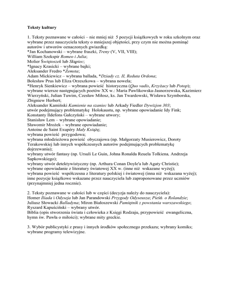Teksty kultury 1. Teksty poznawane w całości – nie mniej niż 5 pozycji książkowych w roku szkolnym oraz wybrane przez nauczyciela teksty o mniejszej objętości, przy czym nie można pominąć autorów i utworów oznaczonych gwiazdką: *Jan Kochanowski – wybrane fraszki, Treny (V, VII, VIII); William Szekspir Romeo i Julia; Molier Świętoszek lub Skąpiec; *Ignacy Krasicki – wybrane bajki; Aleksander Fredro *Zemsta; Adam Mickiewicz – wybrana ballada, *Dziady cz. II, Reduta Ordona; Bolesław Prus lub Eliza Orzeszkowa – wybrana nowela; *Henryk Sienkiewicz – wybrana powieść historyczna (Quo vadis, Krzyżacy lub Potop); wybrane wiersze następujących poetów XX w.: Maria Pawlikowska-Jasnorzewska, Kazimierz Wierzyński, Julian Tuwim, Czesław Miłosz, ks. Jan Twardowski, Wisława Szymborska, Zbigniew Herbert; Aleksander Kamiński Kamienie na szaniec lub Arkady Fiedler Dywizjon 303; utwór podejmujący problematykę Holokaustu, np. wybrane opowiadanie Idy Fink; Konstanty Ildefons Gałczyński – wybrane utwory; Stanisław Lem – wybrane opowiadanie; Sławomir Mrożek – wybrane opowiadanie; Antoine de Saint Exupéry Mały Książę; wybrana powieść przygodowa; wybrana młodzieżowa powieść obyczajowa (np. Małgorzaty Musierowicz, Doroty Terakowskiej lub innych współczesnych autorów podejmujących problematykę dojrzewania); wybrany utwór fantasy (np. Ursuli Le Guin, Johna Ronalda Reuela Tolkiena, Andrzeja Sapkowskiego); wybrany utwór detektywistyczny (np. Arthura Conan Doyle'a lub Agaty Christie); wybrane opowiadanie z literatury światowej XX w. (inne niż wskazane wyżej); wybrana powieść współczesna z literatury polskiej i światowej (inna niż wskazana wyżej); inne pozycje książkowe wskazane przez nauczyciela lub zaproponowane przez uczniów (przynajmniej jedna rocznie). 2. Teksty poznawane w całości lub w części (decyzja należy do nauczyciela): Homer Iliada i Odyseja lub Jan Parandowski Przygody Odyseusza; Pieśń o Rolandzie; Juliusz Słowacki Balladyna; Miron Białoszewski Pamiętnik z powstania warszawskiego; Ryszard Kapuściński – wybrany utwór. Biblia (opis stworzenia świata i człowieka z Księgi Rodzaju, przypowieść ewangeliczna, hymn św. Pawła o miłości); wybrane mity greckie. 3. Wybór publicystyki z prasy i innych środków społecznego przekazu; wybrany komiks; wybrane programy telewizyjne.