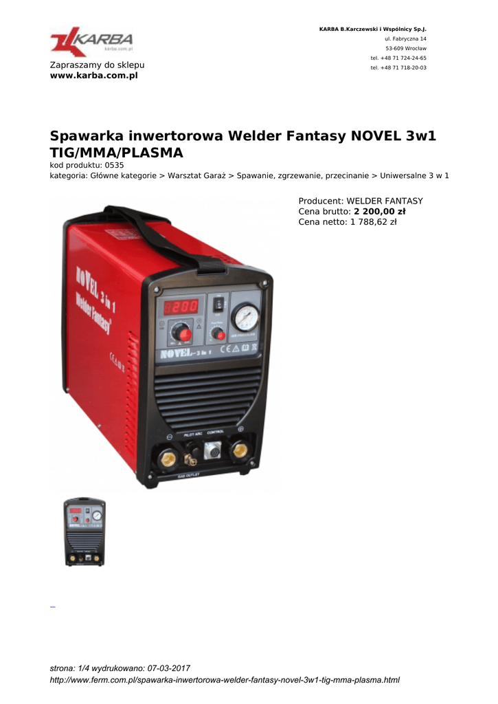 KARBA B.Karczewski i Wspólnicy Sp.J. ul. Fabryczna 14 53-609 Wrocław Zapraszamy do sklepu www.karba.com.pl tel. +48 71 724-24-65 tel. +48 71 718-20-03 Spawarka inwertorowa Welder Fantasy NOVEL 3w1 TIG/MMA/PLASMA kod produktu: 0535 kategoria: Główne kategorie > Warsztat Garaż > Spawanie, zgrzewanie, przecinanie > Uniwersalne 3 w 1 Producent: WELDER FANTASY Cena brutto: 2 200,00 zł Cena netto: 1 788,62 zł strona: 1/4 wydrukowano: 07-03-2017 http://www.ferm.com.pl/spawarka-inwertorowa-welder-fantasy-novel-3w1-tig-mma-plasma.html strona: 2/4 wydrukowano: 07-03-2017 http://www.ferm.com.pl/spawarka-inwertorowa-welder-fantasy-novel-3w1-tig-mma-plasma.html Opis: Spawarka serii Welder Fantasy NOVEL 3w1 jest zintegrowanym multifunkcyjnym urządzeniem spawalniczym umożliwiającym spawanie metodą TIG DC i MMA oraz ręczne cięcie plazmowe z mocą 50A. Jego wszechstronność oraz jakość wykonania pozwalają na szeroki zakres zastosowań zarówno w małych warsztatach ślusarsko-spawalniczych jak i przy profesjonalnych pracach konstrukcyjno-montażowych. Przejrzysty panel sterujący pozwala na wybór optymalnych parametrów pracy zarówno dla początkujących jak i doświadczonych spawaczy. NOVEL 3w1 to urządzenie dla użytkowników szukających możliwości wielu zastosowań i niewielkich gabarytów połączonych z atrakcyjną ceną. Zestaw zawiera uchwyty TIG, masowy, elektrodowy, plazmy oraz komplet części eksploatacyjnych wraz z filtroreduktorem.Urządzenie wyposażone jest we wtyczkę przemysłową 230V 32A. DANE TECHNICZNE: Napięcie zasilania [V] 230 Zakres prądu MMA [A] 10-200 Zakres prądu TIG [A] 10-200 Zakres prądu cięcia plazmy [A] 20-50 Sprawność [%] 60 Waga [kg] 13 strona: 3/4 wydrukowano: 07-03-2017 http://www.ferm.com.pl/spawarka-inwertorowa-welder-fantasy-novel-3w1-tig-mma-plasma.html Wymiary [mm] 425*180*310 *Przy zakupie na Fakturę VAT gwarancja 1 rok strona: 4/4 wydrukowano: 07-03-2017 http://www.ferm.com.pl/spawarka-inwertorowa-welder-fantasy-novel-3w1-tig-mma-plasma.html