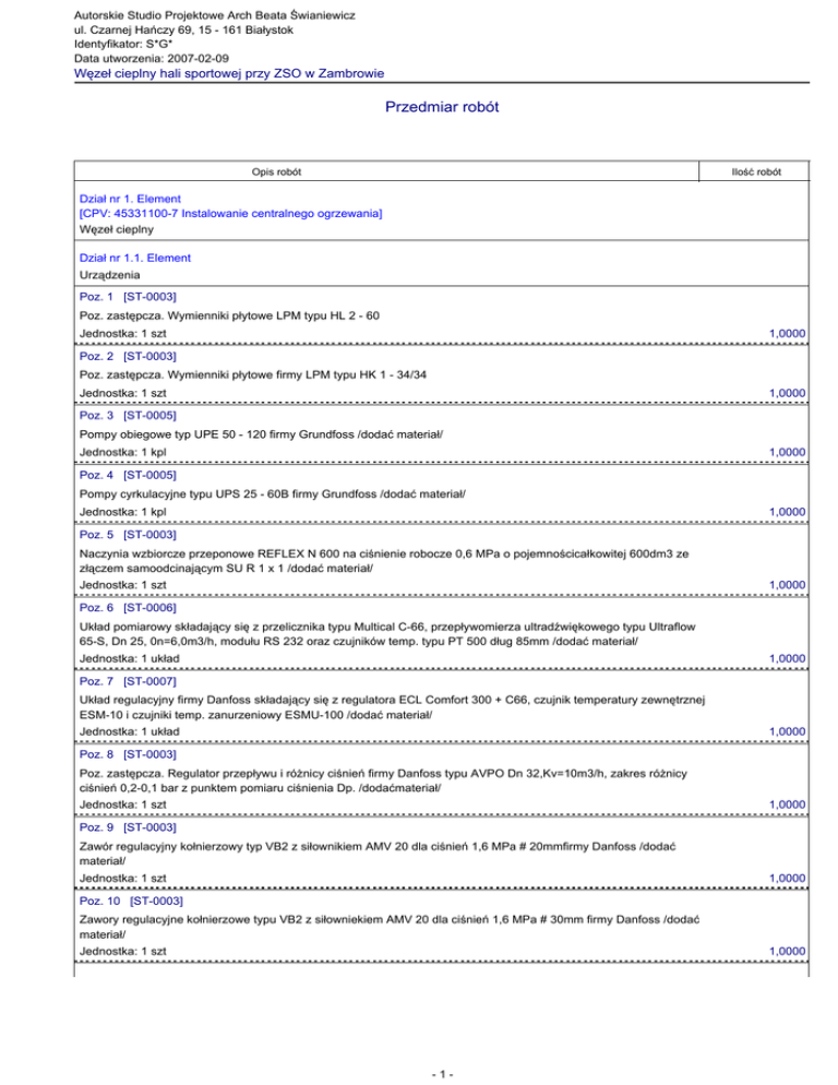Autorskie Studio Projektowe Arch Beata Świaniewicz ul. Czarnej Hańczy 69, 15 - 161 Białystok Identyfikator: S*G* Data utworzenia: 2007-02-09 Węzeł cieplny hali sportowej przy ZSO w Zambrowie Przedmiar robót Opis robót Ilość robót Dział nr 1. Element [CPV: 45331100-7 Instalowanie centralnego ogrzewania] Węzeł cieplny Dział nr 1.1. Element Urządzenia Poz. 1 [ST-0003] Poz. zastępcza. Wymienniki płytowe LPM typu HL 2 - 60 Jednostka: 1 szt 1,0000 Poz. 2 [ST-0003] Poz. zastępcza. Wymienniki płytowe firmy LPM typu HK 1 - 34/34 Jednostka: 1 szt 1,0000 Poz. 3 [ST-0005] Pompy obiegowe typ UPE 50 - 120 firmy Grundfoss /dodać materiał/ Jednostka: 1 kpl 1,0000 Poz. 4 [ST-0005] Pompy cyrkulacyjne typu UPS 25 - 60B firmy Grundfoss /dodać materiał/ Jednostka: 1 kpl 1,0000 Poz. 5 [ST-0003] Naczynia wzbiorcze przeponowe REFLEX N 600 na ciśnienie robocze 0,6 MPa o pojemnościcałkowitej 600dm3 ze złączem samoodcinającym SU R 1 x 1 /dodać materiał/ Jednostka: 1 szt 1,0000 Poz. 6 [ST-0006] Układ pomiarowy składający się z przelicznika typu Multical C-66, przepływomierza ultradźwiękowego typu Ultraflow 65-S, Dn 25, 0n=6,0m3/h, modułu RS 232 oraz czujników temp. typu PT 500 dług 85mm /dodać materiał/ Jednostka: 1 układ 1,0000 Poz. 7 [ST-0007] Układ regulacyjny firmy Danfoss składający się z regulatora ECL Comfort 300 + C66, czujnik temperatury zewnętrznej ESM-10 i czujniki temp. zanurzeniowy ESMU-100 /dodać materiał/ Jednostka: 1 układ 1,0000 Poz. 8 [ST-0003] Poz. zastępcza. Regulator przepływu i różnicy ciśnień firmy Danfoss typu AVPO Dn 32,Kv=10m3/h, zakres różnicy ciśnień 0,2-0,1 bar z punktem pomiaru ciśnienia Dp. /dodaćmateriał/ Jednostka: 1 szt 1,0000 Poz. 9 [ST-0003] Zawór regulacyjny kołnierzowy typ VB2 z siłownikiem AMV 20 dla ciśnień 1,6 MPa # 20mmfirmy Danfoss /dodać materiał/ Jednostka: 1 szt 1,0000 Poz. 10 [ST-0003] Zawory regulacyjne kołnierzowe typu VB2 z siłowniekiem AMV 20 dla ciśnień 1,6 MPa # 30mm firmy Danfoss /dodać materiał/ Jednostka: 1 szt 1,0000 -1- Opis robót Ilość robót Poz. 11 [ST-0001] Wodomierze skrzydełkowe wielostrumieniowe typu WS 120 - 1,5 NK # 15mm /dodać materiał/ Jednostka: 1 szt 1,0000 Poz. 12 [ST-0008] Przewody sygnałowe z rur stalowych # 10mm. /dodać materiał/ Jednostka: 100 m 0,2500 Poz. 13 [ST-0009] Montaż regulatora AVPO 32 Jednostka: 1 szt 1,0000 Poz. 14 [ST-0010] Montaż króćców pomiarowych termometryczny o połączeńu gwintowanym /dodać materiał/ Jednostka: 1 układ 6,0000 Poz. 15 [ST-0010] Przekucie otworów przez ściany do zamontowania czujnika ESM-10 Jednostka: 1 dm3 1,0000 Poz. 16 [ST-0003] Zawory bezpieczeństwa HANS SASSERAT typ 2115 # 25mm Jednostka: 1 szt 1,0000 Poz. 17 [ST-0003] Zawory bezpieczeństwa HANS SASSERAT typ 1915 # 25mm Jednostka: 1 szt 2,0000 Poz. 18 [ST-0003] Odmulacze stalowe siatkowo-inercyjne typ IOW. Odmulacz stalowy na rurociągu o średn.nom. 50 mm Jednostka: 1 szt 1,0000 Poz. 19 [ST-0003] Odmulacze stalowe siatkowo-inercyjne typ IOW. Odmulacz stalowy na rurociągu o średn.nom. 80 mm Jednostka: 1 szt 1,0000 Poz. 20 [ST-0003] Poz. zastępcza.Filtr siatkowy gwintowany # 25mm Jednostka: 1 szt 1,0000 Poz. 21 [ST-0003] Poz. zastępcza. Filtr siatkowy gwintowany # 15 mm Jednostka: 1 szt 1,0000 Poz. 22 [ST-0003] Poz. zastępcza. Filtr siatkowy gwintowany # 40mm Jednostka: 1 szt 1,0000 Dział nr 1.2. Element Rurociągi i armatura Poz. 23 [ST-0003] Montaż rurociągów stalowych o średn.40-300 mm. Rurociąg o średnicy nom. 40 mm, grubość ścianki 3,2 mm Jednostka: 1 m 15,0000 Poz. 24 [ST-0003] Montaż rurociągów stalowych o średn.40-300 mm. Rurociąg o średnicy nom. 50 mm, grubość ścianki 3,6 mm Jednostka: 1 m 8,0000 -2- Opis robót Ilość robót Poz. 25 [ST-0003] Montaż rurociągów stalowych o średn.40-300 mm. Rurociąg o średnicy nom. 80 mm, grubość ścianki 4,5 mm Jednostka: 1 m 6,0000 Poz. 26 [ST-0003] Rurociągi stalowe o średn. 15-32 mm, łączone przez spawanie. Rurociągi stalowe o srednicach 15-32 mm, łączone przez spawanie. Rurociąg o średnicy nom. 25 mm Jednostka: 100 m 0,0400 Poz. 27 [ST-0001] Rurociągi stalowe ocynkowane o połączeniach gwintowanych, na ścianach w budynkach niemieszkalnych. O średnicy nominalnej 40 mm Jednostka: 100 m 0,1200 Poz. 28 [ST-0001] Rurociągi stalowe ocynkowane o połączeniach gwintowanych, na ścianach w budynkach niemieszkalnych. O średnicy nominalnej 25 mm Jednostka: 100 m 0,0600 Poz. 29 [ST-0003] Rozdzielacze do kotłów instalacji c.o.. Rozdzielacz z rur o średnicy nominalnej do 100 mm Jednostka: 1 m 3,0000 Poz. 30 [ST-0012] Zawory kulowe łączone przez spawanie na ciśnienie nominalne 2.5 mPa. Średnica nominalna 80 mm Jednostka: 1 szt 2,0000 Poz. 31 [ST-0012] Zaworykulowe łączone przez spawanie na ciśnienie nominalne 2.5 mPa. Średnica nominalna 50 mm Jednostka: 1 szt 2,0000 Poz. 32 [ST-0012] Zawory kulowe łączone przez spawanie na ciśnienie nominalne 2.5 mPa. Średnica nominalna 40 mm Jednostka: 1 szt 3,0000 Poz. 33 [ST-0012] Zawory łączone przez spawanie na ciśnienie nominalne 2.5 mPa. Średnica nominalna 15mm Jednostka: 1 szt 1,0000 Poz. 34 [ST-0002] Zawory przelotowe i zwrotne o połączeniach gwintowanych. Zawór kulowy o średnicy nom.40 mm, zawór przelotowy prosty, Jednostka: 1 szt 2,0000 Poz. 35 [ST-0002] Zawory przelotowe i zwrotne o połączeniach gwintowanych. Zawórkulowy o średnicy nom.25 mm, zawór przelotowy prosty, Jednostka: 1 szt 2,0000 Poz. 36 [ST-0002] Zawory przelotowe i zwrotne o połączeniach gwintowanych. Zawór kulowy o średnicy nom.15 mm, zawór przelotowy prosty, Jednostka: 1 szt 10,0000 Poz. 37 [ST-0002] Zawory przelotowe i zwrotne o połączeniach gwintowanych. Zawór kulowy o średnicy nom.20 mm, zawór przelotowy prosty, Jednostka: 1 szt 1,0000 -3- Opis robót Ilość robót Poz. 38 [ST-0003] Zawory zwrotne, grzybkowe, z kielichami gwintowanymi, dla ciśnień 1,6 MPa. Zawór o średnicy nom. 15 mm, zawory zwrotne Jednostka: 1 szt 1,