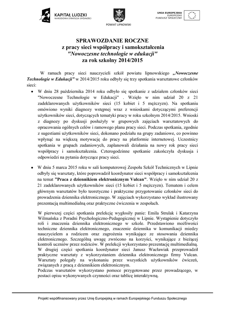 POWIAT LIPNOWSKI SPRAWOZDANIE ROCZNE z pracy sieci współpracy i samokształcenia "Nowoczesne technologie w edukacji" za rok szkolny 2014/2015 W ramach pracy sieci nauczycieli szkół powiatu lipnowskiego „Nowoczesne Technologie w Edukacji” w 2014/2015 roku odbyły się trzy spotkania warsztatowe członków sieci: W dniu 28 października 2014 roku odbyło się spotkanie z udziałem członków sieci "Nowoczesne Technologie w Edukacji" . Wzięło w nim udział 20 z 21 zadeklarowanych użytkowników sieci (15 kobiet i 5 mężczyzn). Na spotkaniu omówiono wyniki diagnozy wstępnej wraz z wnioskami dotyczącymi preferencji użytkowników sieci, dotyczących tematyki pracy w roku szkolnym 2014/2015. Wnioski z diagnozy po dyskusji posłużyły w grupowych zajęciach warsztatowych do opracowania ogólnych celów i ramowego planu pracy sieci. Podczas spotkania, zgodnie z sugestiami użytkowników sieci, dokonano podziału na grupy zadaniowe, co powinno wpłynąć na większą motywację do pracy na platformie internetowej. Uczestnicy spotkania w grupach zadaniowych, zaplanowali działania na nowy rok pracy sieci współpracy i samokształcenia. Czterogodzinne spotkanie zakończyła dyskusja i odpowiedzi na pytania dotyczące pracy sieci. W dniu 5 marca 2015 roku w sali komputerowej Zespołu Szkół Technicznych w Lipnie odbyły się warsztaty, które poprowadził koordynator sieci współpracy i samokształcenia na temat ”Praca z dziennikiem elektronicznym Vulcan". Wzięło w nim udział 20 z 21 zadeklarowanych użytkowników sieci (15 kobiet i 5 mężczyzn). Tematem i celem głównym warsztatów było teoretyczne i praktyczne przygotowanie członków sieci do prowadzenia dziennika elektronicznego. W zajęciach wykorzystano wykład ilustrowany prezentacją multimedialną oraz praktyczne ćwiczenia w zespołach. W pierwszej części spotkania prelekcję wygłosiły panie: Emila Strulak i Katarzyna Wilmańska z Poradni Psychologiczno-Pedagogicznej w Lipnie. Wystąpienie dotyczyło roli i znaczenia dziennika elektronicznego w szkole. Przedstawiono możliwości techniczne dziennika elektronicznego, znaczenie dziennika w komunikacji miedzy nauczycielem a rodzicem oraz zagrożenia wynikające ze stosowania dziennika elektronicznego. Szczególną uwagę zwrócono na korzyści, wynikające z bieżącej kontroli uczniów przez rodziców. W prelekcji wykorzystano prezentację multimedialną. W drugiej części spotkania koordynator sieci Janusz Wacławiak przeprowadził praktyczne warsztaty z wykorzystaniem dziennika elektronicznego firmy Vulcan. Warsztaty polegały na wykonaniu przez wszystkich użytkowników ćwiczeń, związanych z pracą z dziennikiem elektronicznym. Podczas warsztatów wykorzystano pomoce przygotowane przez prowadzącego, w postaci opisu wykonywanych czynności oraz tablicę interaktywną. Projekt współfinansowany przez Unię Europejską w ramach Europejskiego Funduszu Społecznego POWIAT LIPNOWSKI Ostatnim punktem spotkania była dyskusja. Głównym tematem były aspekty wykorzystania w pracy dziennika elektronicznego oraz trudności techniczne, związane z jego wdrożeniem. Czterogodzinne spotkanie zakończyło omówienie bieżących spraw dotyczących pracy sieci nauczycieli oraz dyskusja i odpowiedzi na pytania. W dniu 9 czerwca 2015 roku w sali konferencyjnej biura projektu odbyło się ostatnie spotkanie użytkowników sieci. Wzięło w nim udział 100% zadeklarowanych użytkowników sieci (16 kobiet i 5 mężczyzn). Tematem i celem głównym warsztatów było podsumowanie rocznej pracy sieci i wyciągnięcie wniosków ewaluacyjnych. Na spotkaniu rozdano zaświadczenia potwierdzające pracę w sieci współpracy i samokształcenia. Następnie dokonano podsumowania pracy sieci. Zwrócono uwagę na dwa główne tory pracy: spotkania bezpośrednie i praca na platformie doskonaleniewsieci.pl. Dokonano analizy ilościowej i jakościowej pracy na forum platformy internetowej. Następnie omówiono główne cele pracy w sieci, oraz przedstawiono sposób realizacji każdego z celów. Część celów realizowana była na spotkaniach użytkowników sieci, inne poprzez publikacje i posty na forum platformy internetowej, jeszcze inne w sposób dwutorowy: na spotkaniach i na forum platformy. Ostatnim punktem podsumowania były wnioski. Najważniejsze z nich to: - użytkownicy dzielą się wiedzą i doświadczeniem z innymi podczas bezpośrednich spotkań oraz na forum platformy doskonaleniewsieci.pl, - użytkownicy sieci wykorzystują zdobyta wiedzę i doświadczenie w pracy z dziećmi i młodzieżą. W kolejnym punkcie spotkania rozdano użytkownikom sieci ankiety ewaluacyjne z prośbą o ich wypełnienie. W dalszej części spotkania podjęto dyskusję tematu wypalenia zawodowego nauczycieli. Zagadnienie pojawiło się na prośby użytkowników, podczas dyskusji na forum platformy doskonaleniewsieci.pl. Pomiędzy spotkaniami członkowie sieci współpracowali ze sobą na platformie internetowej, wymieniając się doświadczeniem i swoimi spostrzeżeniami na wcześniej ustalone tematy zgodne z przyjętym planem pracy. Główna tematyka działań na platformie była następująca: Cel ogólny: Poznawanie nowoczesnych pomocy dydaktycznych Cele szczegółowe Charakterystyka nowoczesnych pomocy dydaktycznych do nauczania różnych przedmiotów Poznanie dydaktycznych zasad wykorzystania pomocy dydaktycznych Działania Wymiana doświadczeń na temat pomocy dydaktycznych Zamieszczanie linków do stron internetowych Projekt współfinansowany przez Unię Europejską w ramach Europejskiego Funduszu Społecznego POWIAT LIPNOWSKI Zamieszczanie materiałów pomocniczych na forum platformy internetowej Stopień i sposób realizacji Cel został zrealizowany poprzez dyskusję na forum dyskusyjnym platformy internetowej i zamieszczone materiały. Cel ogólny: Przygotowanie uczniów do egzaminów zewnętrznych Cele szczegółowe Zapoznanie z zasadami egzaminów zewnętrznych w nowej formule Zapozna